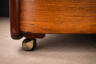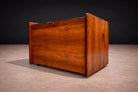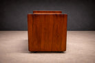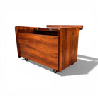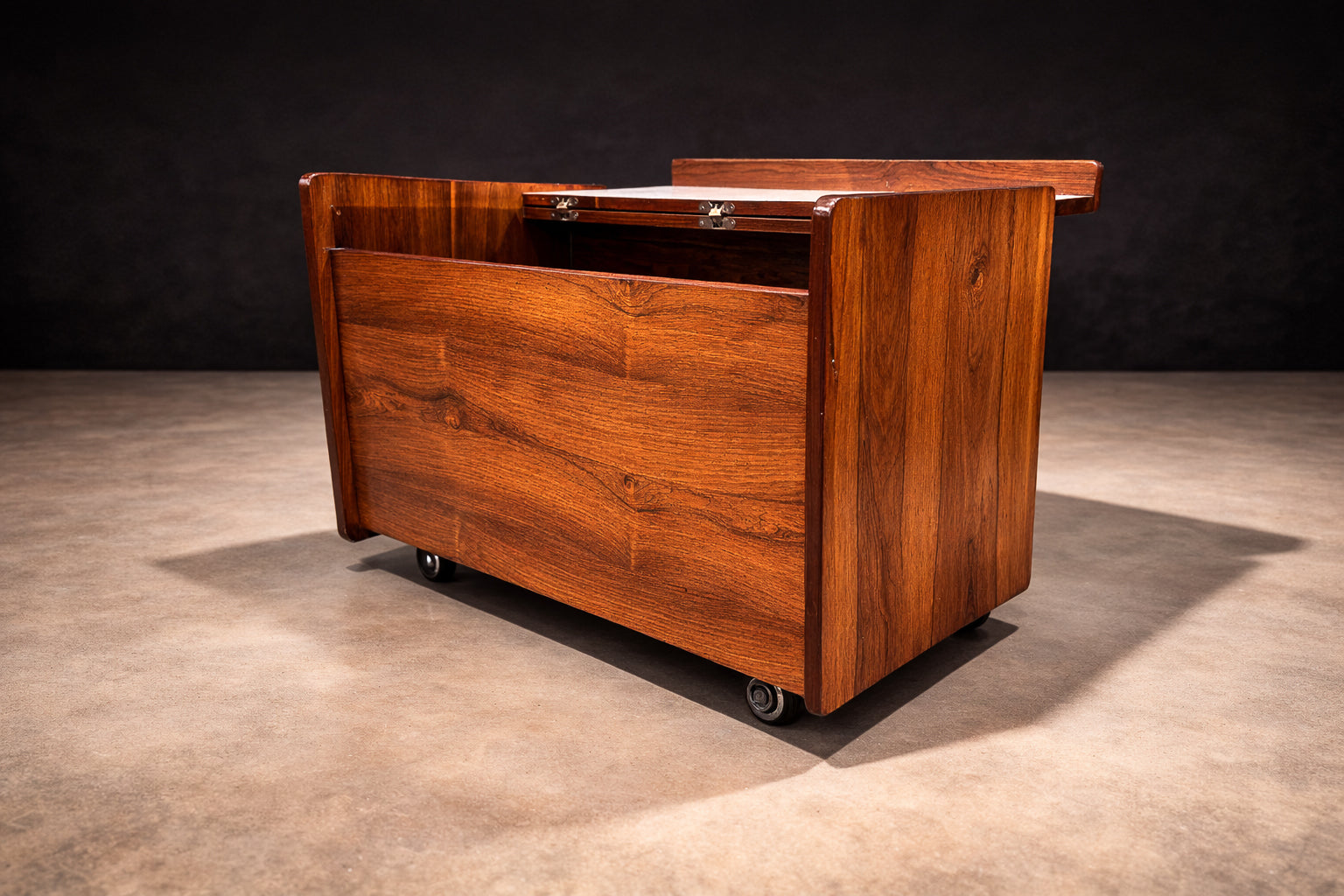 Crafted in solid jacarandá (Brazilian rosewood), this bar cart reflects the measured functionality and material refinement characteristic of Brazilian mid-century design. Its rectilinear form is defined by broad planar surfaces and softly rounded vertical edges, allowing the expressive grain of the rosewood to articulate the composition without applied ornament.