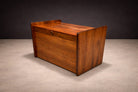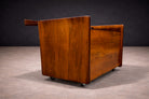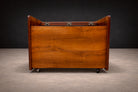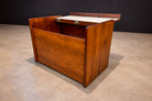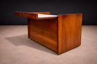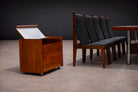 The façade presents as a continuous wooden plane, emphasizing structural clarity and visual restraint. A hinged, top-lifting panel opens to reveal a white Formica-lined interior surface—an intentional contrast that underscores the modernist dialogue between natural material and industrial finish. The integration of Formica speaks to the period’s embrace of new technologies while maintaining a commitment to craftsmanship.