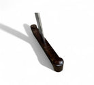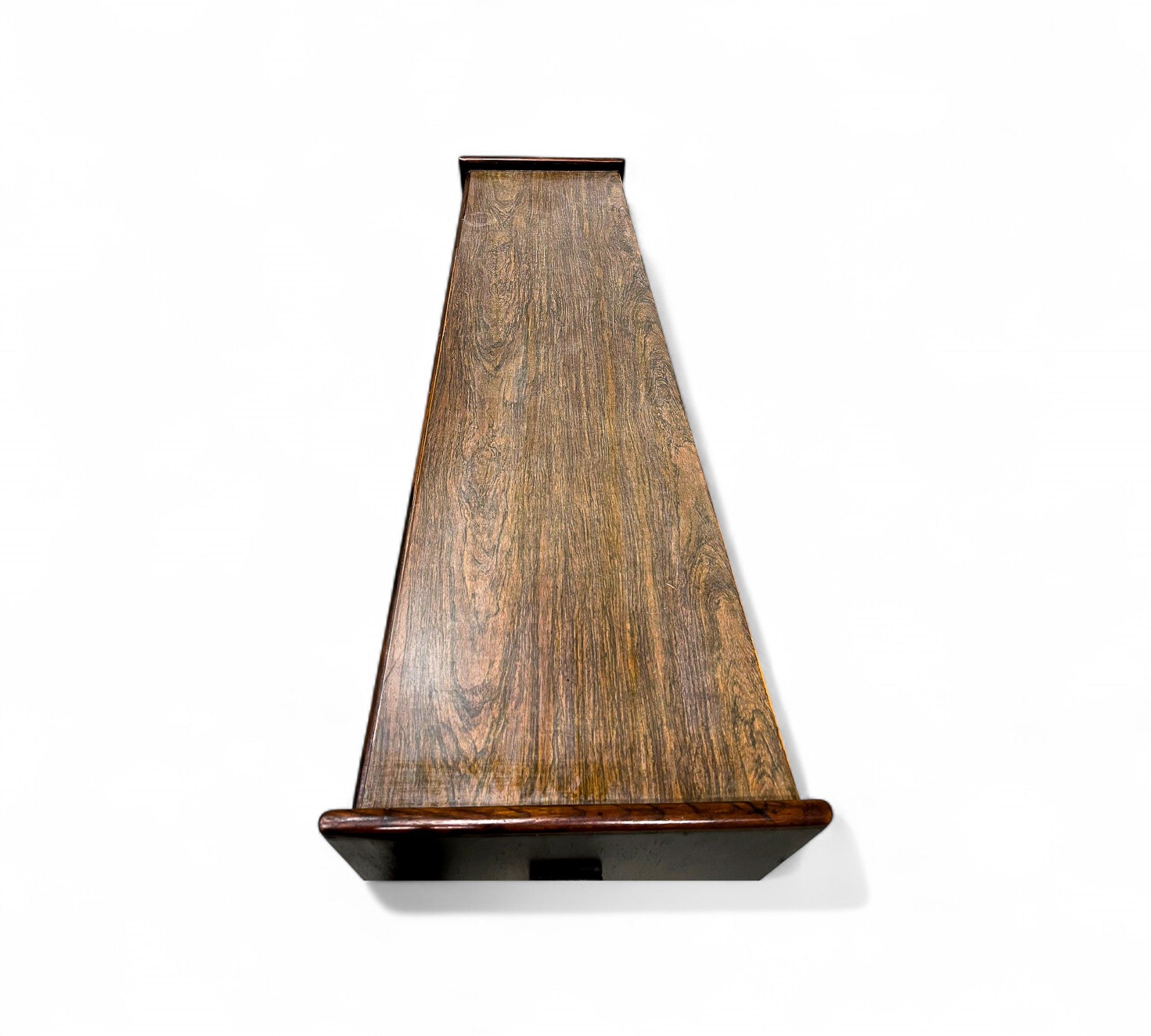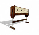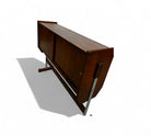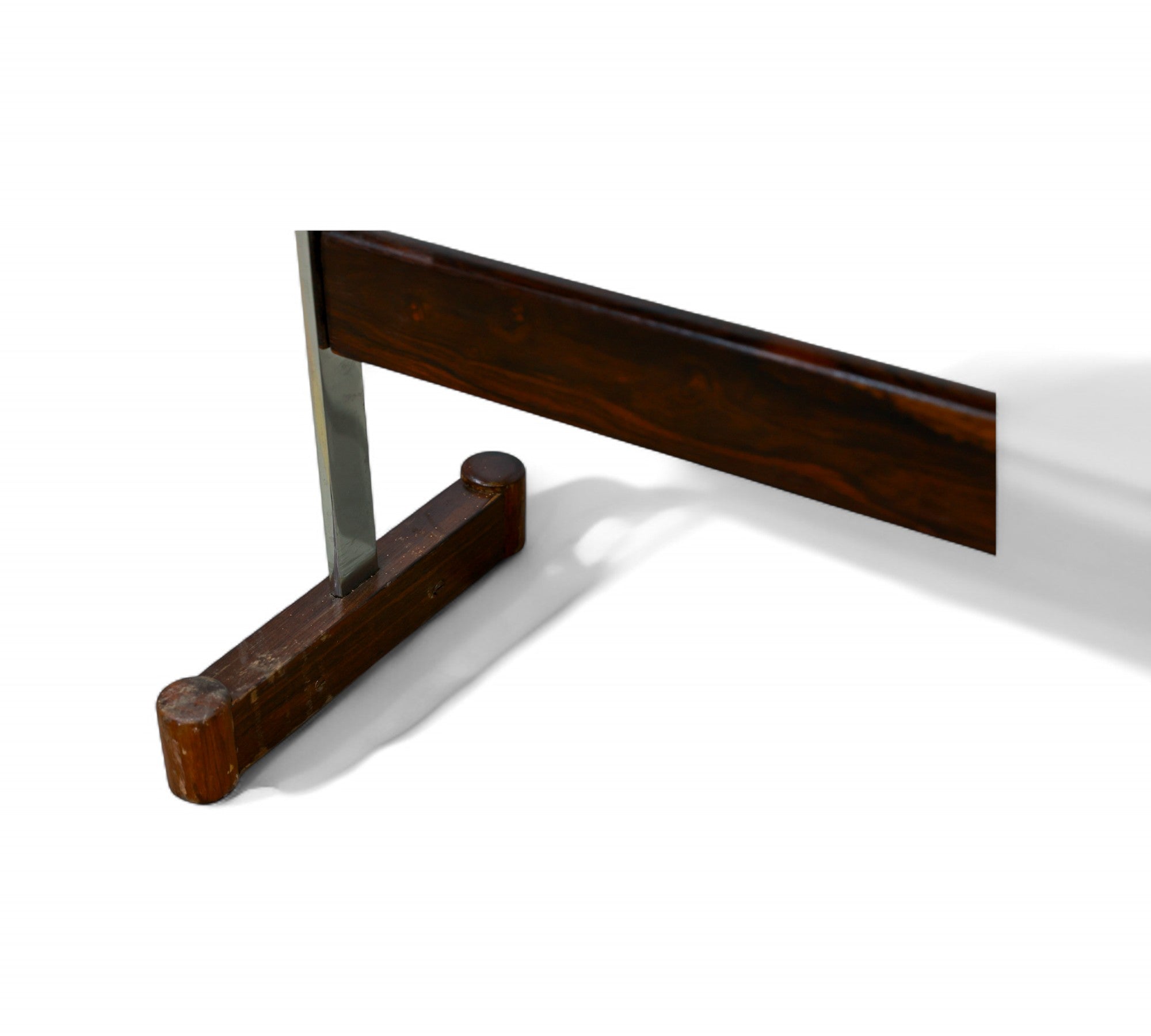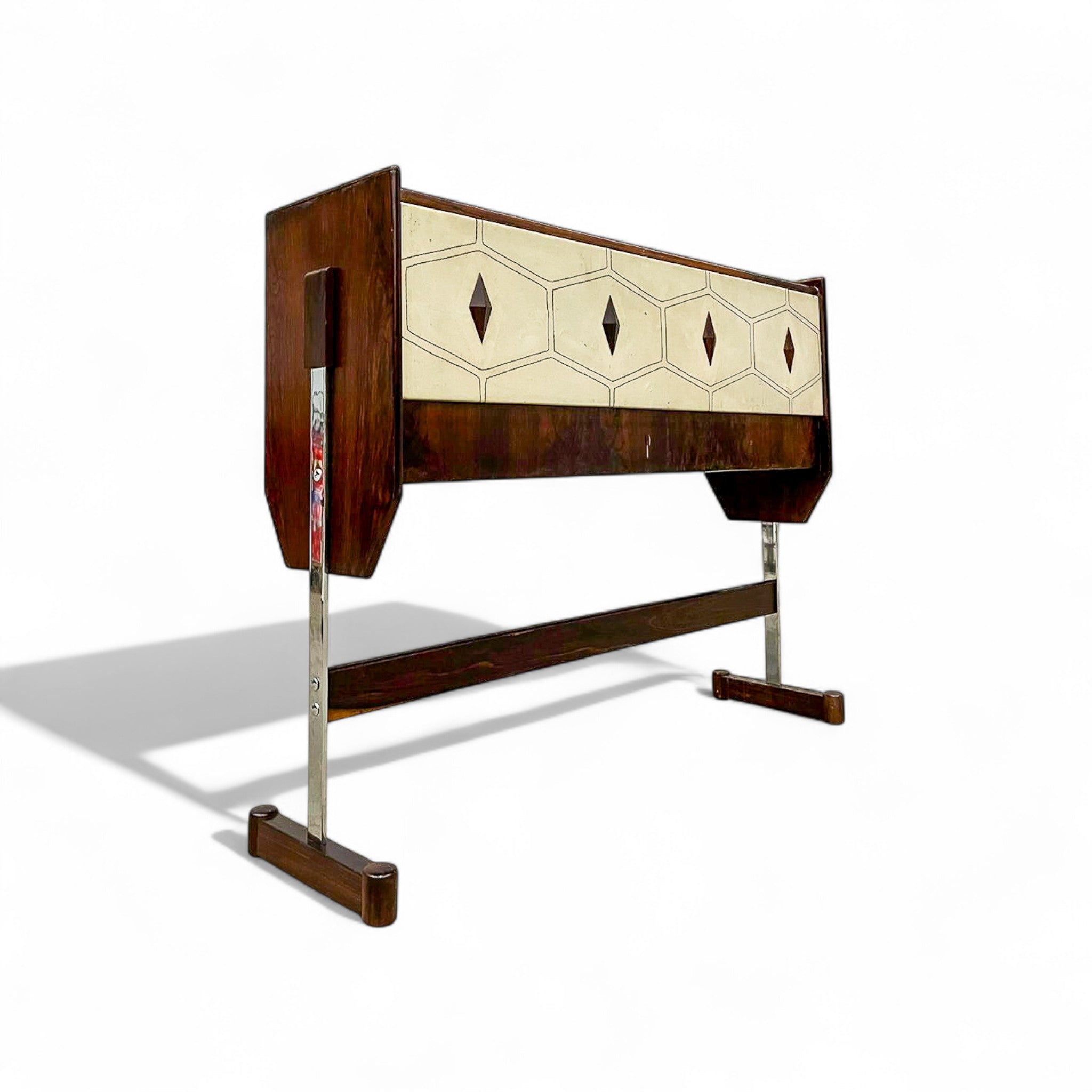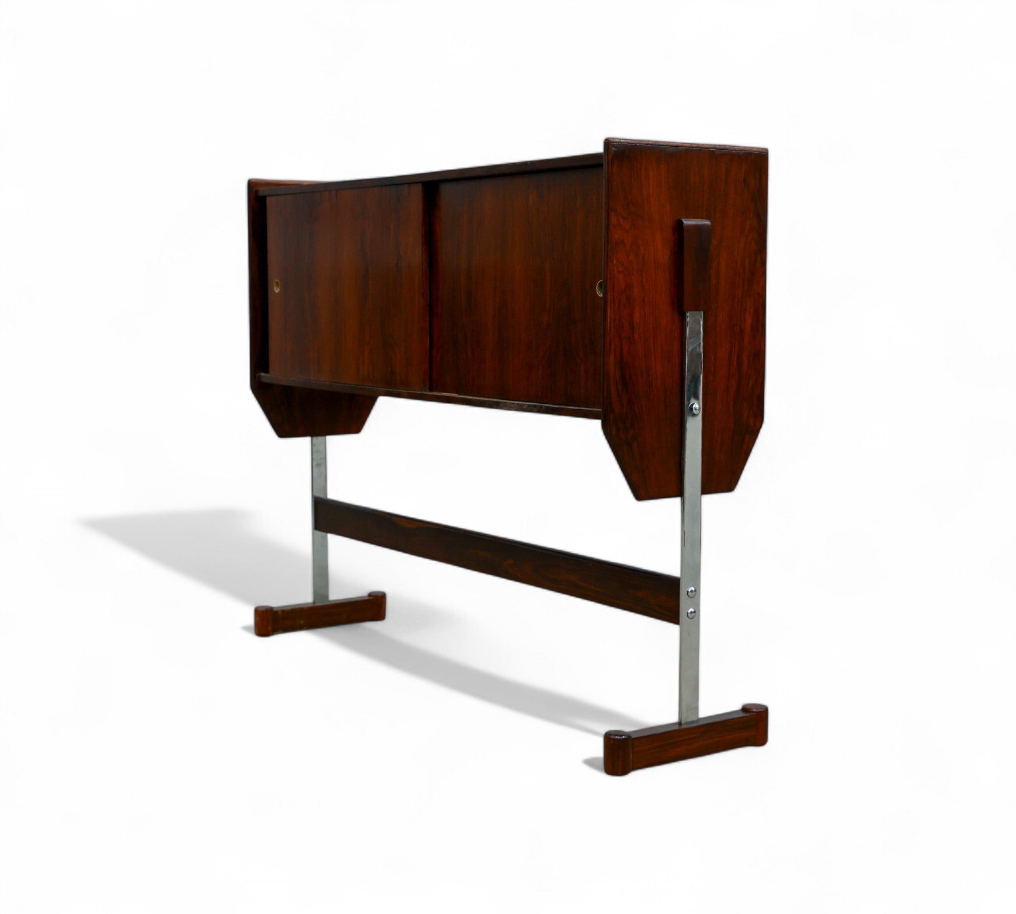 This distinguished bar, crafted by Novo Rumo in the 1960s, features a robust Brazilian Rosewood frame supported by two legs connected by a beam. The front of the bar is adorned in the original leatherette with intricate metal inlays, showcasing an Art Deco-inspired diamond design. At the rear, two sliding doors open to reveal a spacious interior for storage. The legs are a standout feature, crafted from plated metal with wooden accents, adding to the bar's sculptural appeal and unique design.