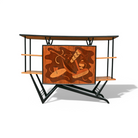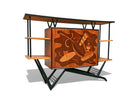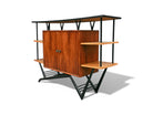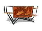 This bar is crafted from three distinct woods: Imbuia, Roxina, and Pau Marfim. It features a rectangular structure with two doors, five shelves, and four interconnected legs. The top shelf is ideal for beverage preparation, while lateral and internal shelves offer ample storage space. The front section is adorned with intricate marquetry depicting a festive motif, and the legs are elegantly designed to resemble musical notes, adding a unique artistic touch to its design.