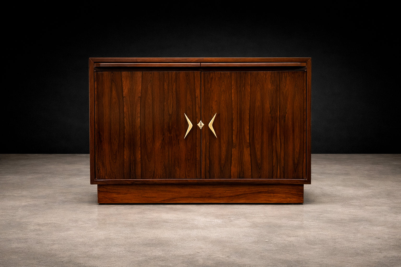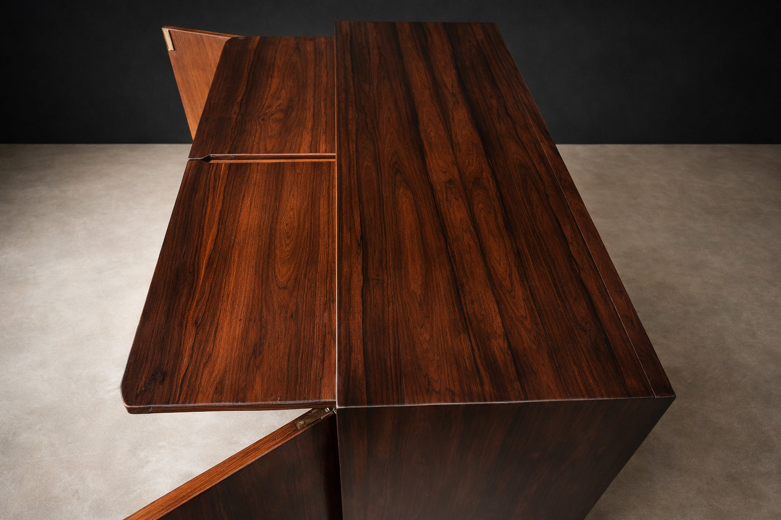 The piece rests on a recessed plinth base that reinforces its strong horizontal profile while allowing the rosewood to remain the visual focal point. Carefully refinished to highlight the wood’s natural veining and tonal variation, the surface presents a refined satin finish consistent with high-quality Brazilian mid-century craftsmanship.