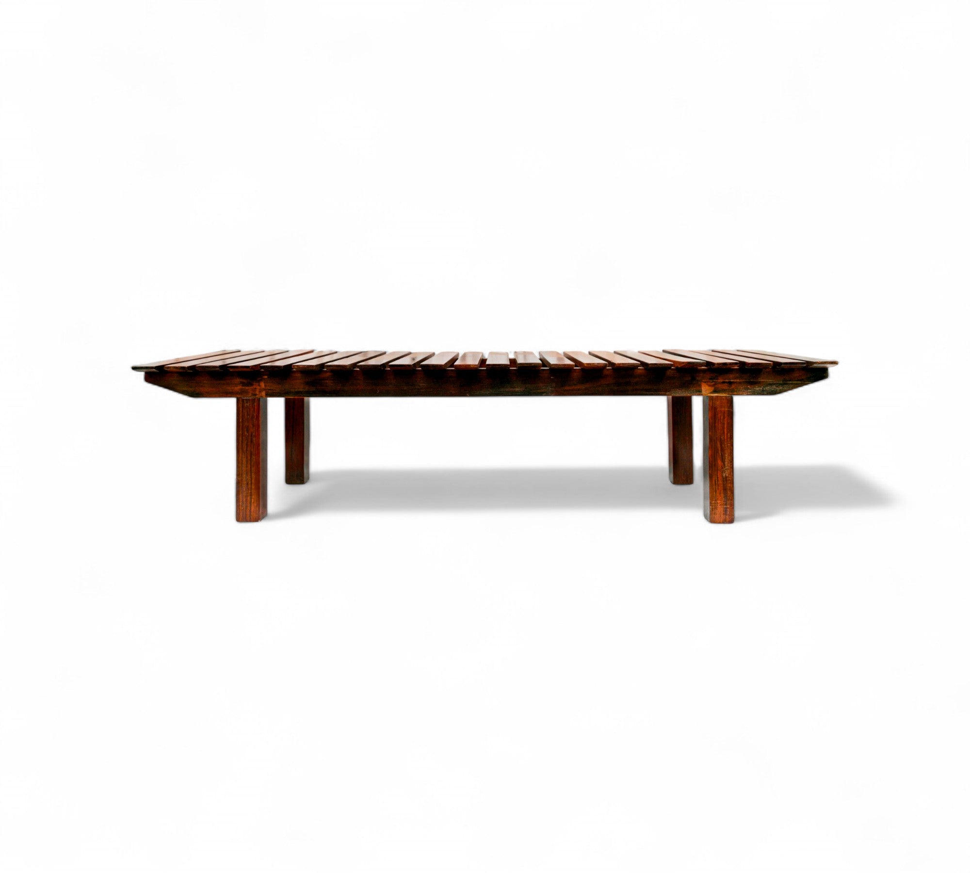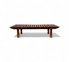 This bench is entirely crafted from Brazilian rosewood, also known as jacaranda, renowned for its rich color and distinctive grain patterns that enhance its beauty. The legs are formed by four vertical pieces of wood that elevate the bench off the ground.