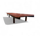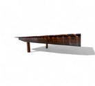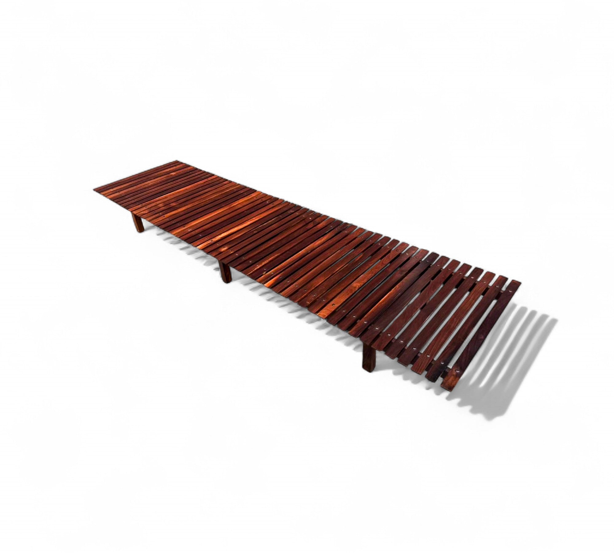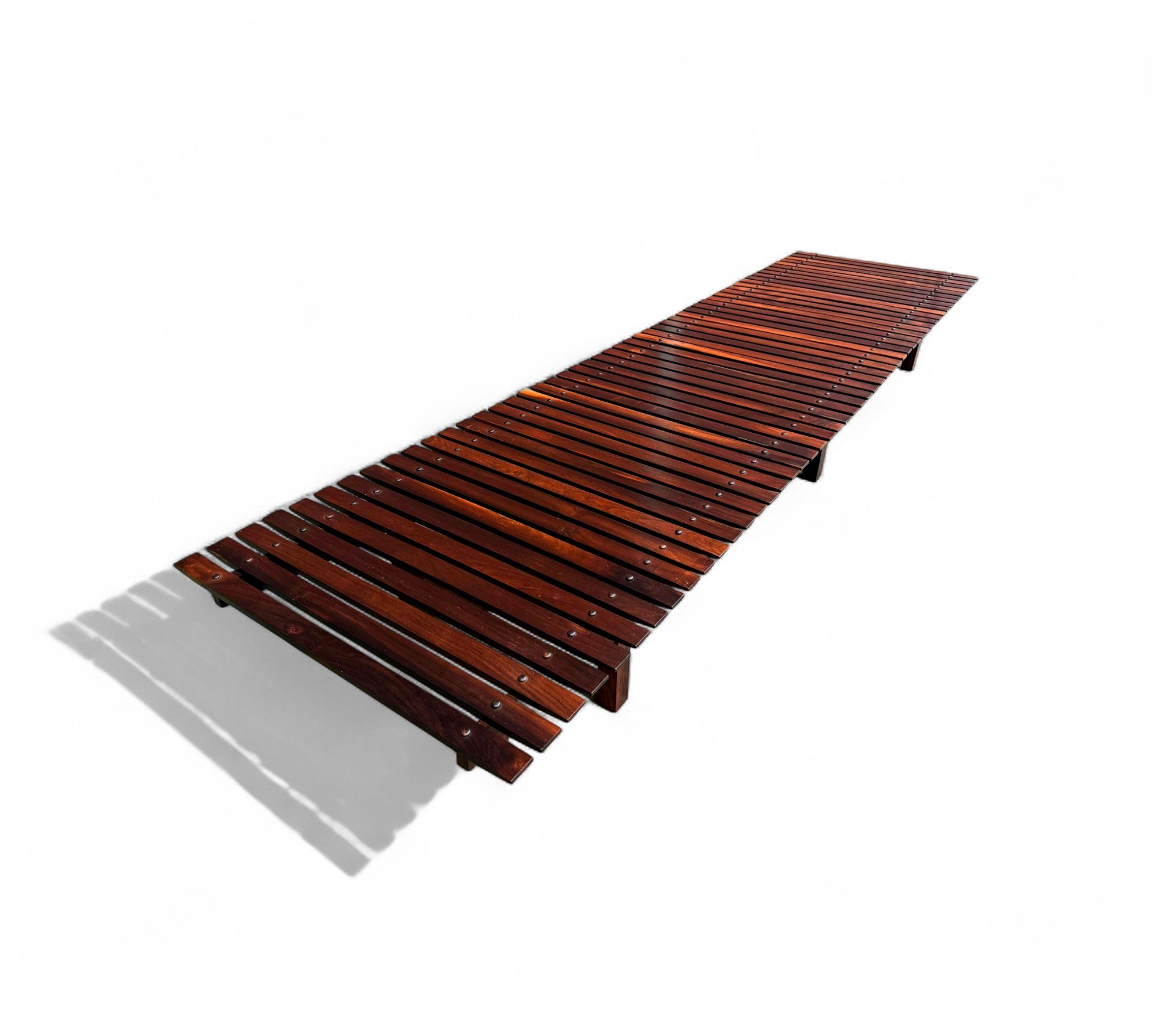 The "Mucki" bench, designed by Sergio Rodrigues in 1958 and manufactured by Oca, spans almost 10 feet, making it a versatile and striking piece suitable for both indoor and outdoor settings.