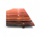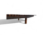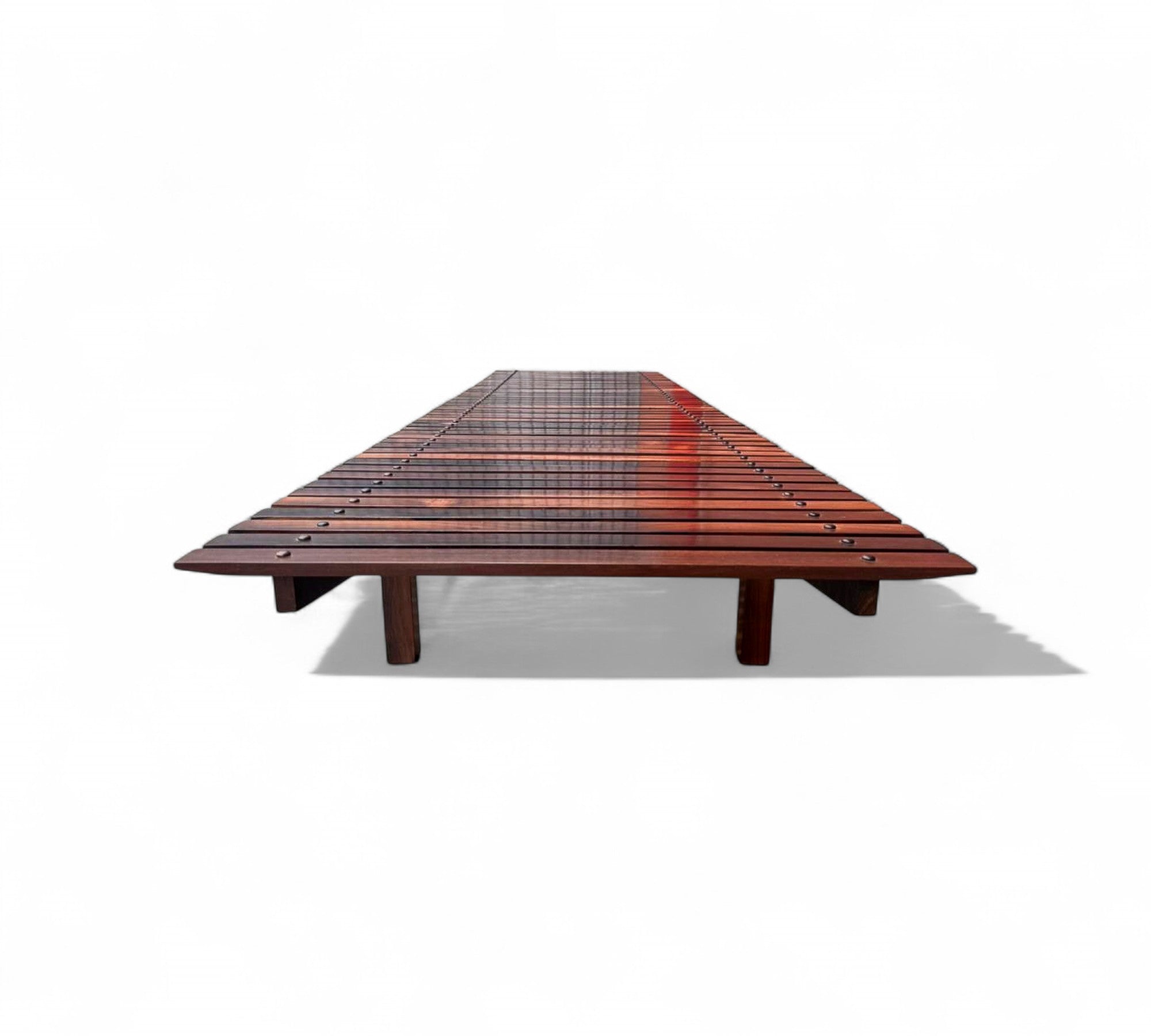 This bench features a low rectangular base with slats positioned latitudinally, embodying a simple yet elegant design. Small wood buttons delicately placed add a charming touch to its eye-catching appearance. Crafted from solid Rosewood, the bench exhibits beautiful natural tones and veins, showcasing Rodrigues' artistic vision in its finest form.