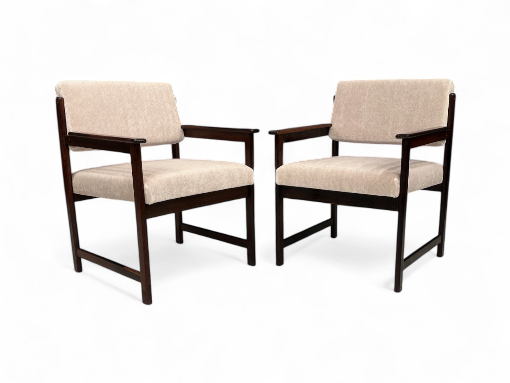 This elegant set of armchairs was designed by Jorge Jabour Mauad and carefully crafted by Cantù Móveis e Interiores Ltda. in the 1960s. Each chair features a cubic frame made entirely of Brazilian Rosewood, paired with soft, creamy mohair upholstery. The arms, broader than the structure, add a sophisticated detail. The rosewood has been expertly refinished, highlighting its vivid veins and preserving its vintage marks, yet the armchairs are in excellent condition. The fabric upholstery has been recently replaced. Both functional and visually appealing, this set would complement any modern, mid-century, or contemporary space, offering a perfect mix of comfort and style.