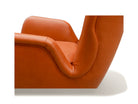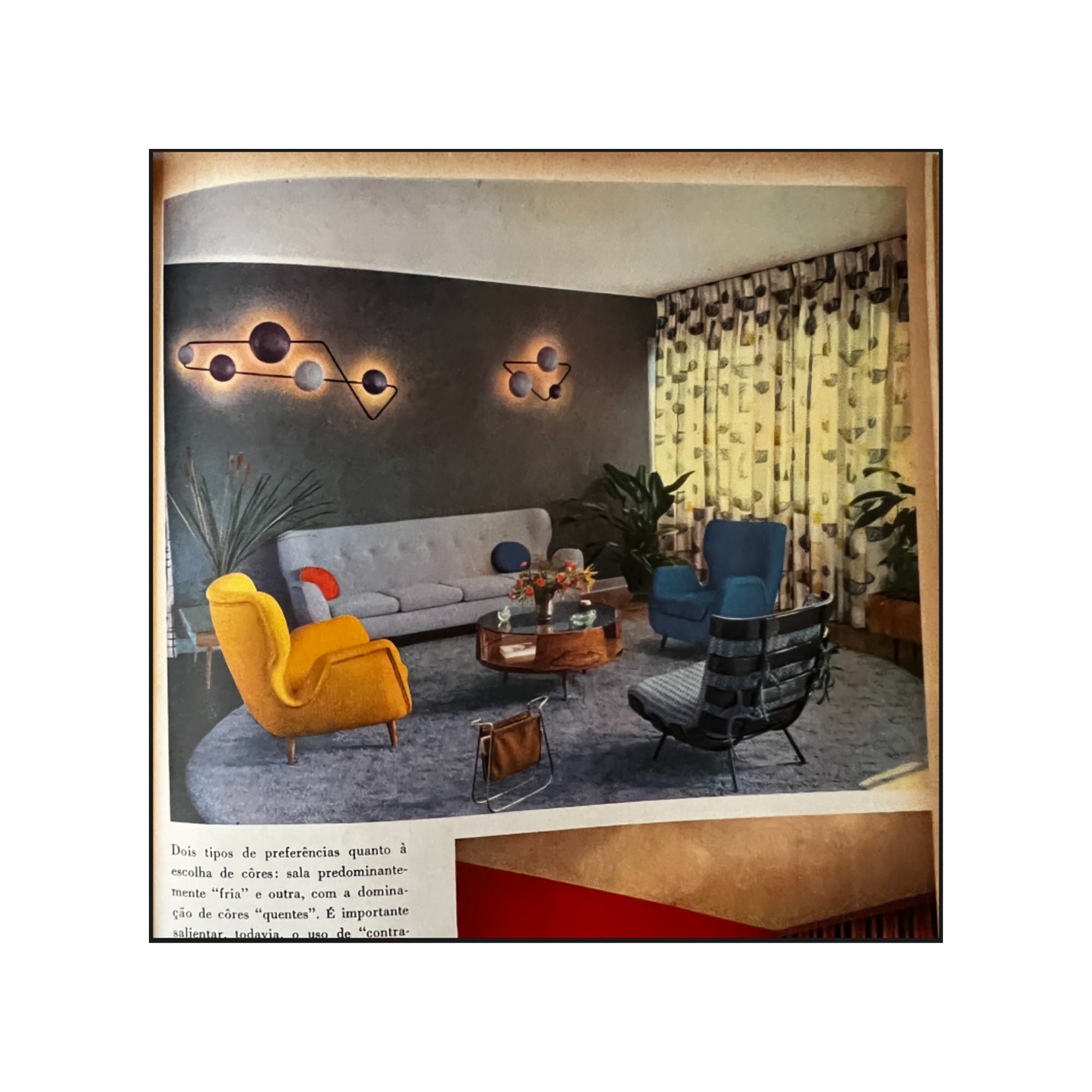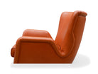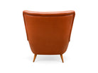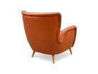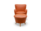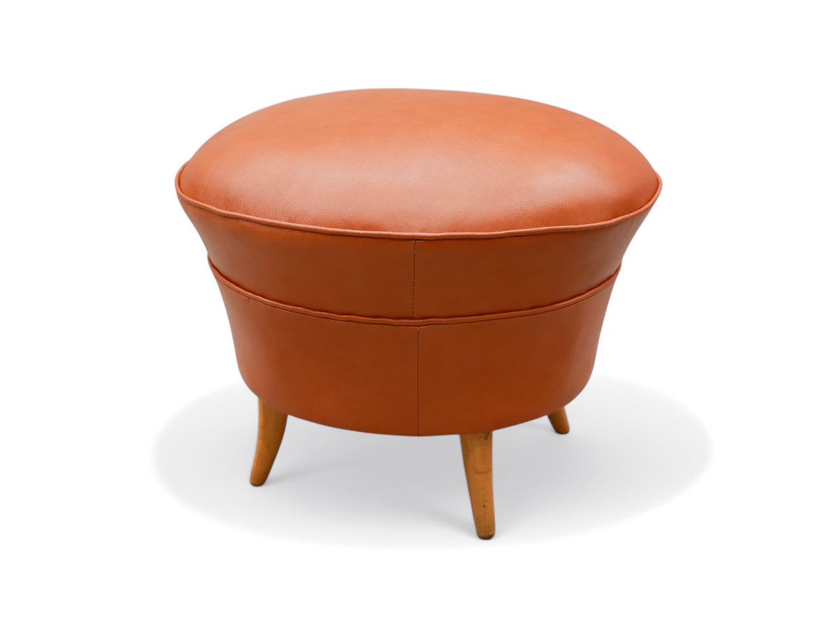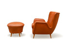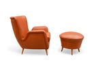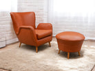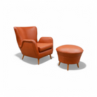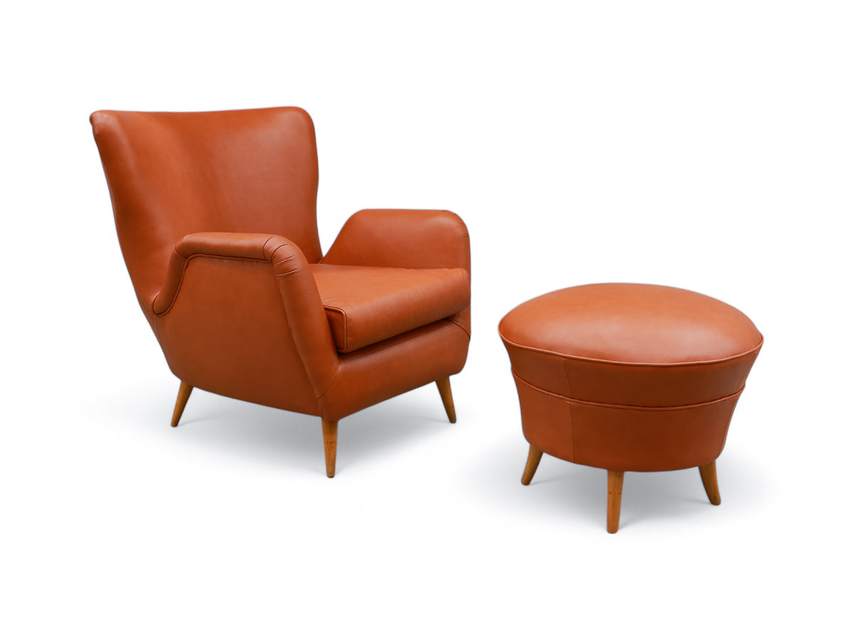 The armchair features elegantly curved arms and four delicate legs, complemented by a matching ottoman crafted from the same high-quality wood and leather. We chose to reupholster the set in a color similar to the original, as seen in vintage publications displayed at the end. The set retains its original springs and is in excellent condition.