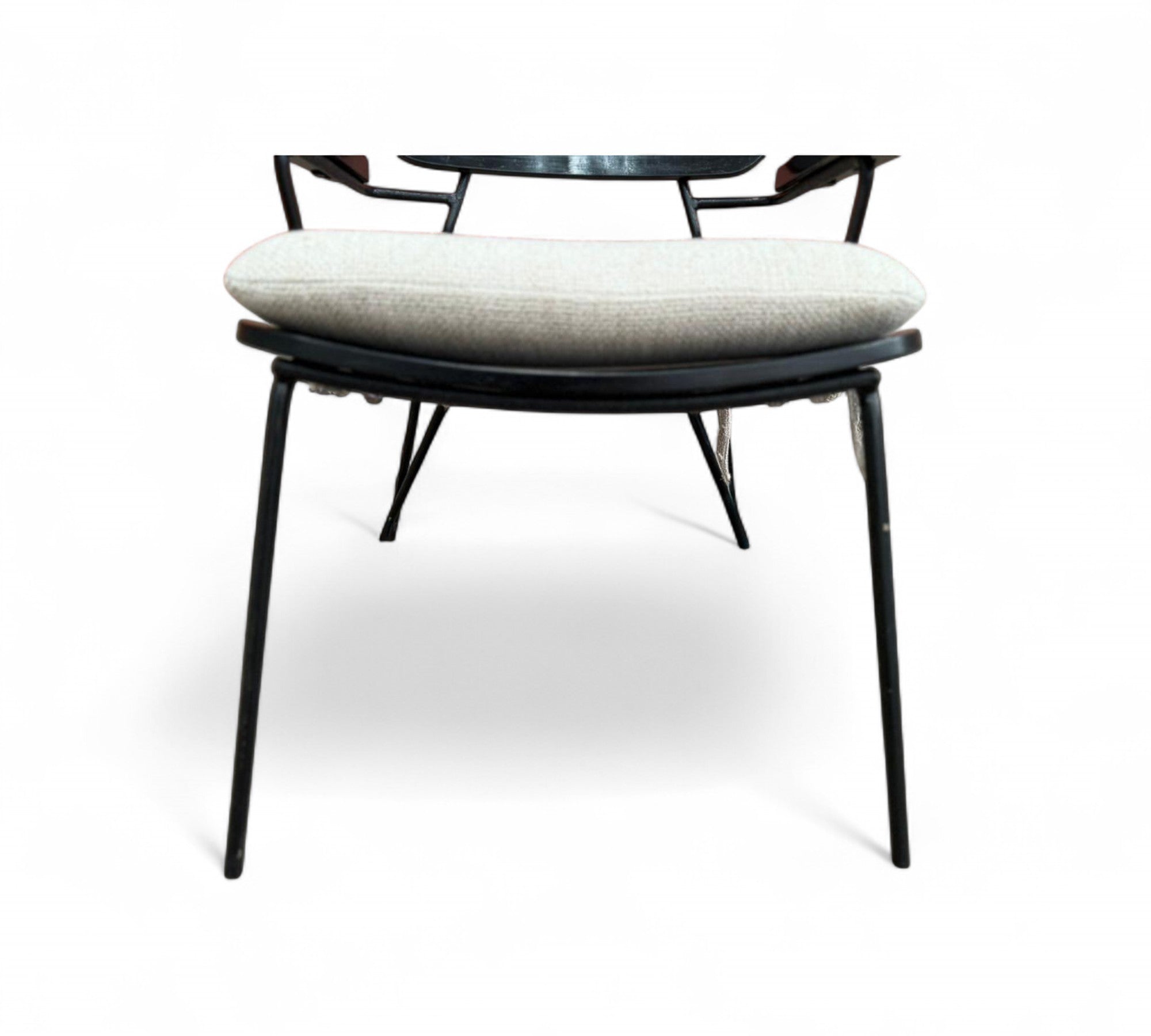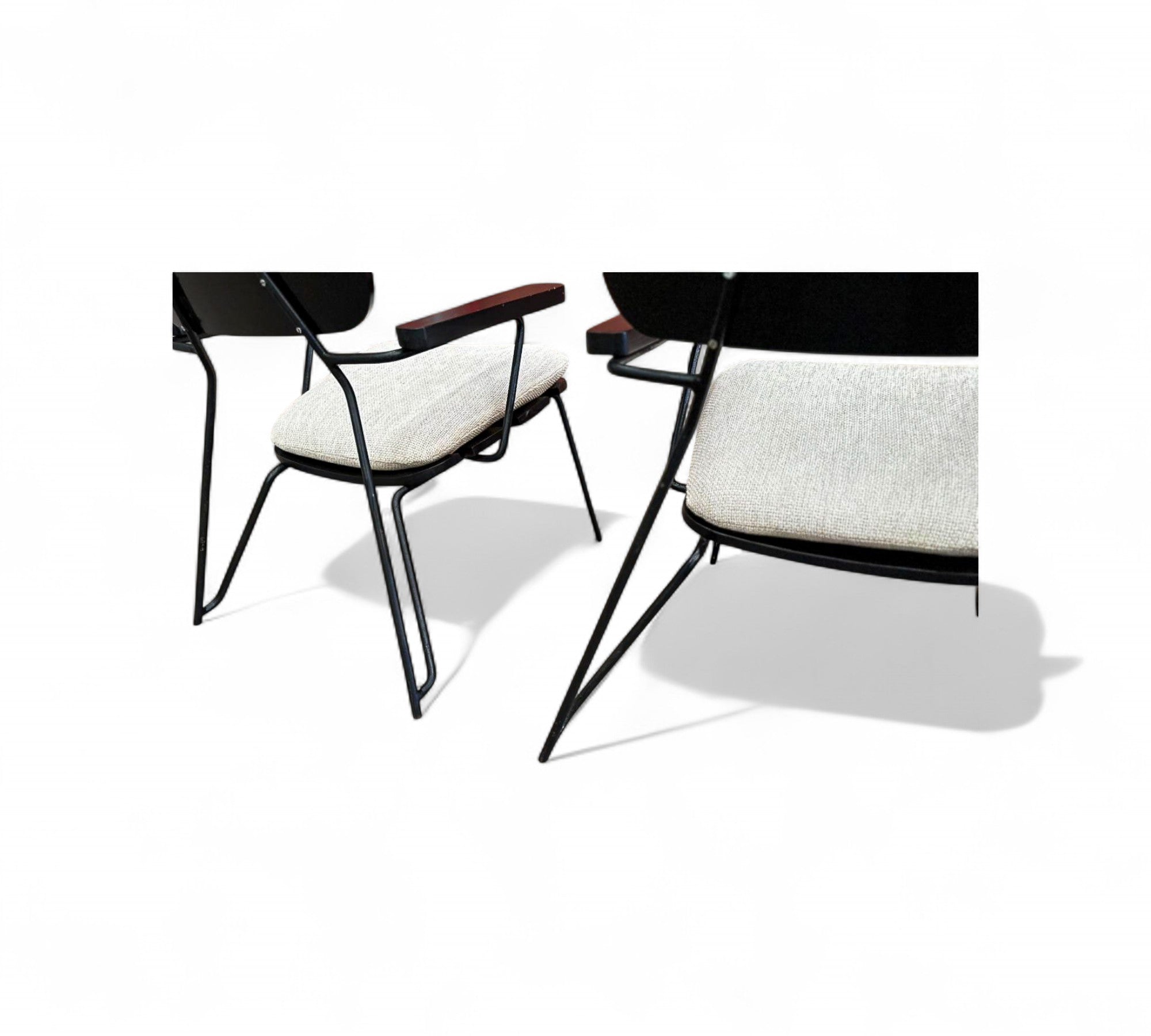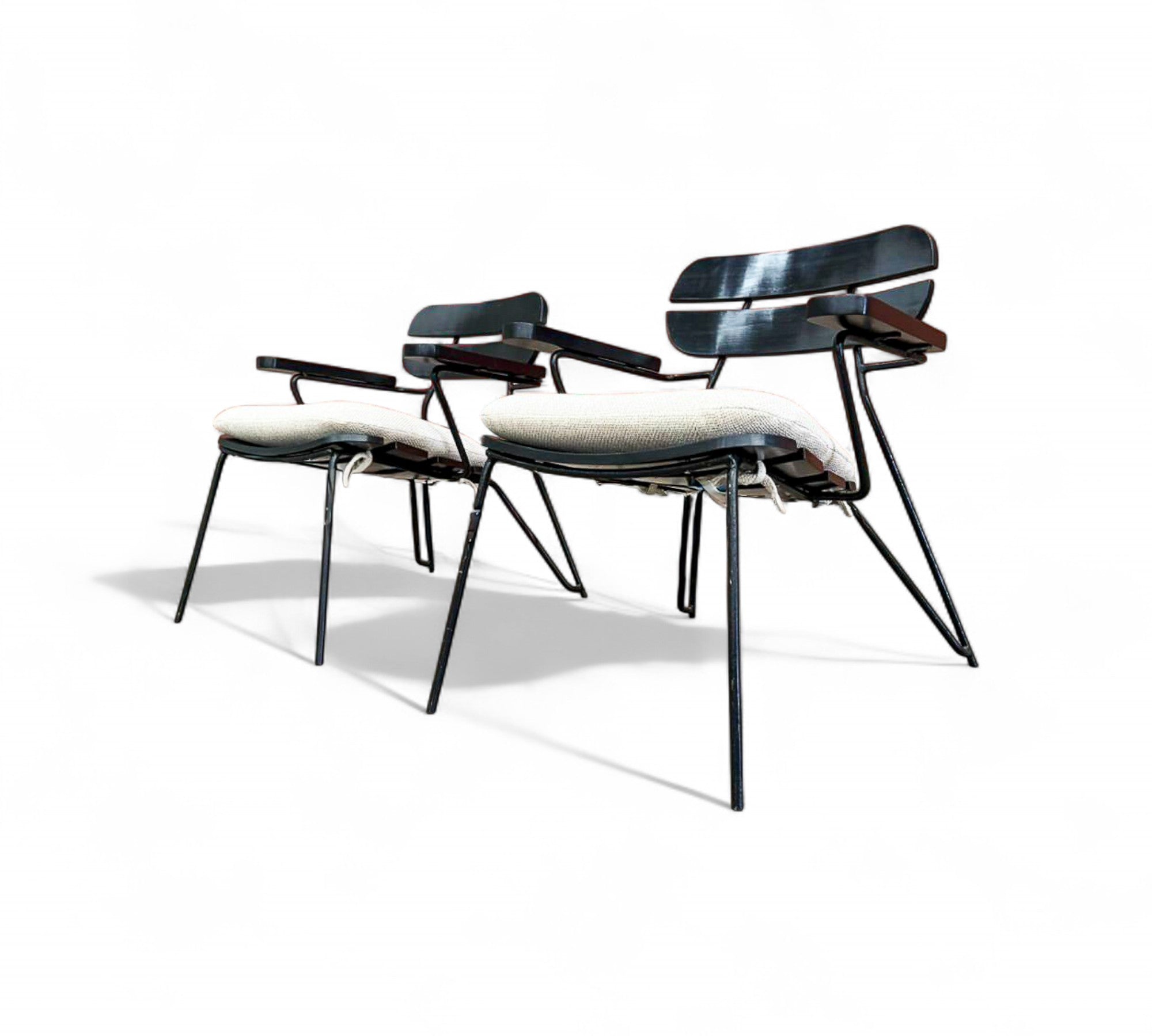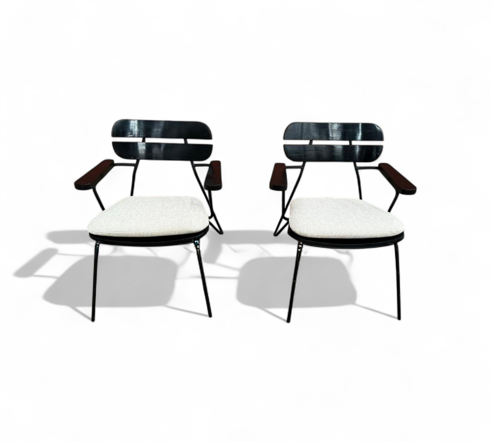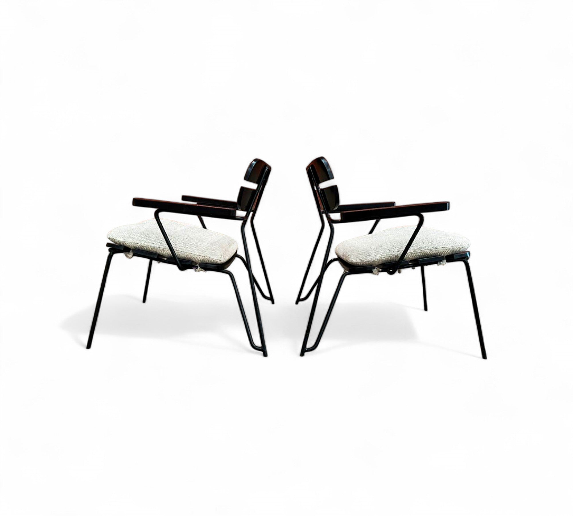 Designed by Carlo Hauner in the 1950s. Each chair features a sculptural black metal frame with Ebonized backrest design and gently angled legs that create an airy, architectural silhouette.