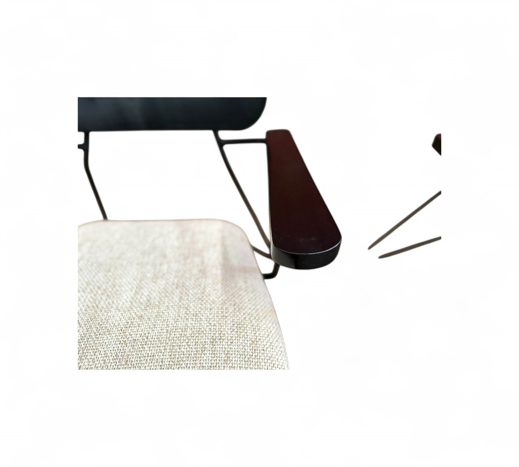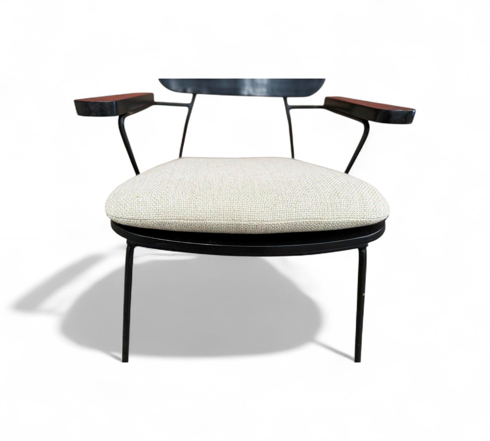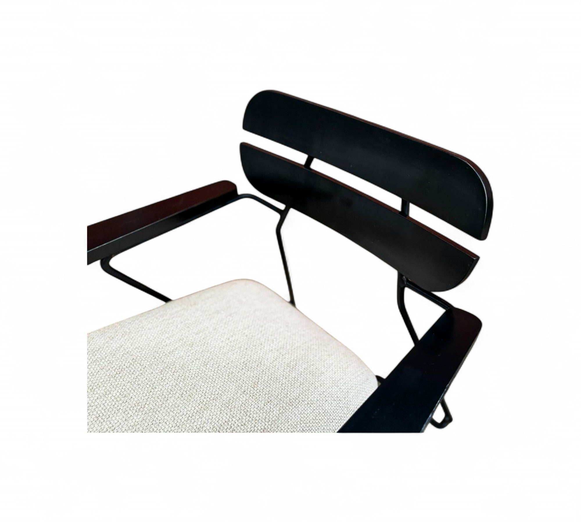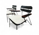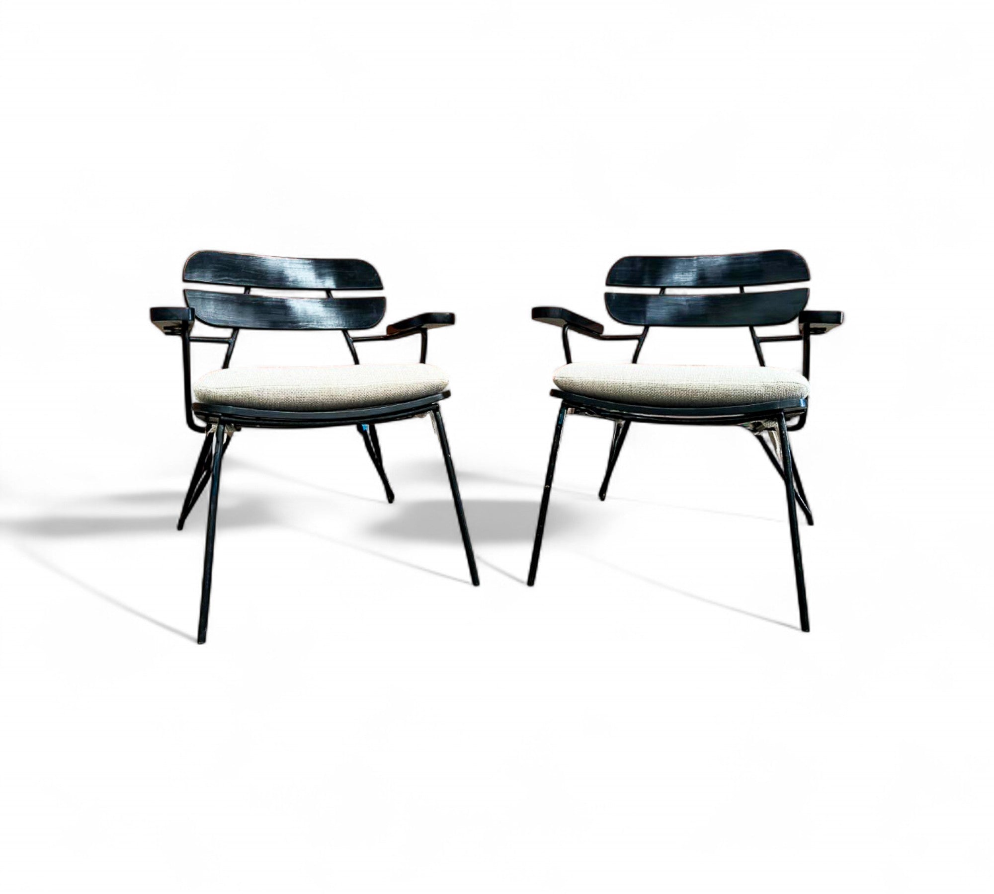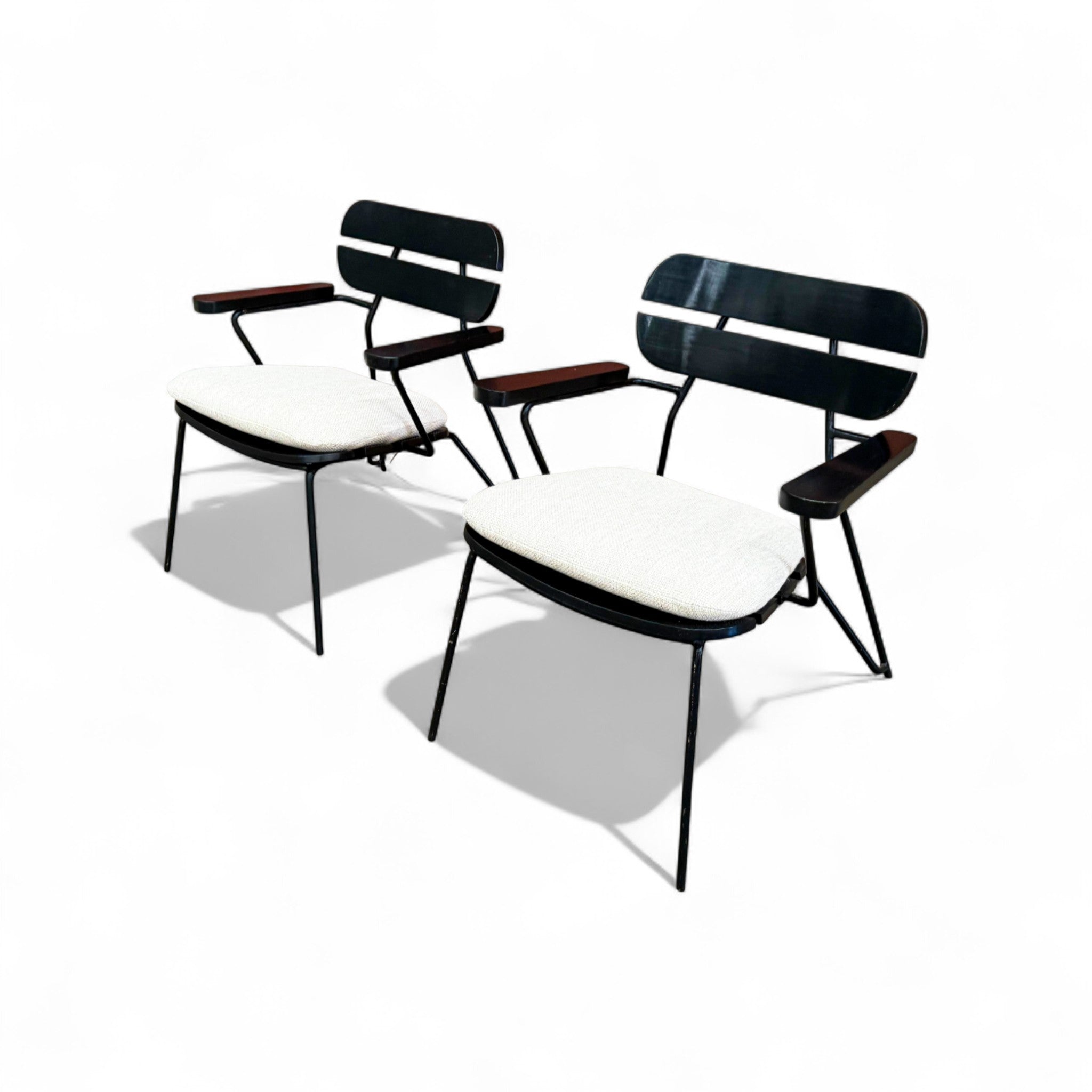 Designed by Carlo Hauner in the 1950s. Each chair features a sculptural black metal frame with Ebonized backrest design and gently angled legs that create an airy, architectural silhouette.