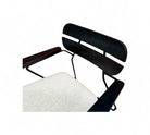 The seats are newly upholstered in a light gray tweed fabric, adding a soft, textured contrast to the darker frame while providing comfortable everyday seating. Wooden armrests introduce a warm organic touch, balancing the chair’s sleek, minimalist structure.