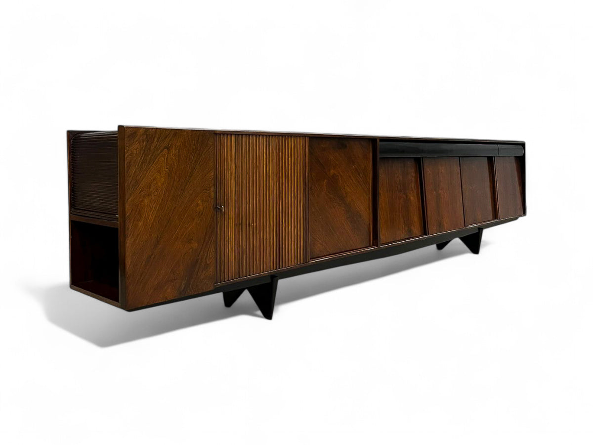 This spectacular mid-century modern credenza was designed by Carlo Hauner and Martin Eisler for their company, Forma, pioneers in the Brazilian modern design industry during the country's industrialization. Crafted from the finest Brazilian rosewood, also known as jacaranda, this credenza features four drawers, four sliding doors, ample shelving, and exquisite angled legs, iconic of Forma's work in the fifties.