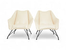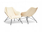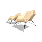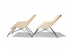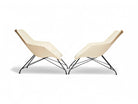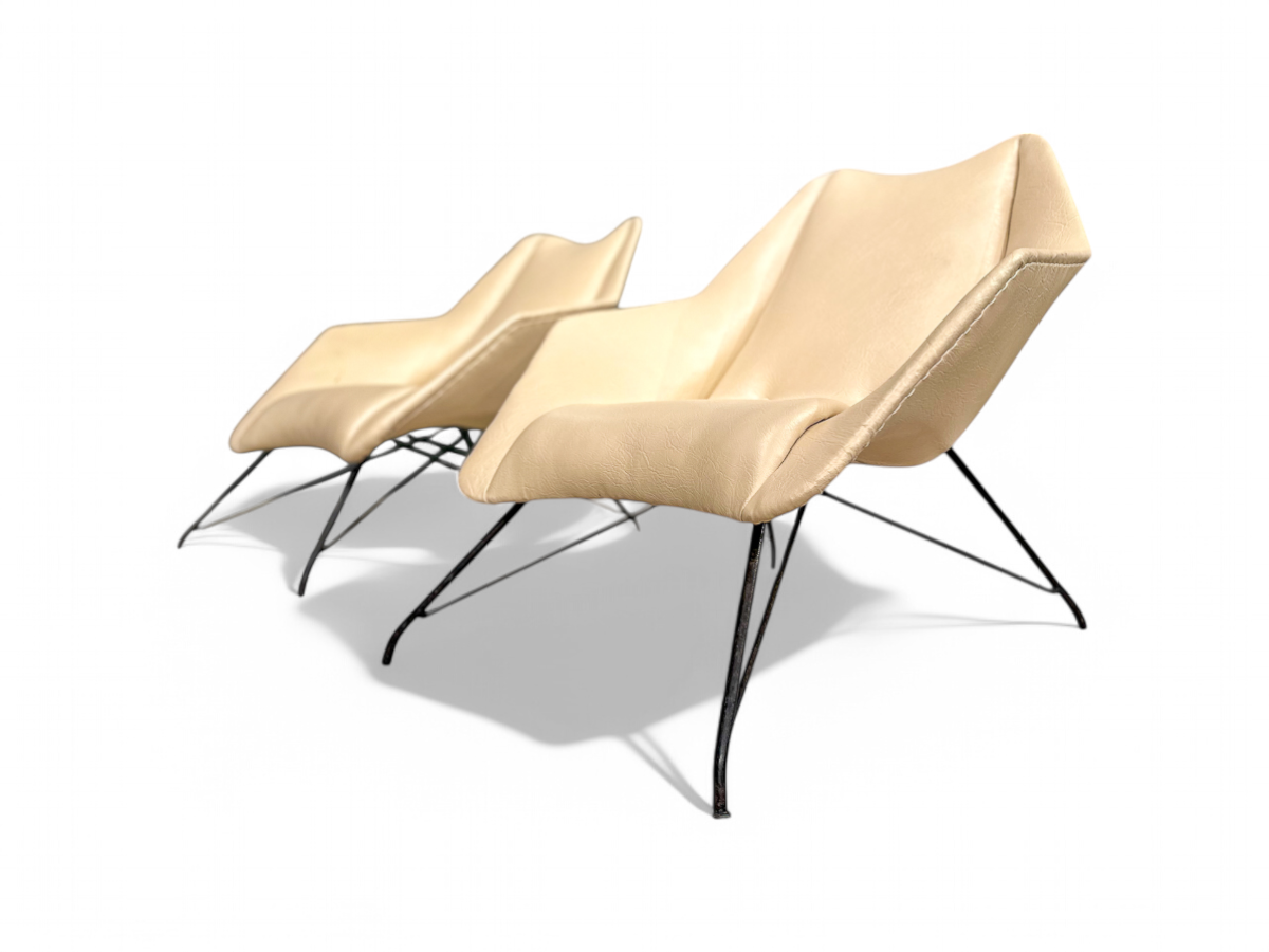 This pair of Brazilian modern armchairs, designed by Carlo Hauner and manufactured by Forma Móveis in 1955, is named "Concha" ("Shell" in Portuguese) due to their resemblance to an open seashell. These iconic armchairs feature an intricate and delicate steel frame with a curved off-white leather seat. The low and wide seats contribute to their comfort, while their sleek design allows them to seamlessly complement any home interior.
