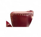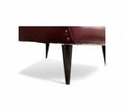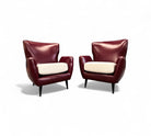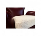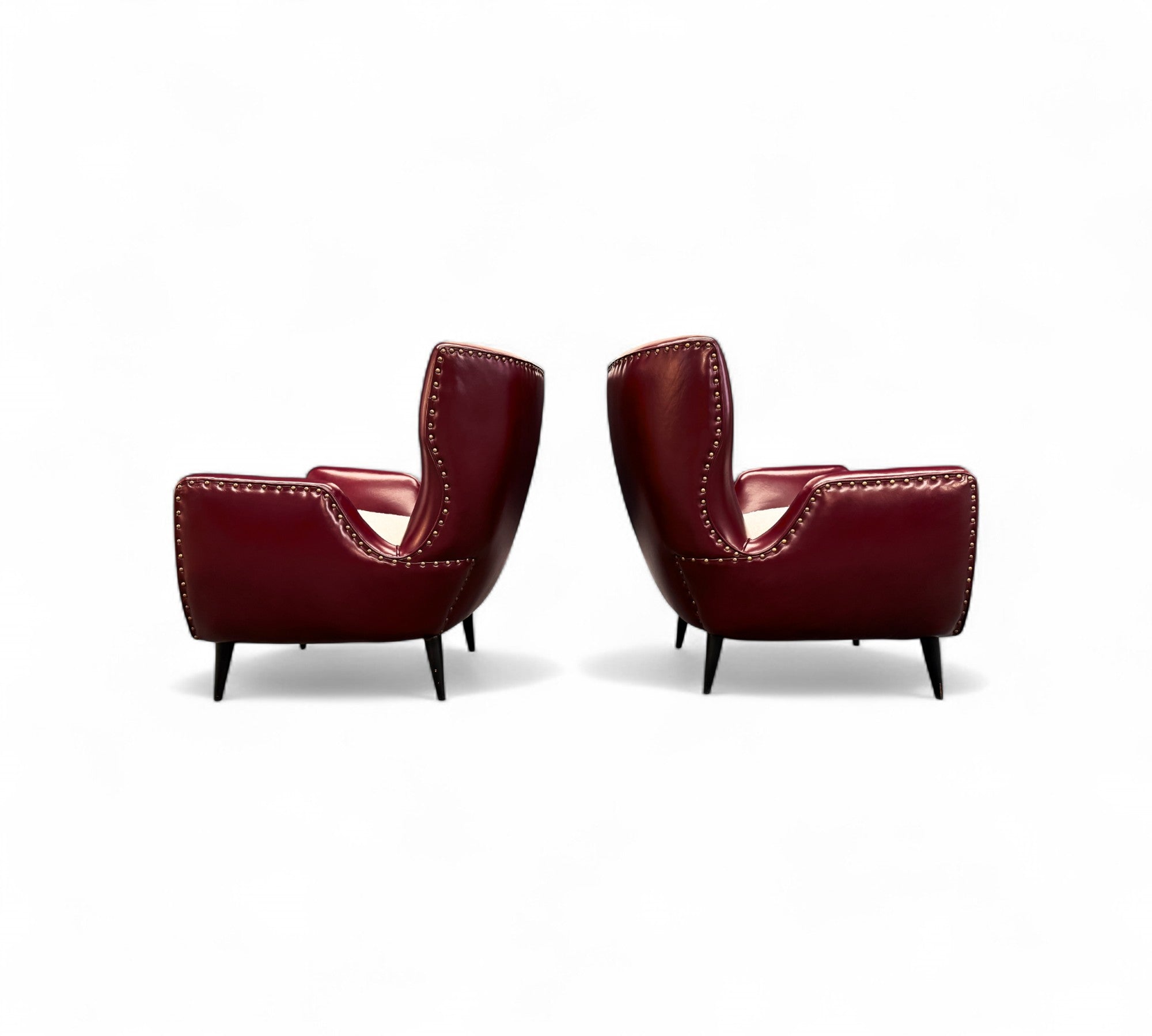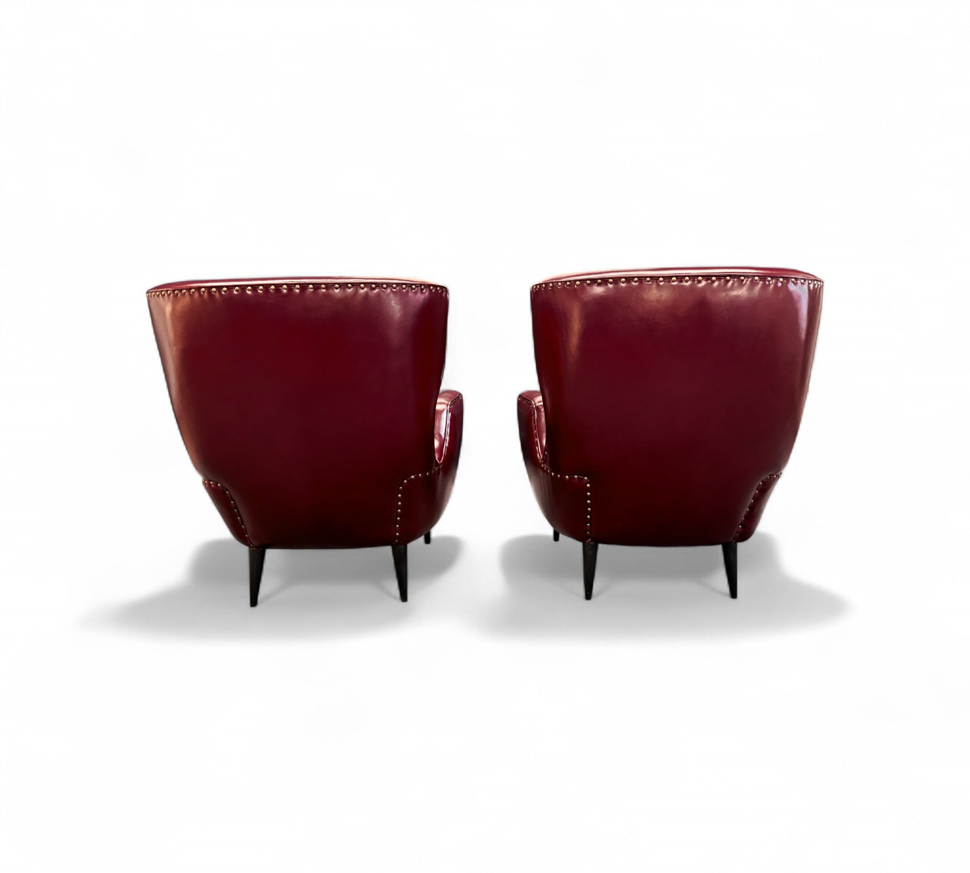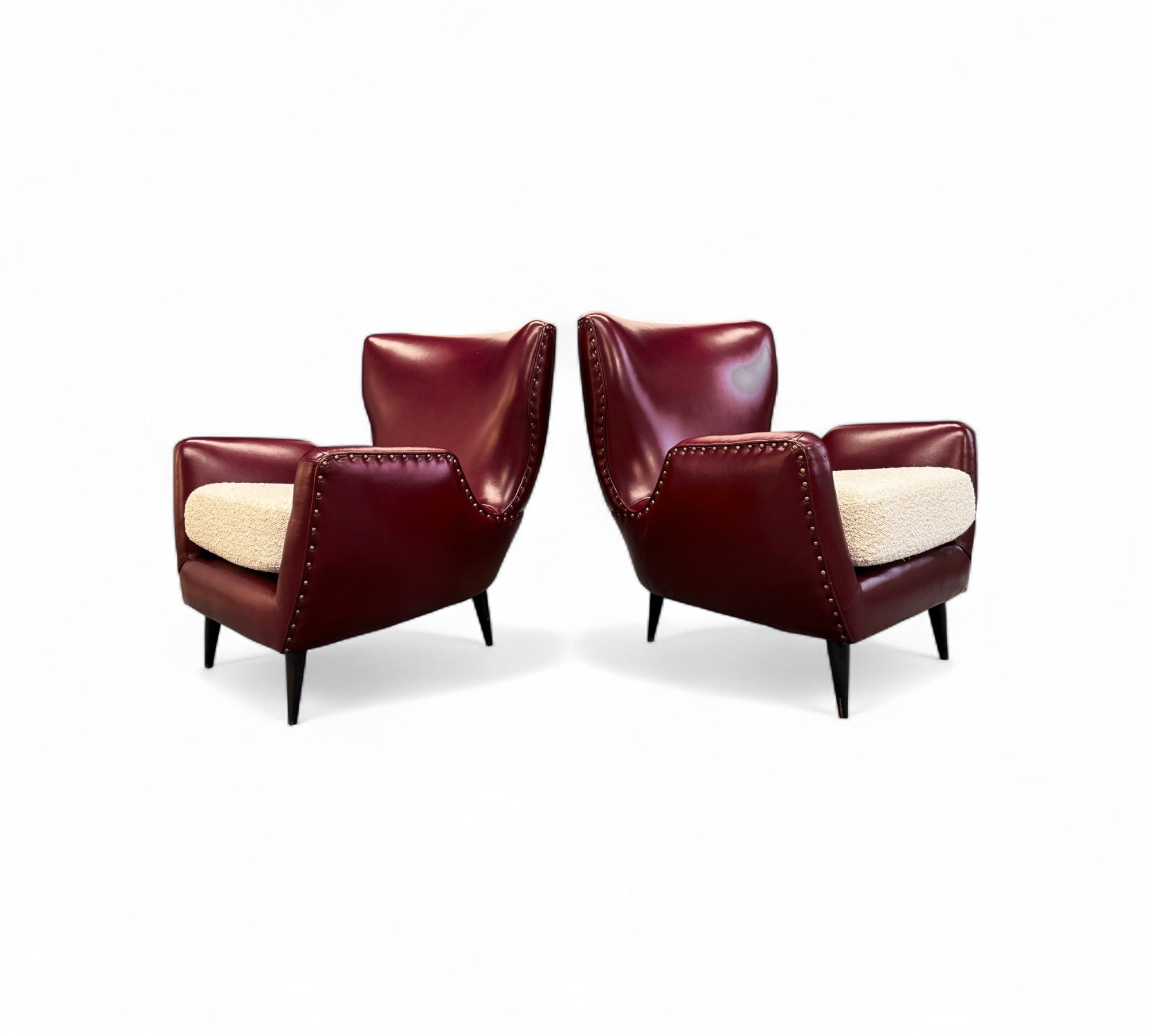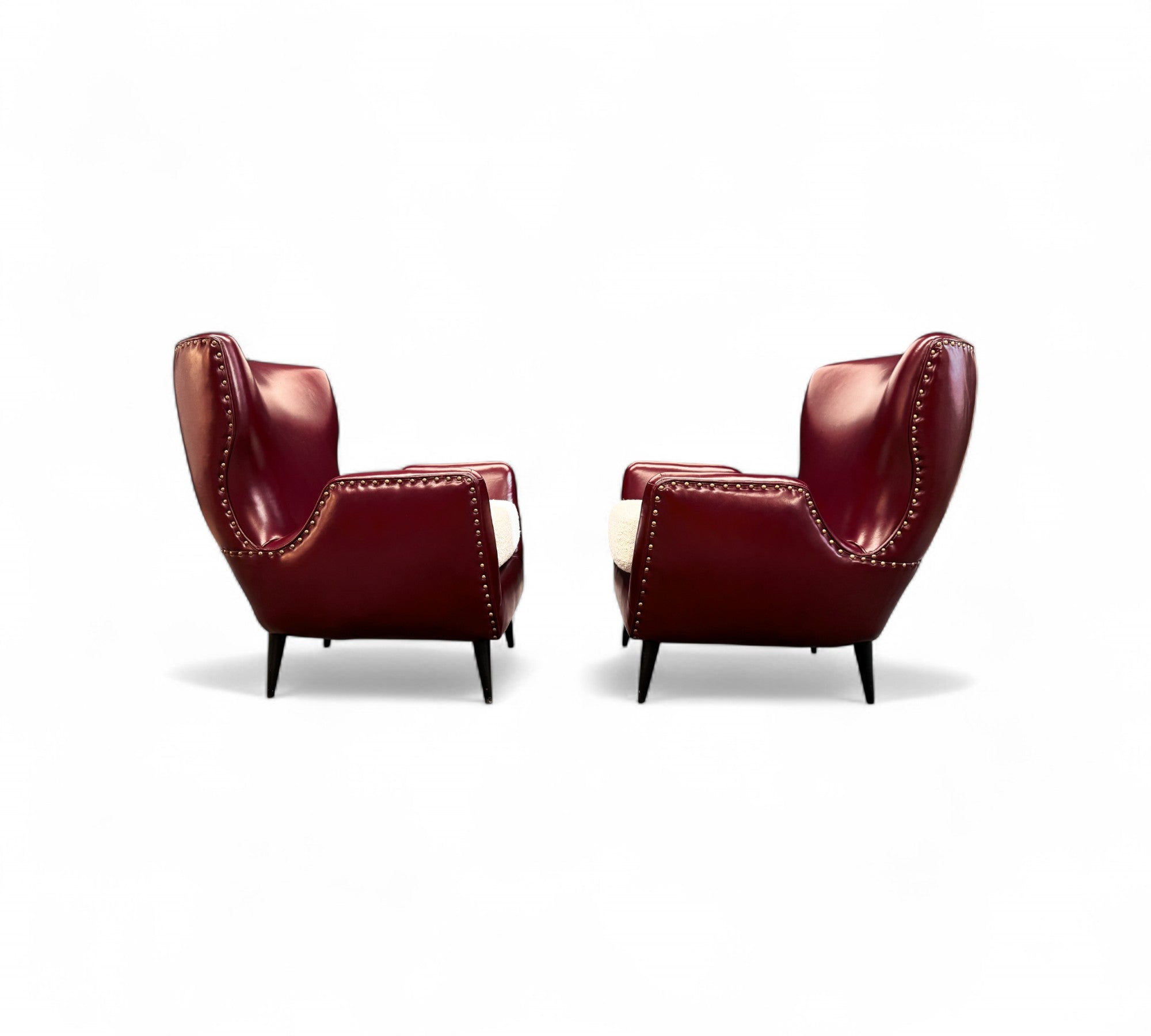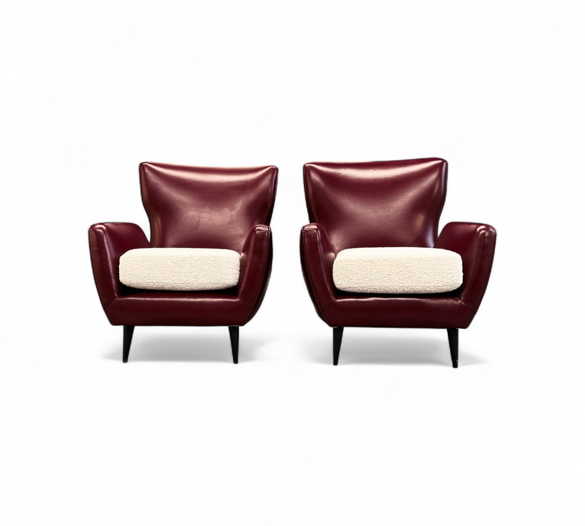 This set of armchairs is made in hardwood, leather and soft boucle. The armchairs have curved arms and four delicate legs in wood. We decided to keep a similar upholstery style/technique to the original so we chose burgundy leather (secured with brass rivets) for the body and white fabric for the loose cushions. The last few images showcase the same model in different publications of the time. This set was purchased from a home in Sao Paulo, Brazil.