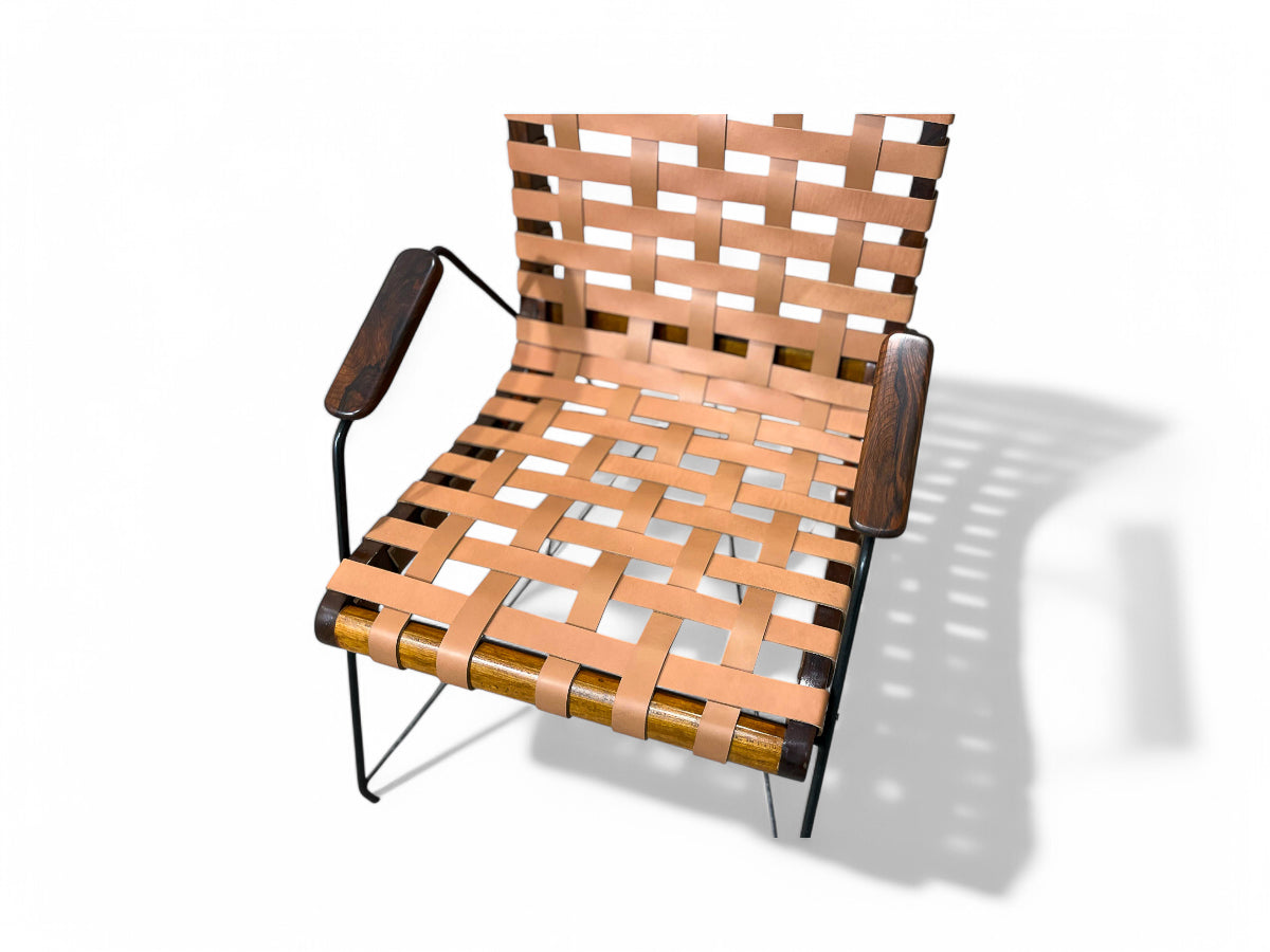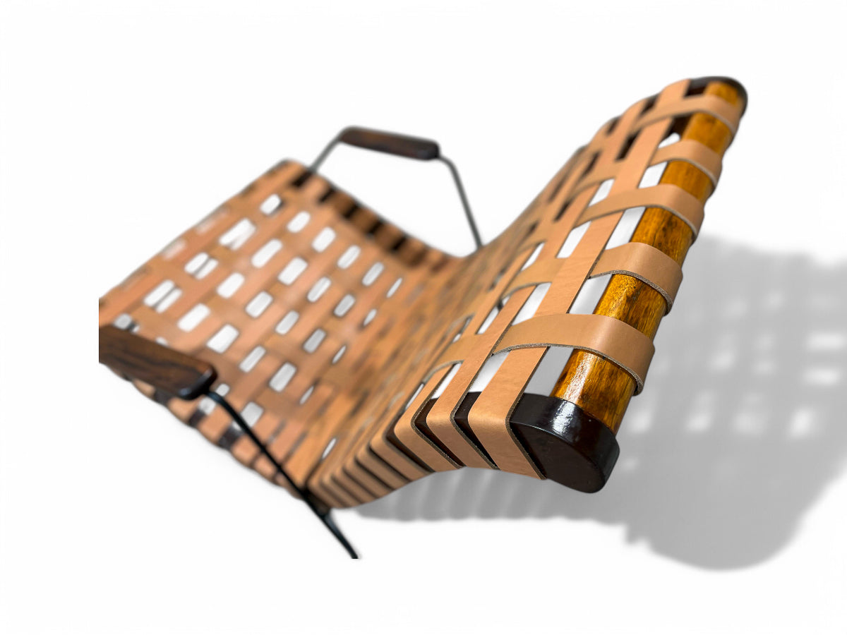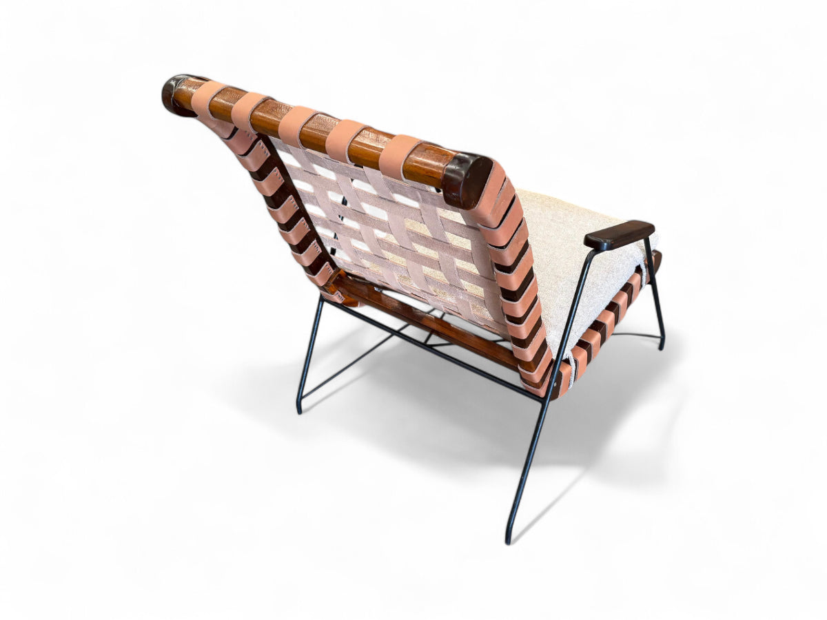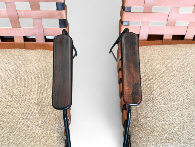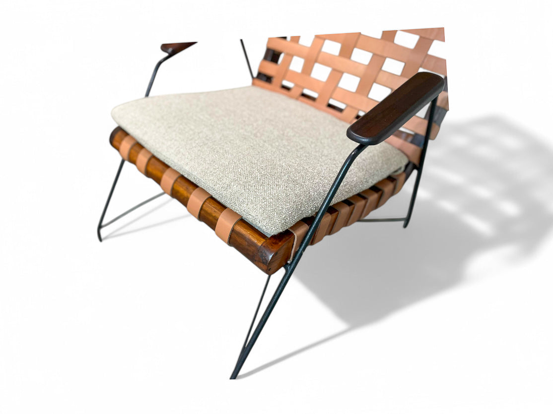 This and one-of-a-kind set showcase a gracefully curved silhouette crafted from beautifully aged Rosewood. The legs are constructed from metal, while the new straps feature luxurious leather, complemented by a plush loose cushion made of soft beige chenille.