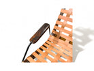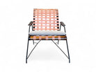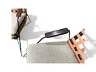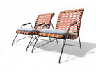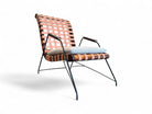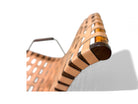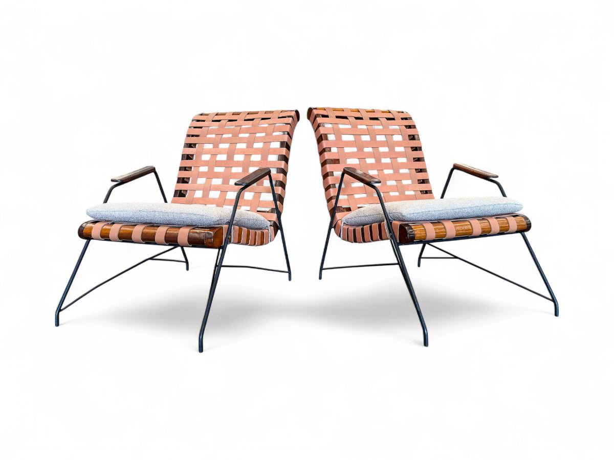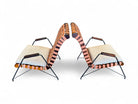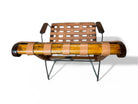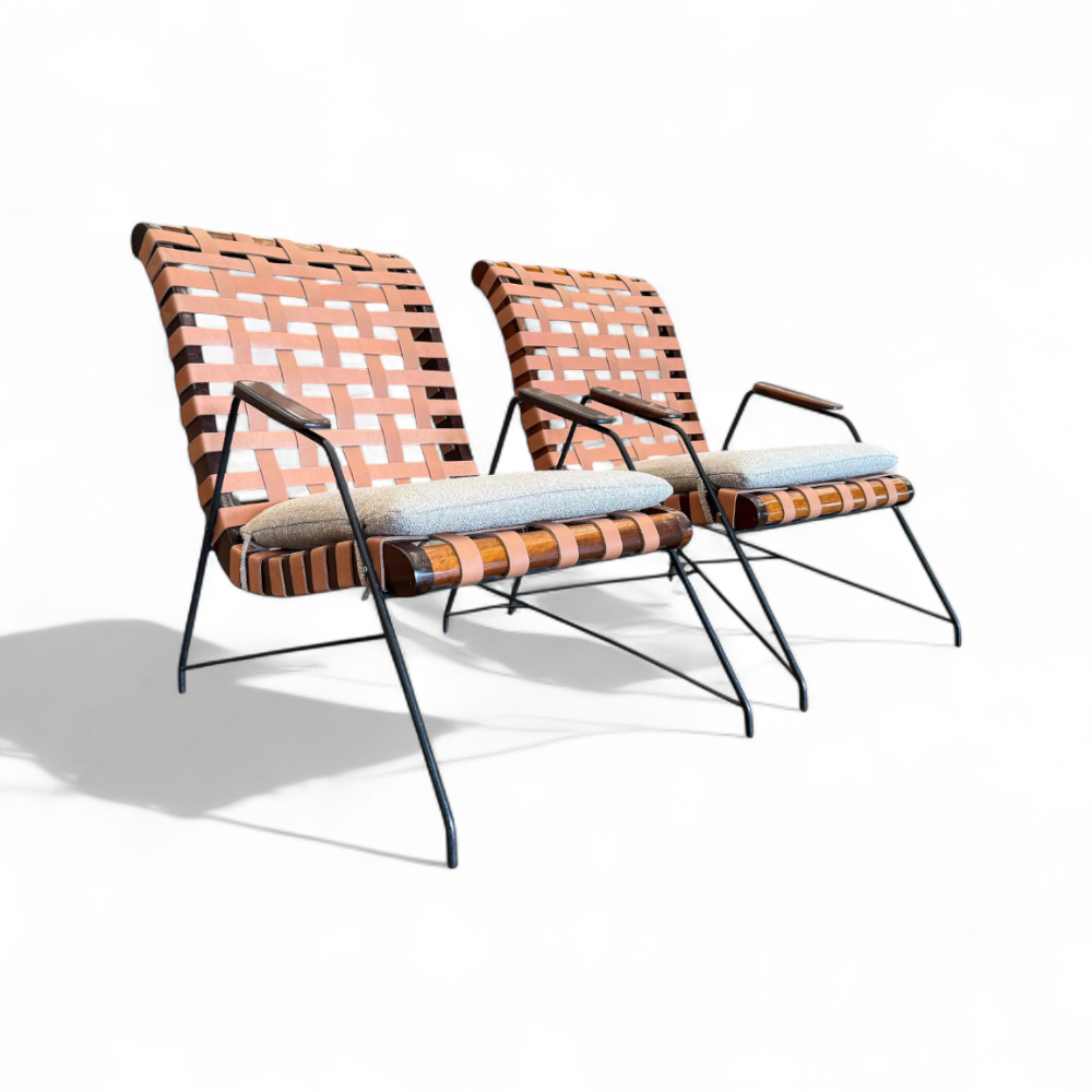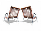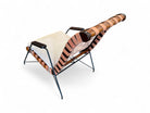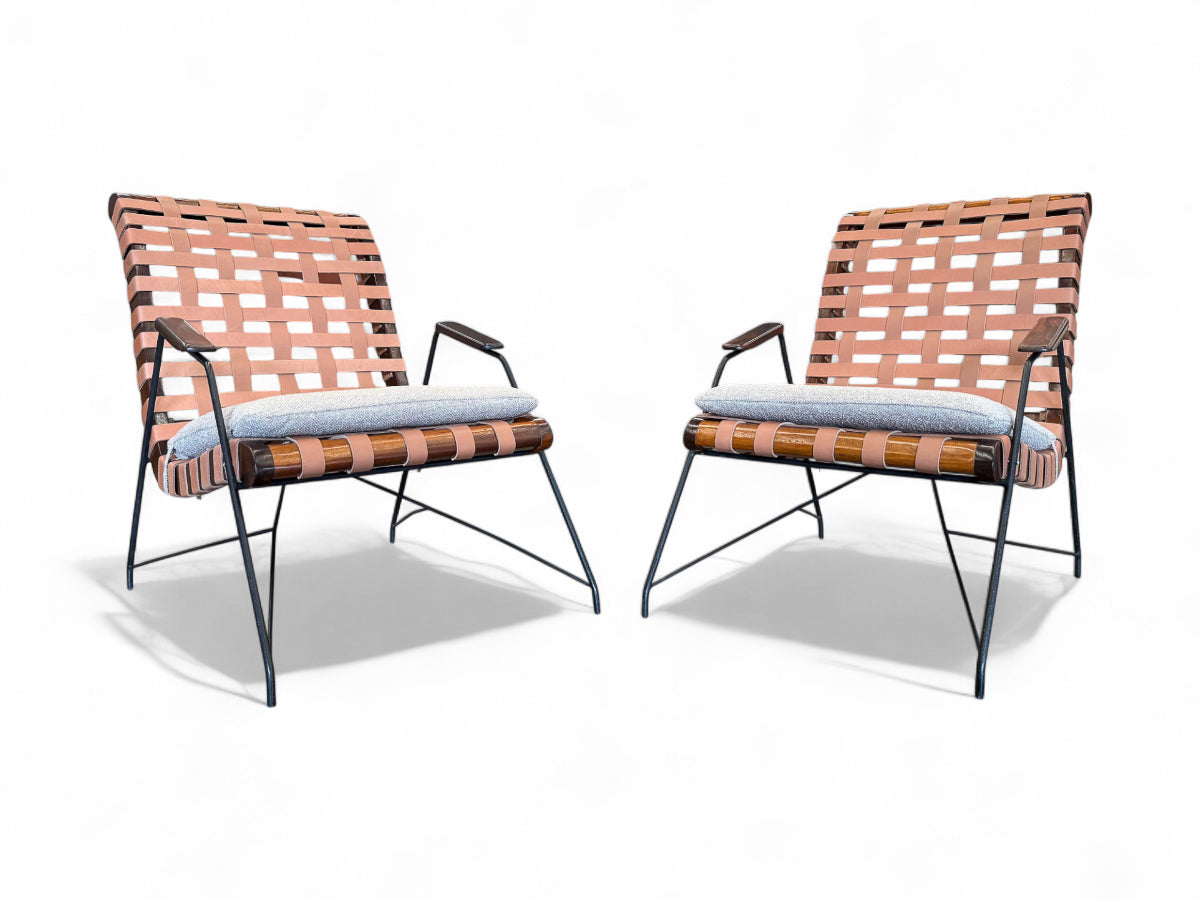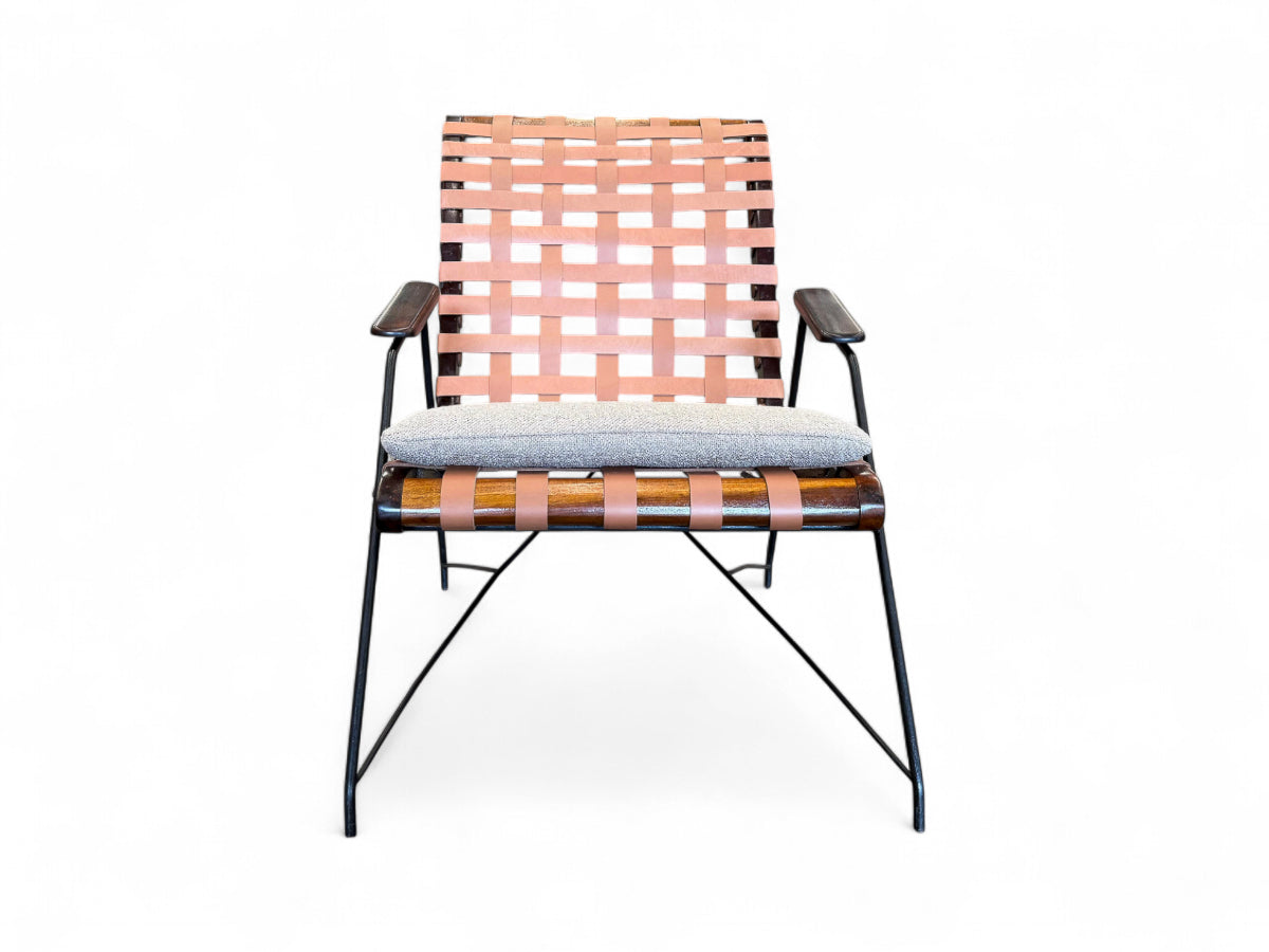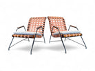 This and one-of-a-kind set showcase a gracefully curved silhouette crafted from beautifully aged Rosewood. The legs are constructed from metal, while the new straps feature luxurious leather, complemented by a plush loose cushion made of soft beige chenille.