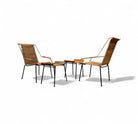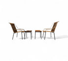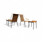 These armchairs feature an iron structure with four legs, a tall backrest, a curved seat, and wide armrests with caning. Each armchair comes with a matching stool, and the four pieces are sold as a set. The cane and steel are in their original condition and complement each other beautifully. Designed in the fifties as outdoor furniture, this sculptural set would look equally impressive indoors.