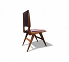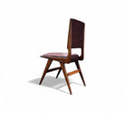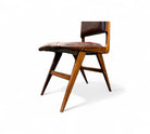Designed by Forma Brazil, this set of six dining chairs showcases elegant refinished rosewood frames with the original faux leatherette upholstery in a richly textured finish. The clean lines, tapered legs, and striking dark veins of Brazilian rosewood exemplify the refinement and craftsmanship of Brazilian mid-century modern design. Created by Eisler and Hauner, these chairs balance style and functionality, offering comfort and timeless sophistication while complementing any dining table or interior setting. This set of six has 5 in the maroon leatherette and one chair that is in a cream leatherette, please inquire about our reupholstery services.