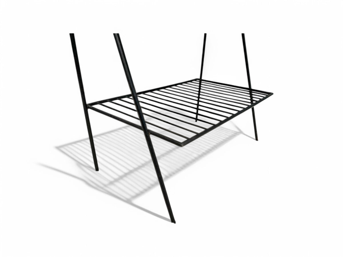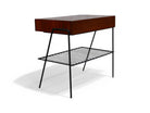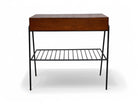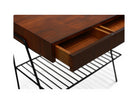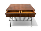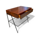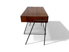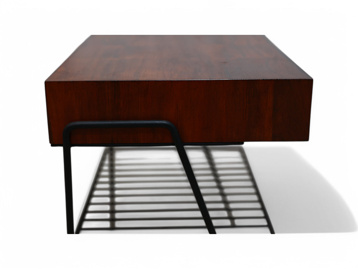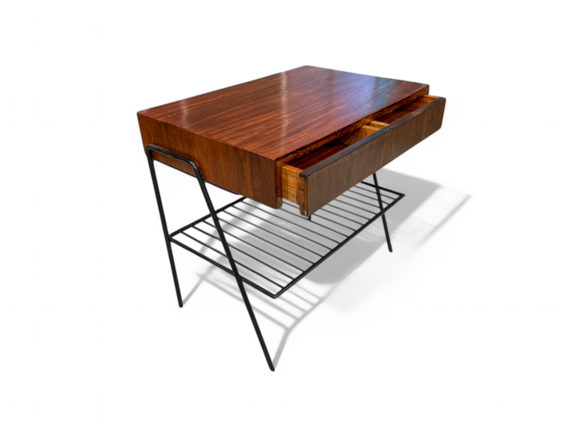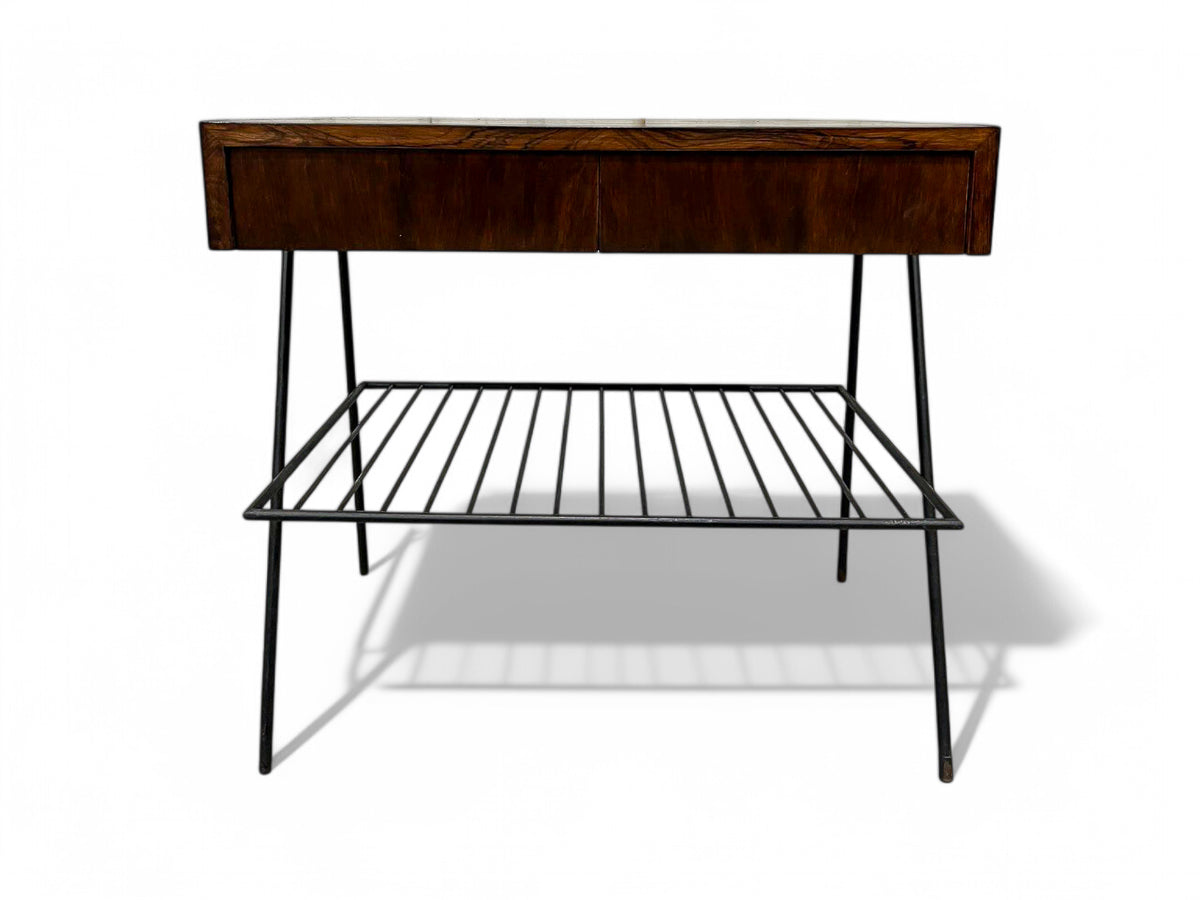 This rectangular side table, a rare model designed by Carlo Hauner in the 1950s, features a Brazilian rosewood top adorned with two drawers for added functionality. The base of the table is crafted from black metal and includes a wire shelf, enhancing its unique design and practicality.