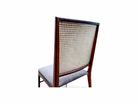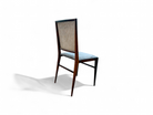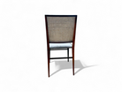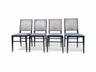 Each dining chair features a structure in Brazilian rosewood with four delicate long legs with the backrest in caning and the seat in its original ultra suede upholstery. The wood has been refinished and displays colorful veins that make the chair look almost alive. The caning is new for two chairs and original for the other two. This set perfectly represents the Brazilian Modernist movement in the sixties: straight lines, leather, and abundance in the use of hardwood.