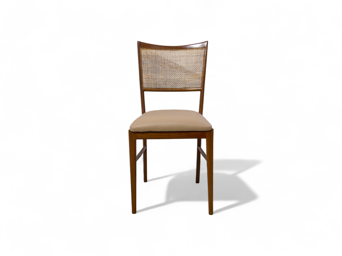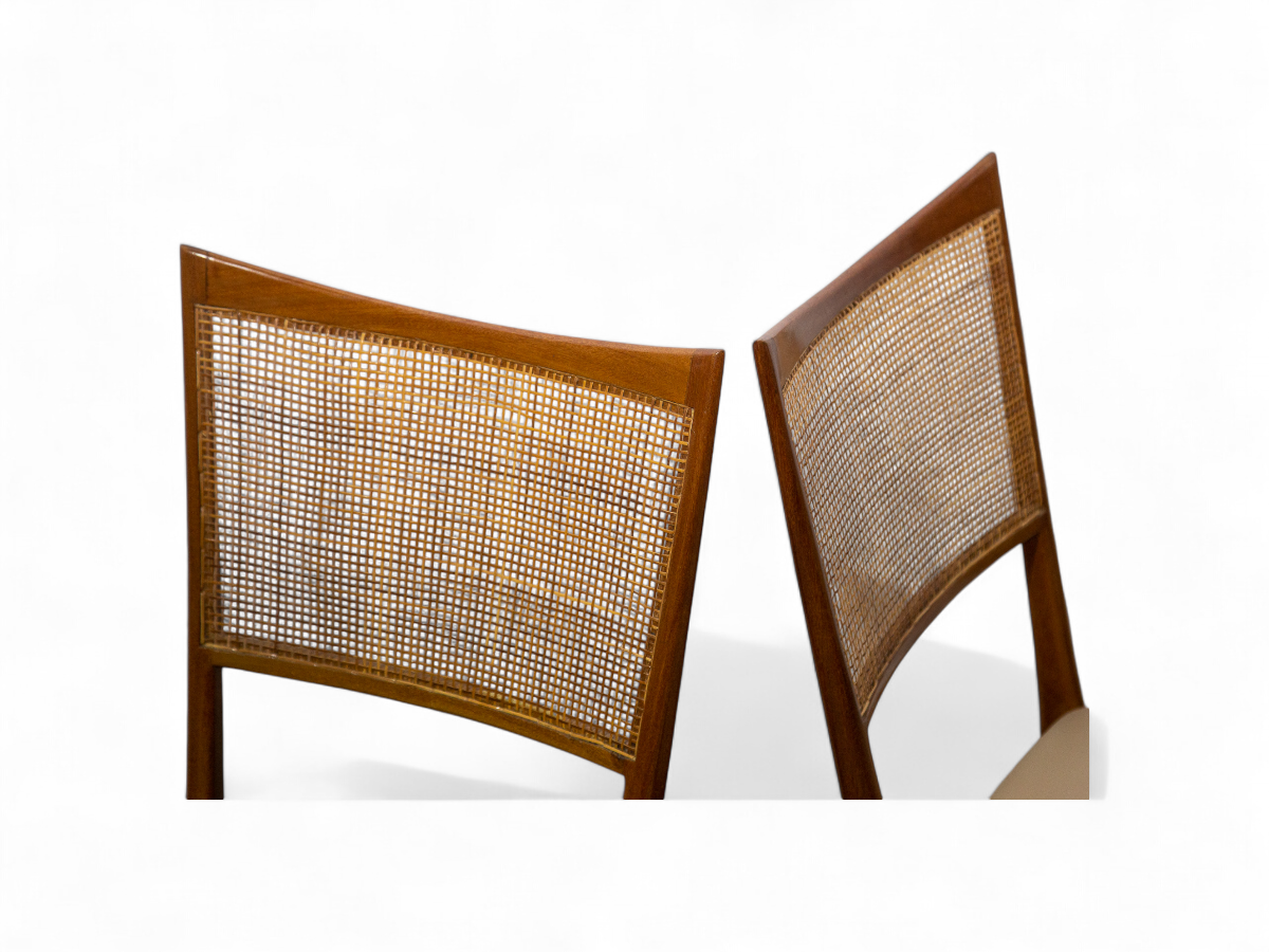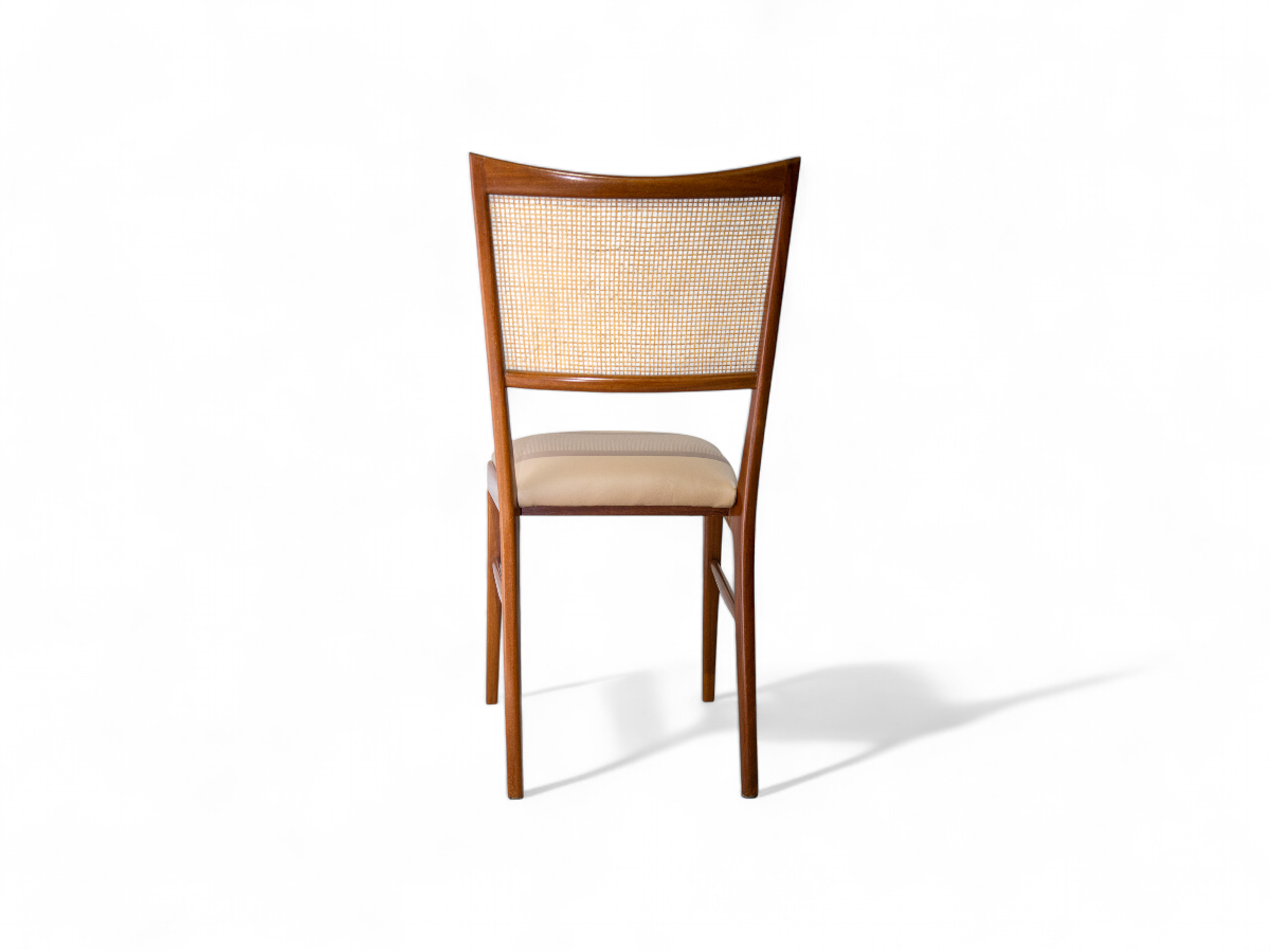 These chairs are crafted from brown Caviuna wood, which has been meticulously refinished to perfect condition. The soft cushioning on the upholstered leather seats ensures exceptional comfort, while the cane backrests add a distinctive and special touch. With their simplistic and clean design, these chairs are ideal for a small dining table and can seamlessly fit into any type of environment, making them a versatile and stylish addition to your home.
