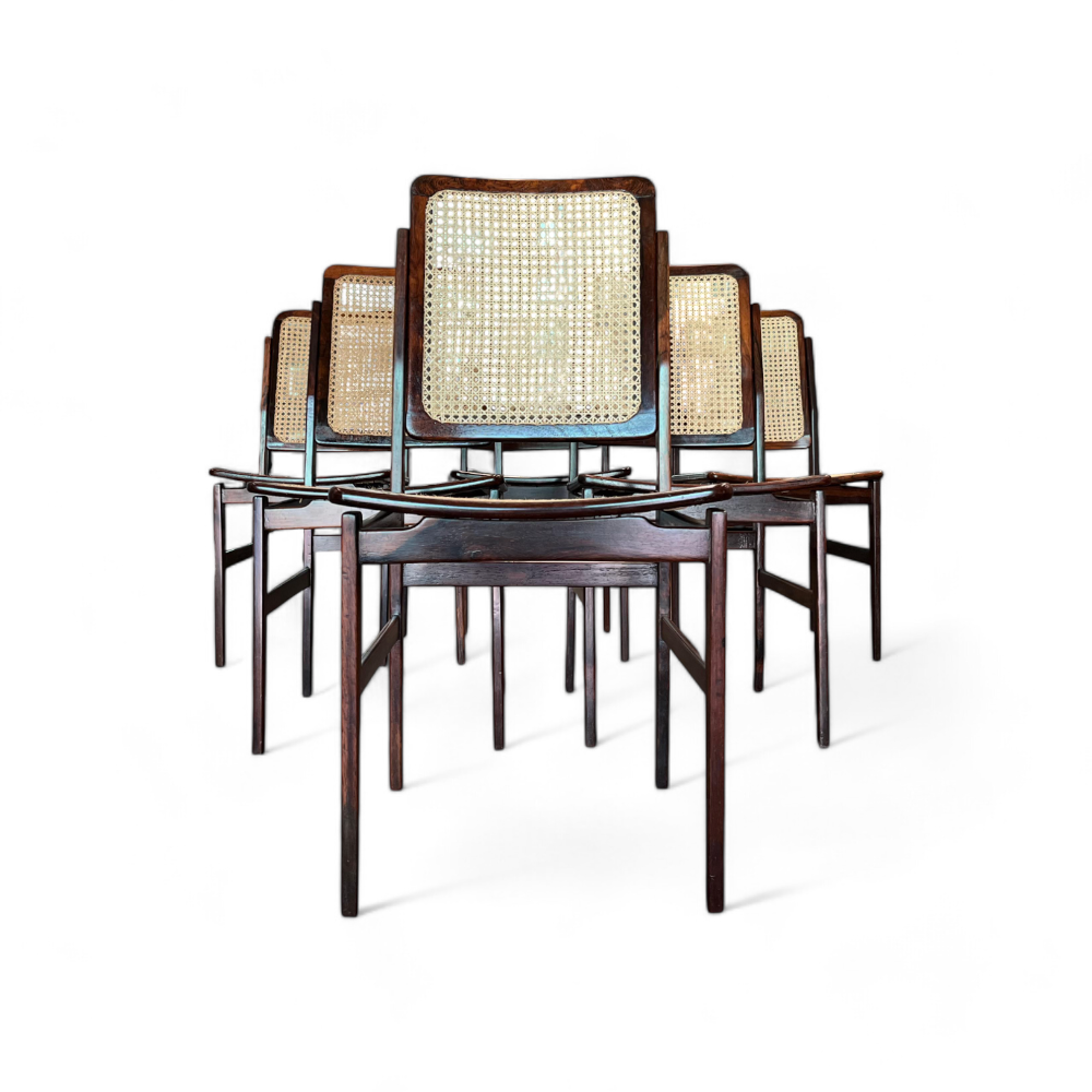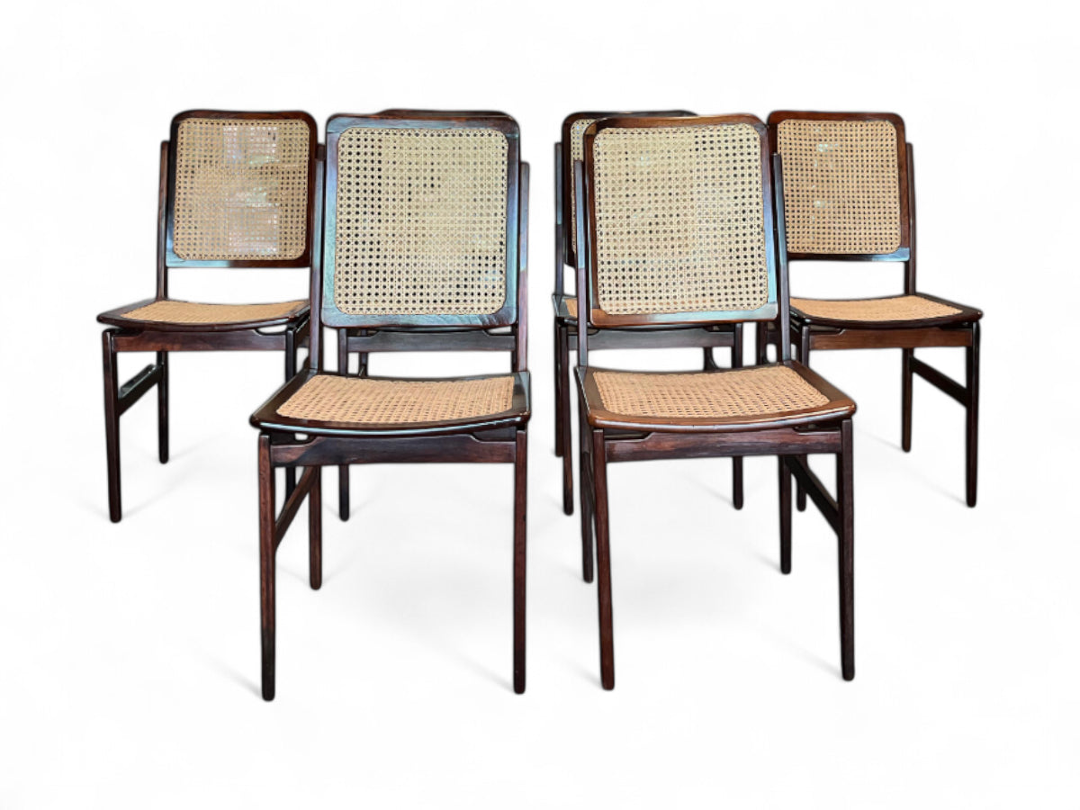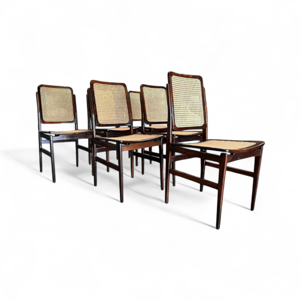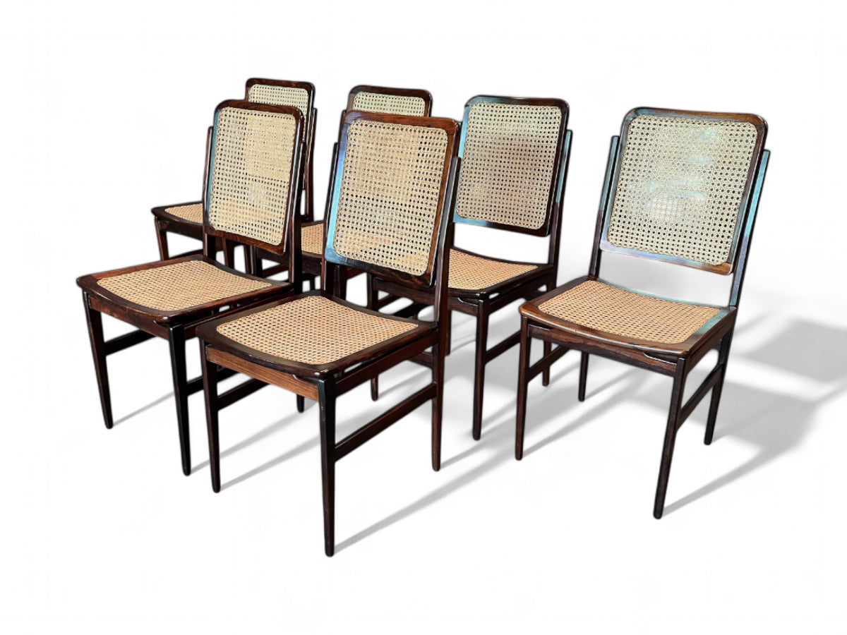 This set of six chairs were made in the 1960s and are entirely made in Brazilian Rosewood and caning. The seats are slightly curved with round edges making them extremely comfortable. The rosewood has been refinished and the caning is new