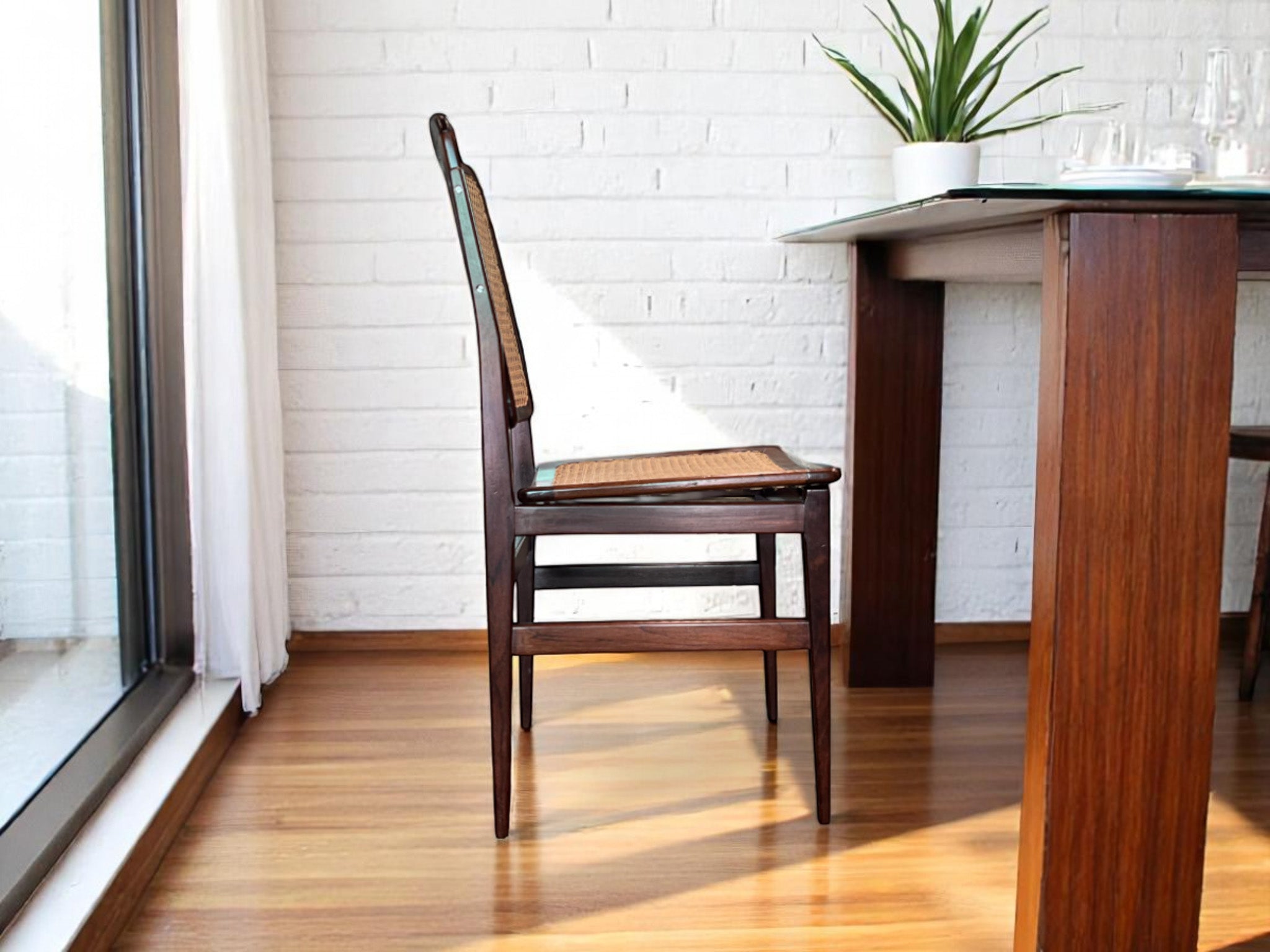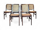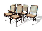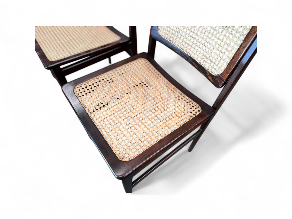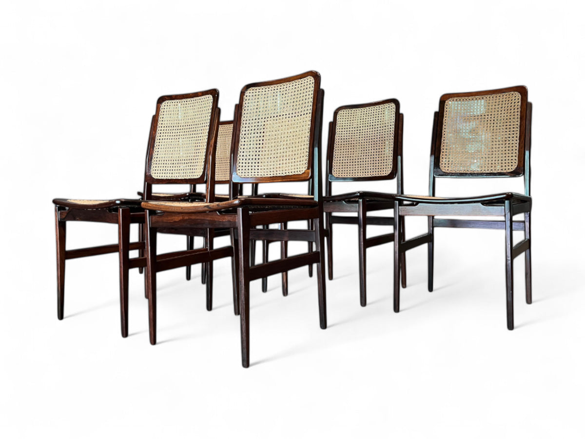 This set of six chairs were made in the 1960s and are entirely made in Brazilian Rosewood and caning. The seats are slightly curved with round edges making them extremely comfortable. The rosewood has been refinished and the caning is new