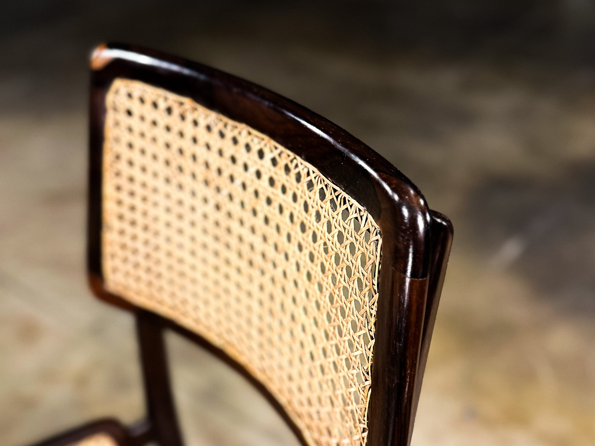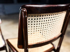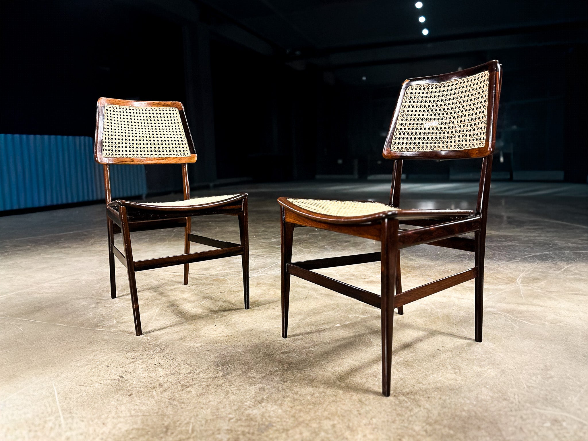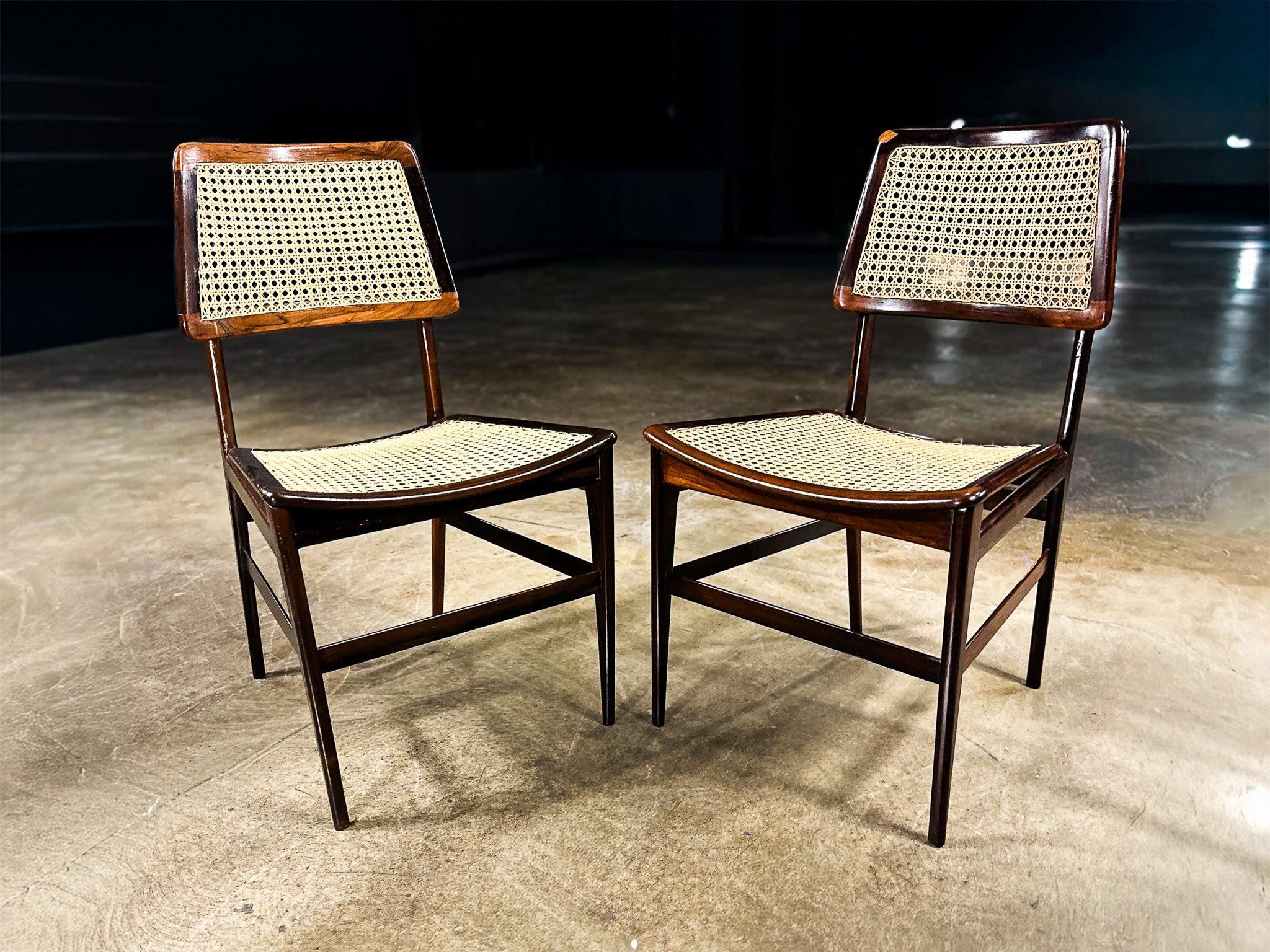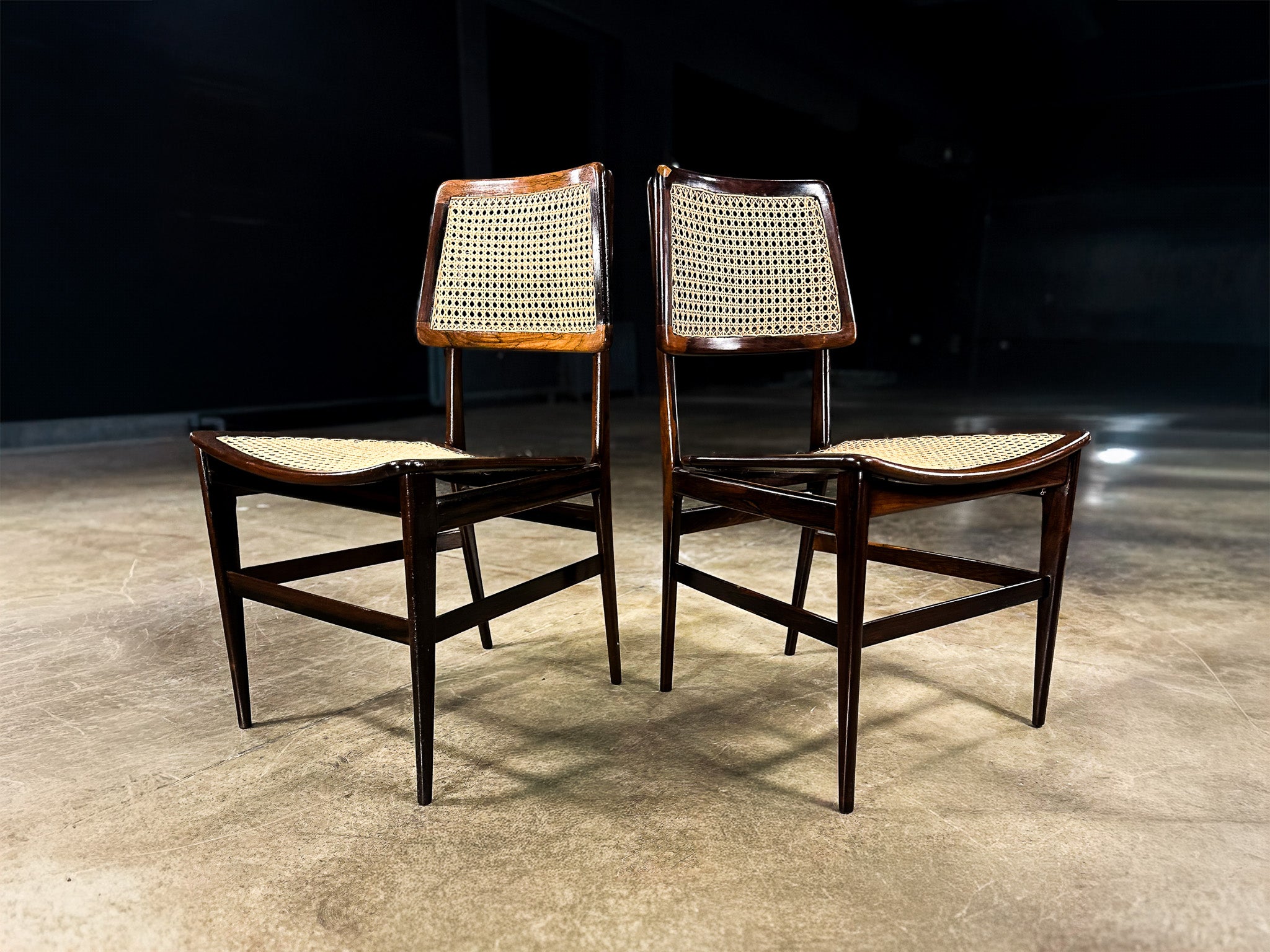 Crafted in Brazilian rosewood (jacarandá) with handwoven cane, the chairs reveal Tenreiro’s mastery of woodworking and proportion. The gently curved seat—subtly sculpted rather than upholstered—introduces ergonomic comfort while maintaining visual restraint. The cane backrests provide permeability and lightness, allowing air and light to pass through the structure, a recurring principle in Brazilian modern furniture inspired by the country’s climate and architectural ideals.