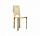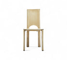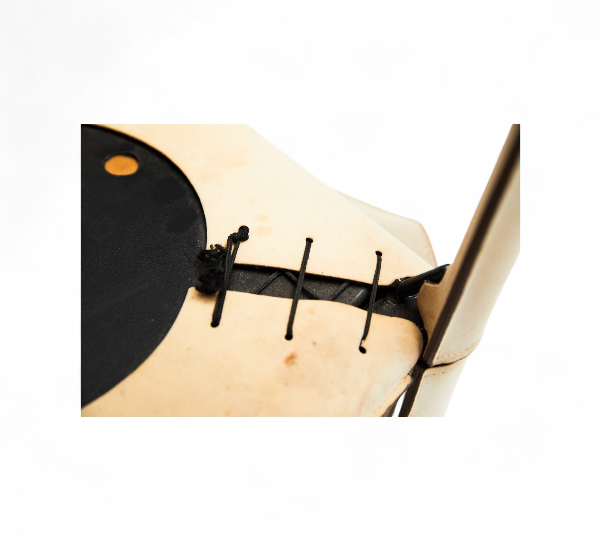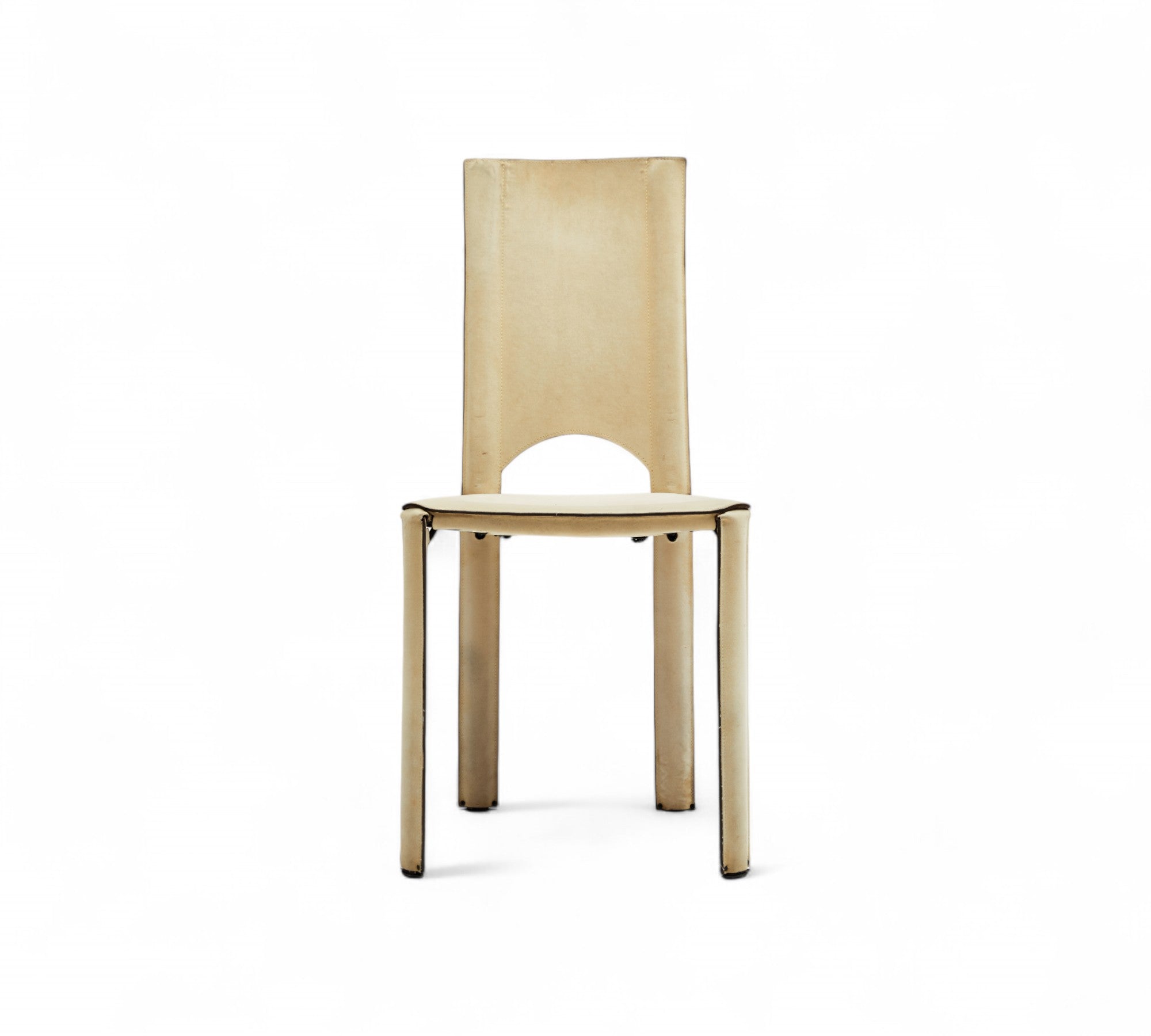 This set of four dining chairs, made with white leather, exudes stunning elegance. The upholstery is meticulously crafted with leathered parts, manually processed and sewn into a single piece, fitted snugly over a metal frame and closed with zippers. Mario Bellini aptly described these chairs as "a sewn leather dress mounted on the steel frame, stretched like skin over a skeleton, in a relationship of structural and organic symbiosis."