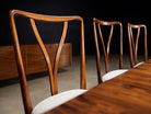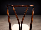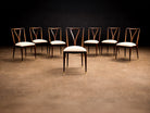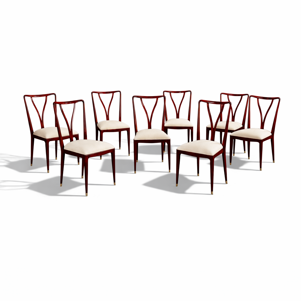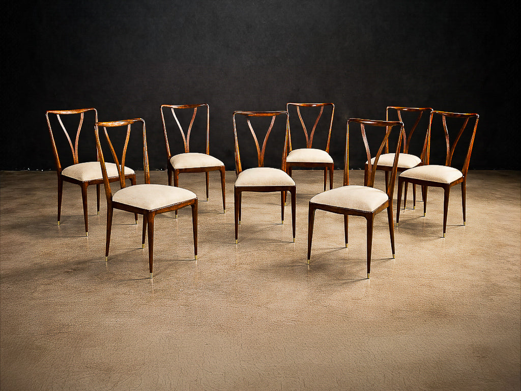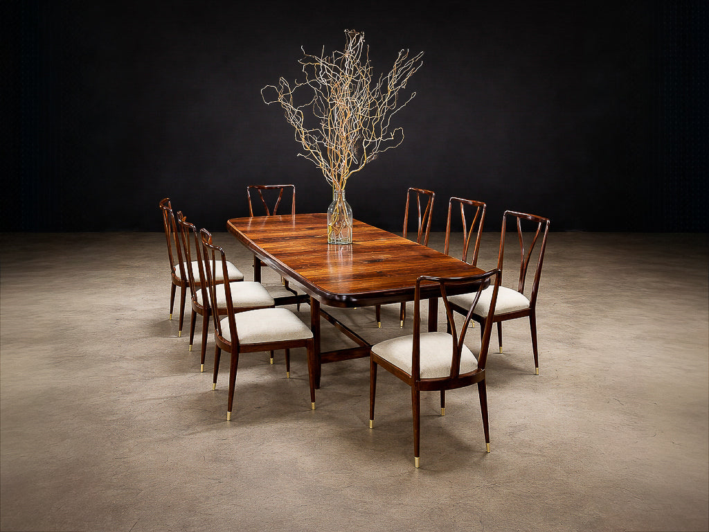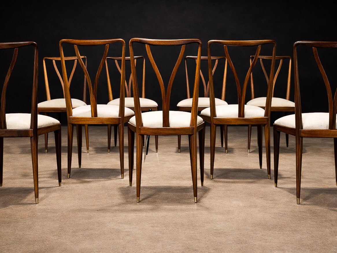 This elegant and highly sculptural set of eight dining chairs exemplifies the refined modernism of Giuseppe Scapinelli, one of the most expressive figures in Brazilian mid-century design. Crafted in richly grained Brazilian rosewood, the chairs reveal Scapinelli’s unmistakable command of curve, movement, and proportion, resulting in forms that feel at once poised and dynamic.