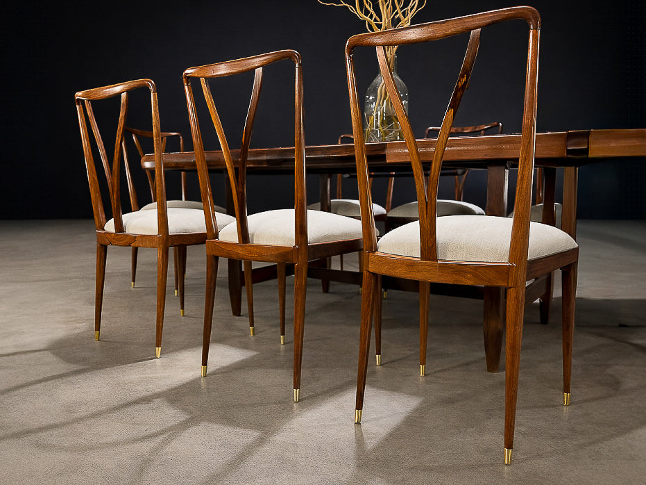 Originally sourced from a private residence in Brasília, Brazil’s modernist capital, this set carries a provenance closely aligned with the architectural ideals of the period. Both refined and expressive, these chairs are equally suited to a formal dining setting or a more relaxed, design-forward interior—offering enduring elegance, visual rhythm, and sculptural sophistication.