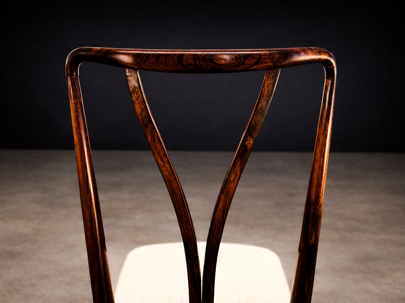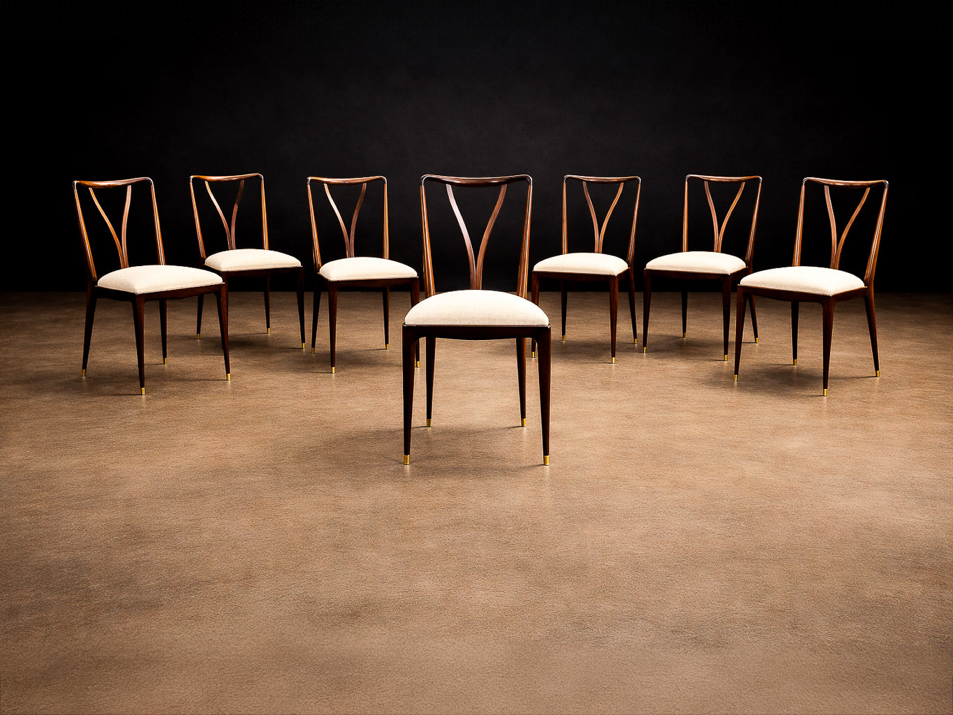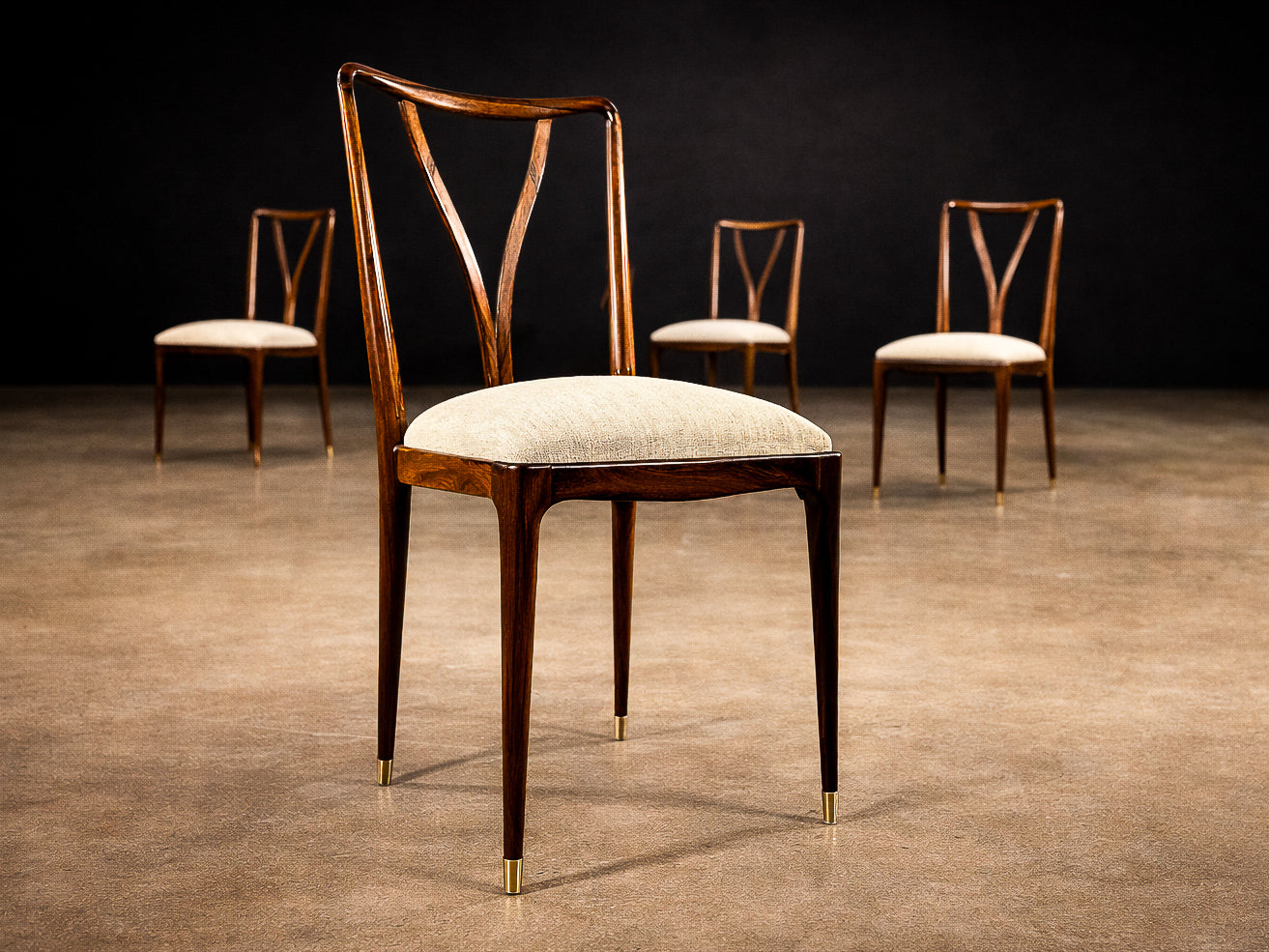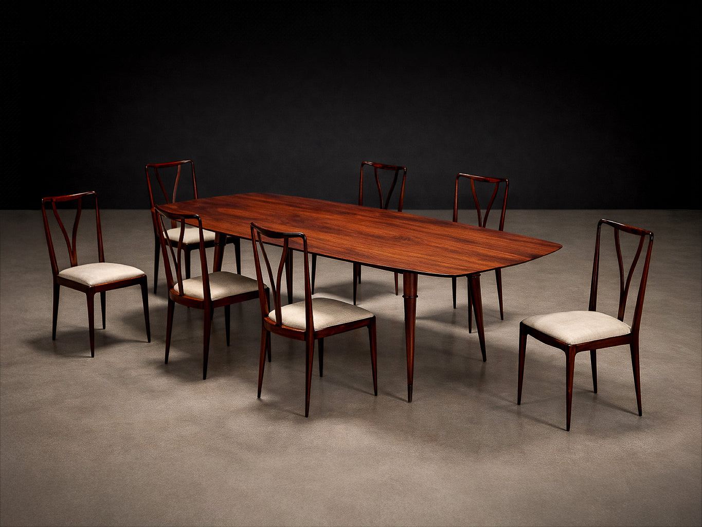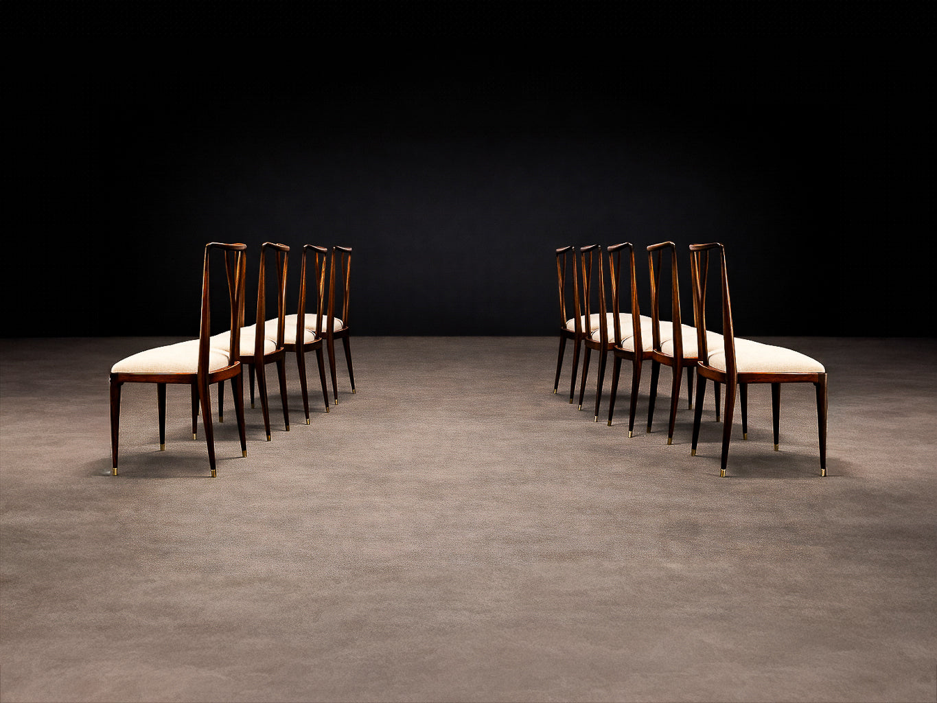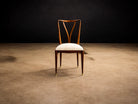 Each chair is defined by a tall, sinuously contoured backrest, where gently tapering vertical elements converge in a rhythmic, almost calligraphic gesture. These curves are not merely decorative; they create a sense of continuous motion, a hallmark of Scapinelli’s work, lending the chairs a sculptural presence even when viewed in stillness. The slender, subtly angled legs further enhance this sense of lightness and dynamism, giving the set an elegant, architectural stance.