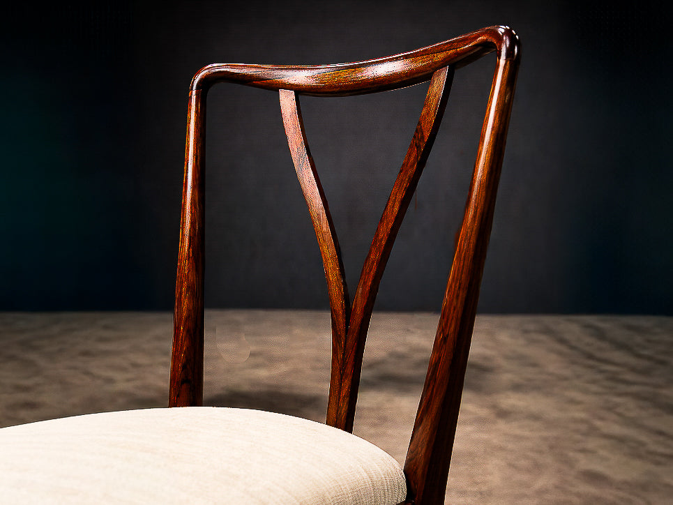 The rosewood frames have been expertly refinished and are in excellent condition, with beautifully preserved grain and tonal depth. The seats have been newly upholstered in a soft, textured linen, chosen to complement the fluid geometry of the wood while maintaining a restrained, timeless palette.
