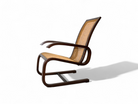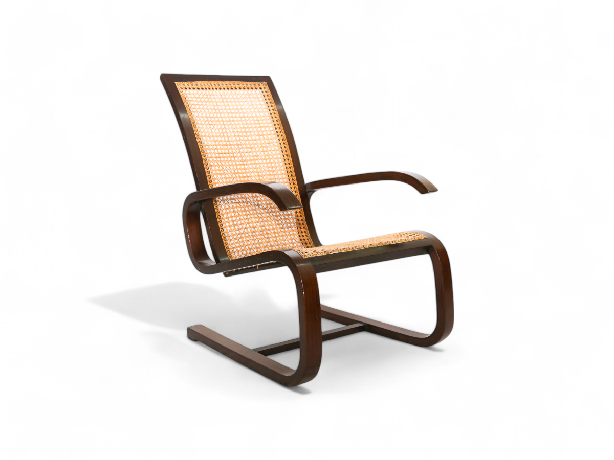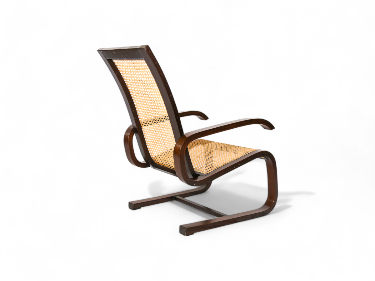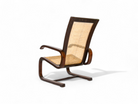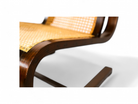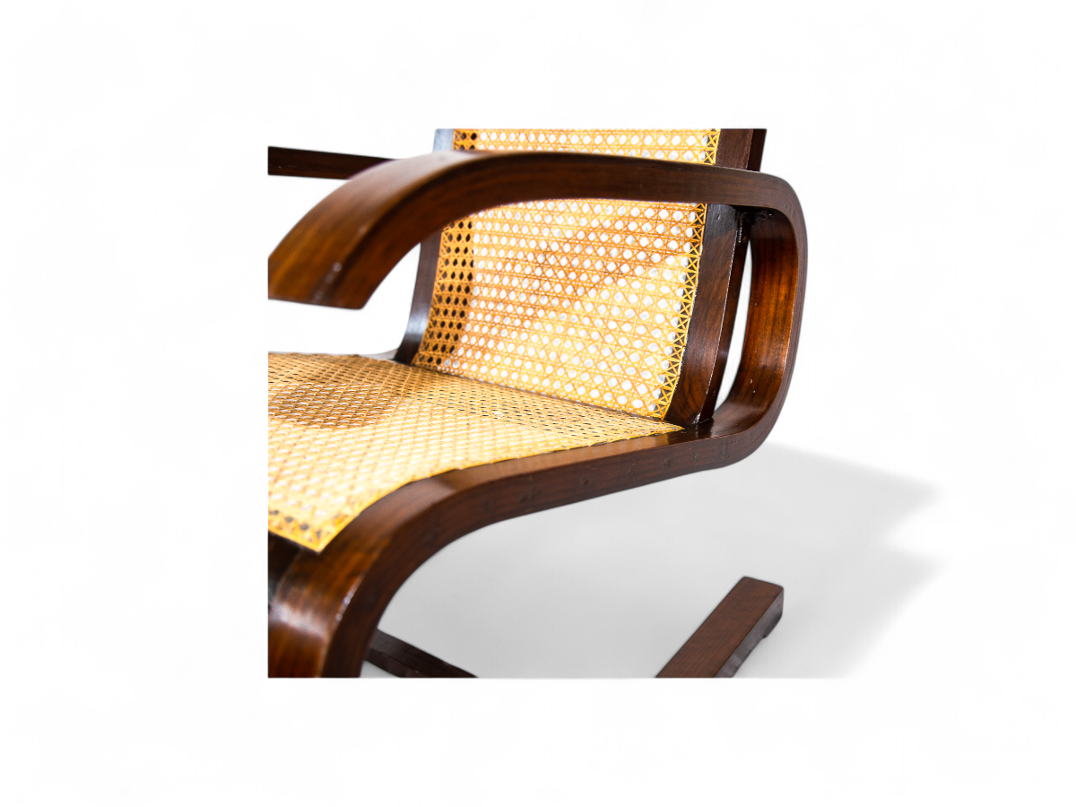 Crafted from Brazilian hardwood, the frame of this cantilever rocking chair features a distinctive design with a seat and backrest made from straw caning. What sets this chair apart is the method of attaching the straw caning to the wooden frame, showcasing a unique and artisanal craftsmanship.