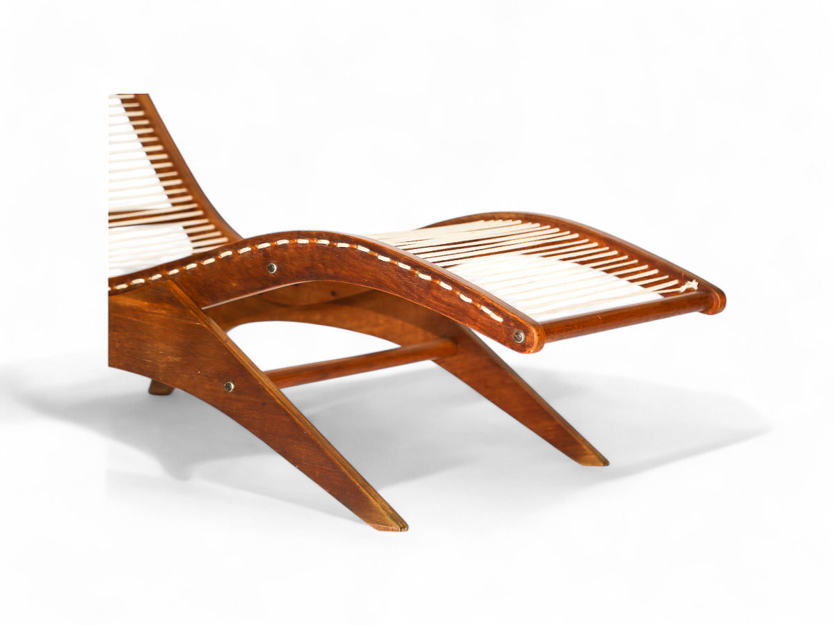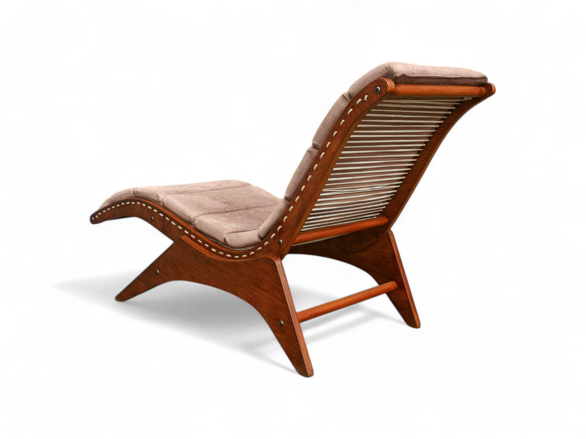 Designed in 1949 by José Zanine Caldas, this sleek chaise longe crafted from marine plywood exemplifies his early work. The removable pad features its original suede upholstery, resting atop a meticulously woven rope structure anchored to the plywood frame.