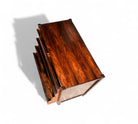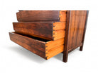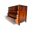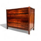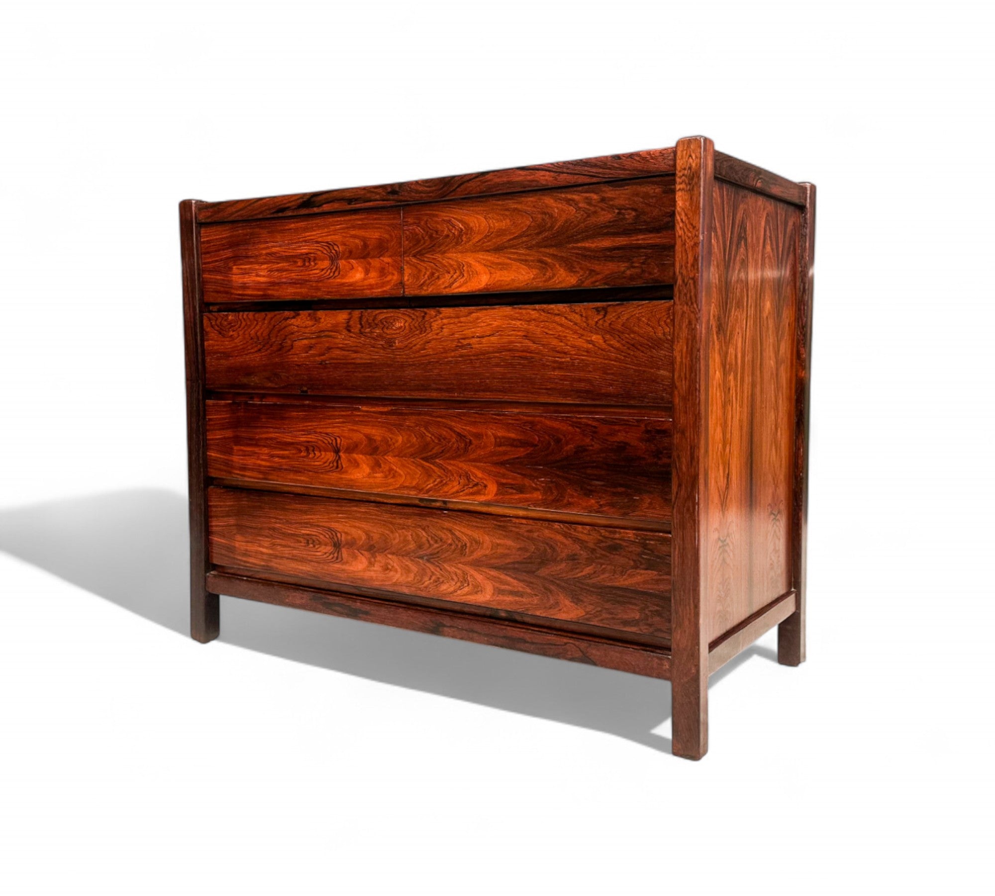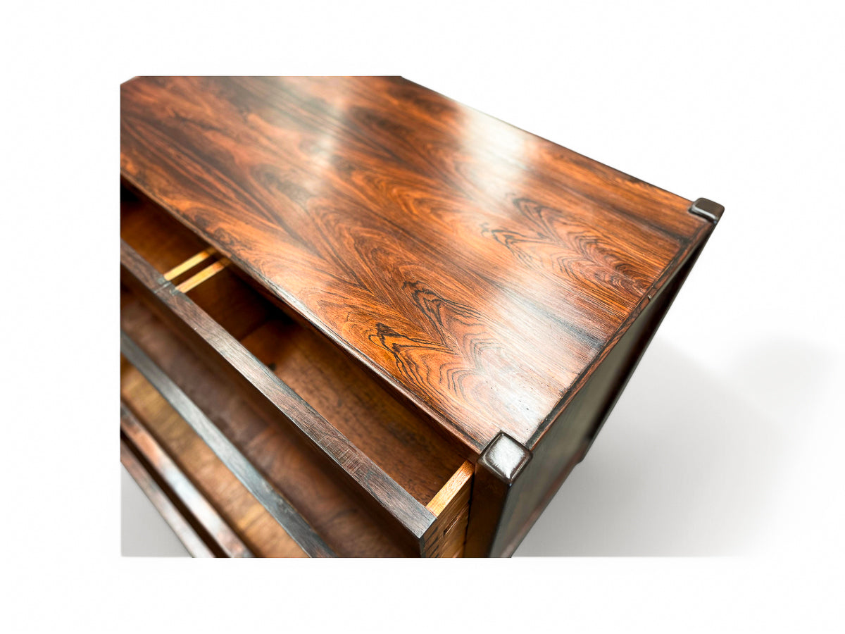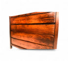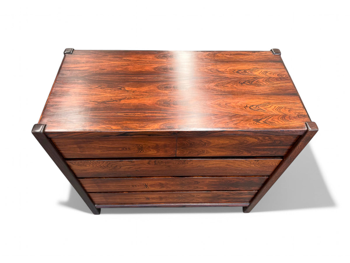 This chest of drawers is crafted from Brazilian Rosewood and boasts five pull-out drawers. The wood exhibits a beautiful color and pattern, having been refinished to ensure excellent condition. If you're seeking a Brazilian modern chest of drawers, this piece is an excellent choice.