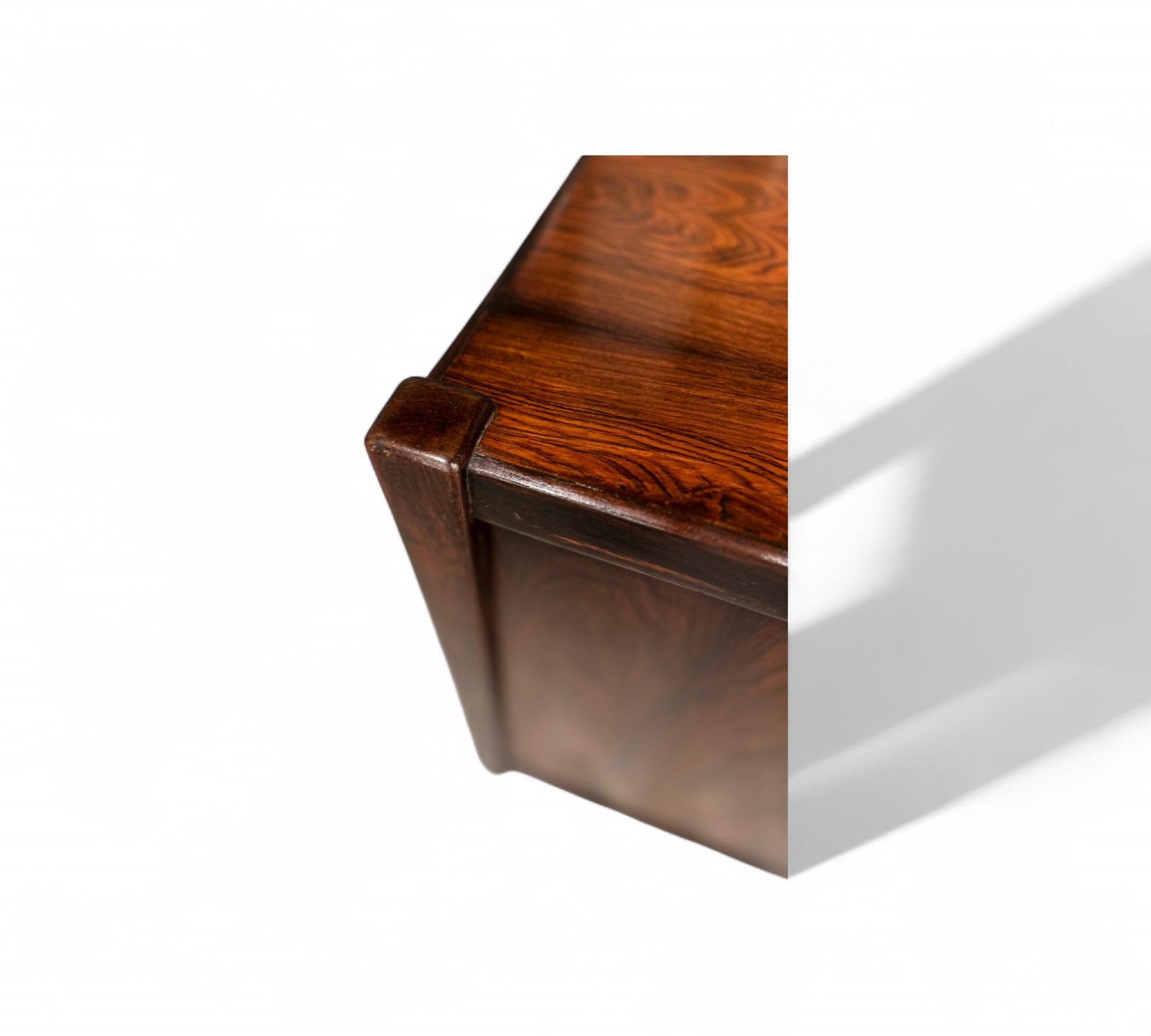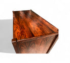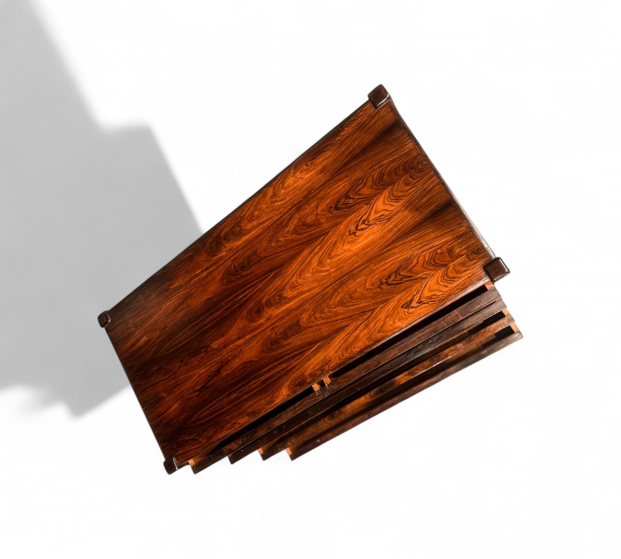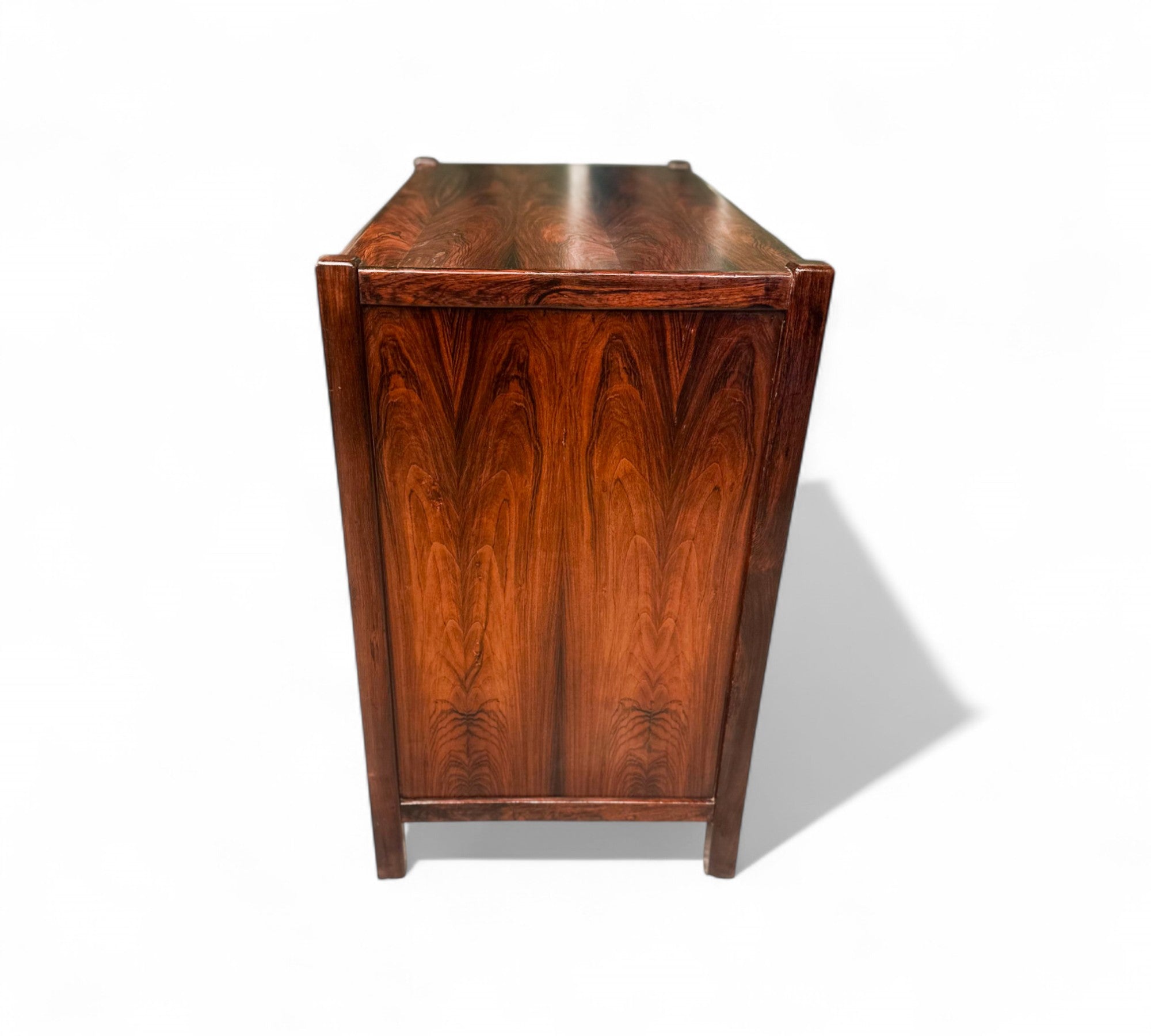 This chest of drawers is crafted from Brazilian Rosewood and boasts five pull-out drawers. The wood exhibits a beautiful color and pattern, having been refinished to ensure excellent condition. If you're seeking a Brazilian modern chest of drawers, this piece is an excellent choice.
