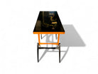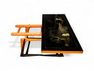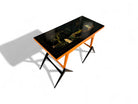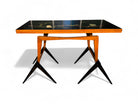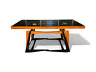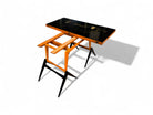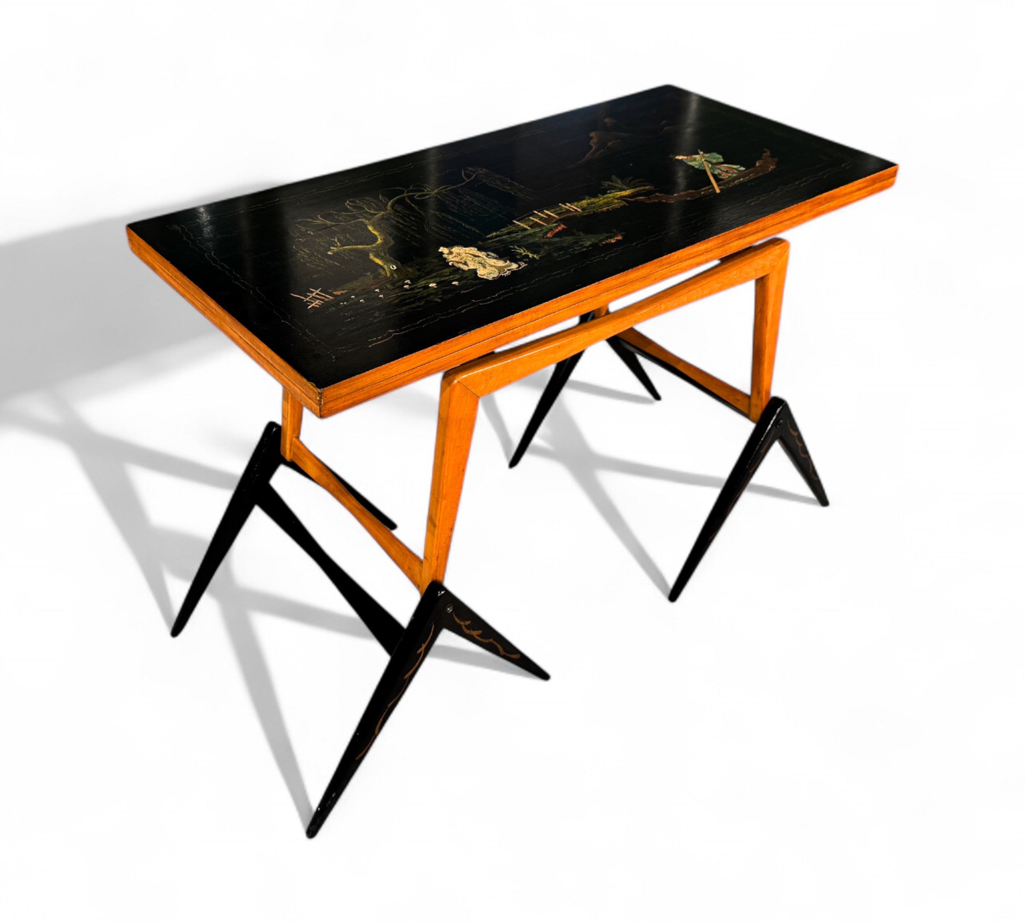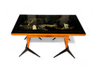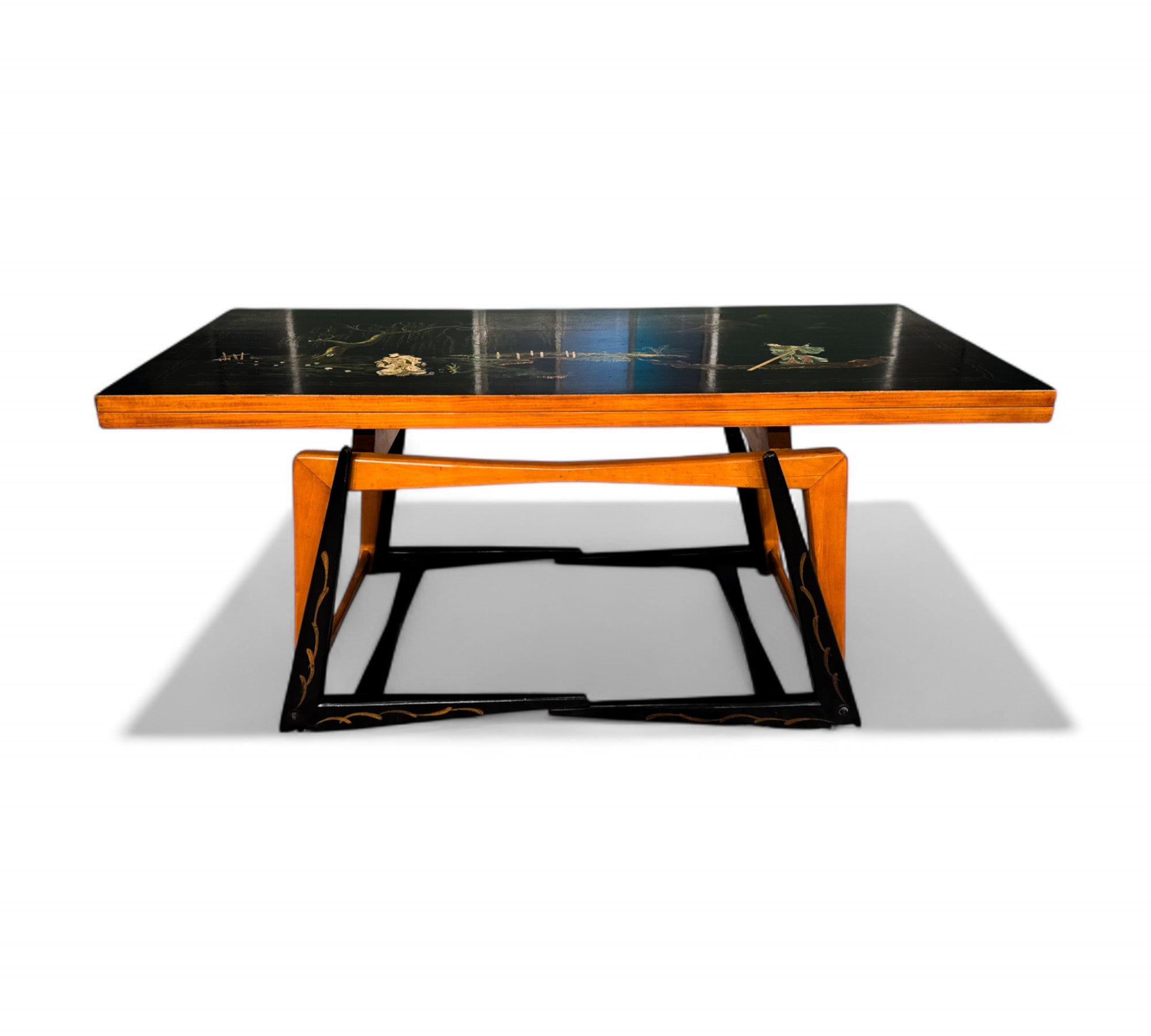 This stunning and functional three-in-one table was created by Moveis Circular in Brazil during the 1950s. It features a structure made in hardwood with a top with ebony finish with chinoiserie motive.This versatile piece serves as a table, sideboard, and coffee table- all combined into one elegant furniture item. It shows minor signs of use and retains the manufacturing seal.