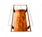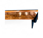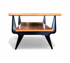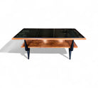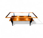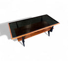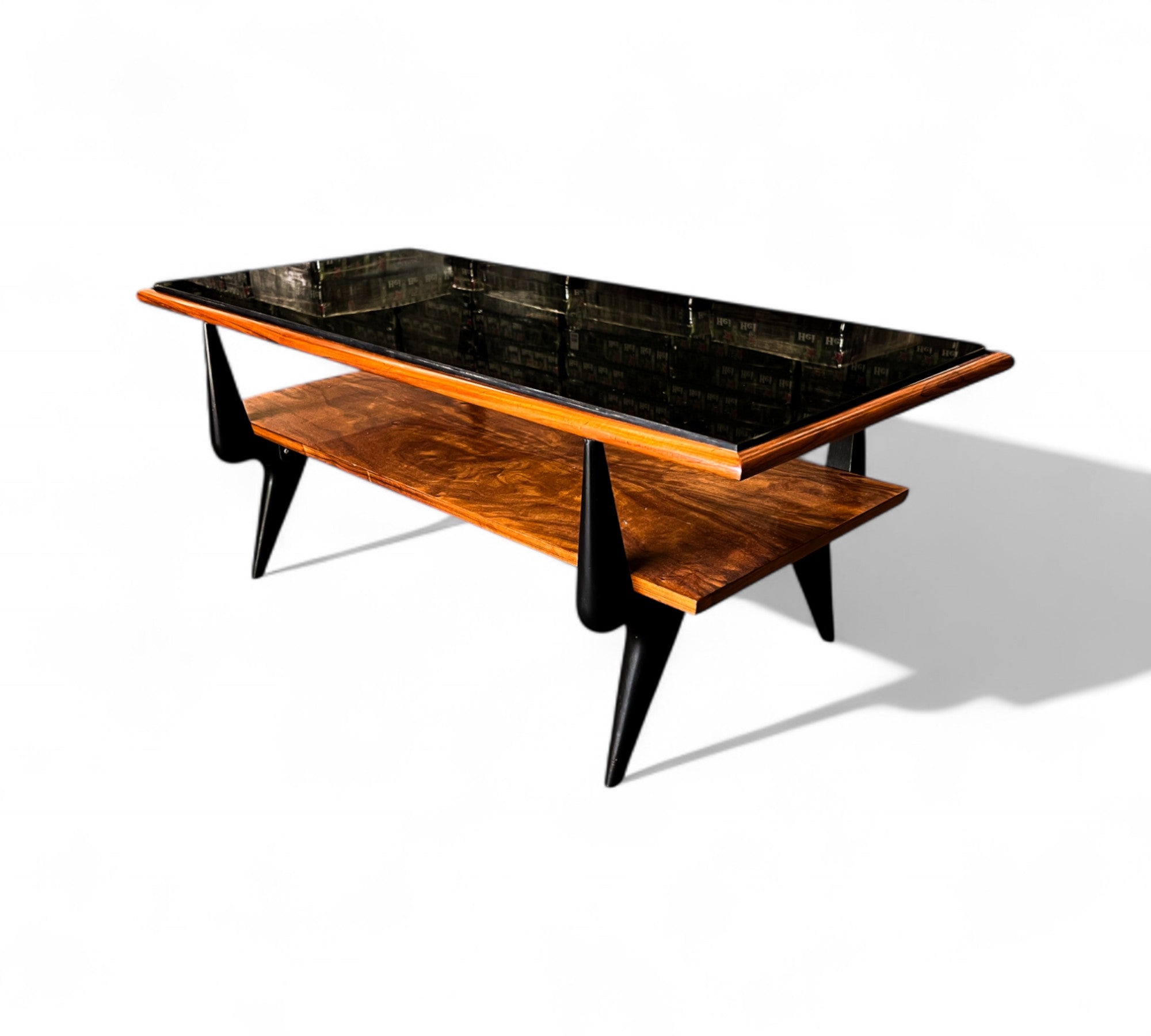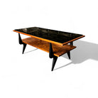 This coffee table features a bold frame made from Caviuna and Pau Marfim woods, topped with a sleek dark glass surface. Its rectangular shape includes two tiers and displays a striking wood grain pattern that adds character. The distinctive design is enhanced by stylish joints and black-painted legs, creating an eye-catching piece. The wood has been refinished and is in excellent condition, making this versatile item suitable for any home decor and capable of enhancing the charm of any living room. The manufacturing seal is located beneath the first tier.