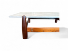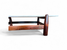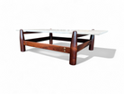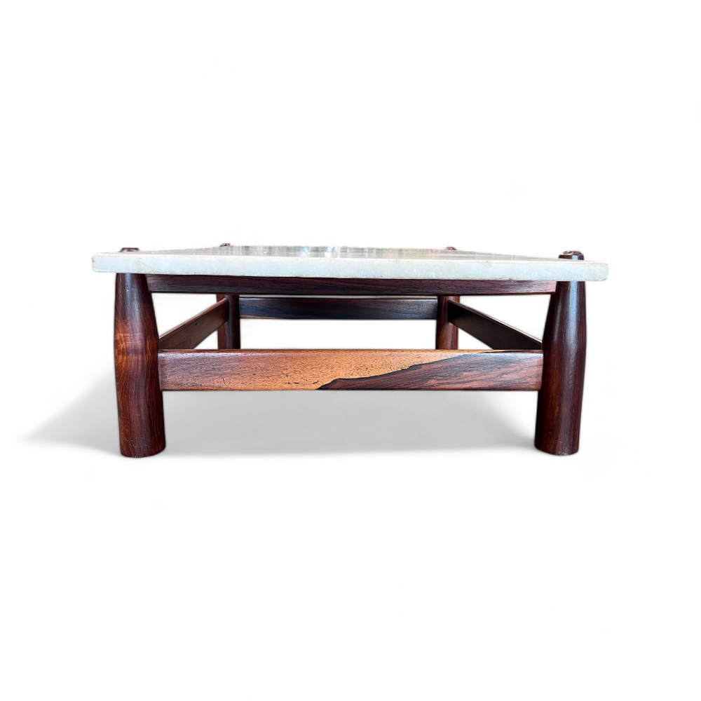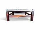 Add a touch of elegance to your space with this beautiful coffee table, crafted from exquisite Brazilian Rosewood, stunning marble top and delicate metal finishes. The table features four gracefully curved legs, connected by a sturdy beam, showcasing a design reminiscent of the iconic Brazilian style from the 1960s. The hardwood has been expertly refinished, ensuring its excellent condition, while the marble surface is also in good condition The unique shape of the legs, resembling bowling sticks, adds a distinct charm to this timeless piece.