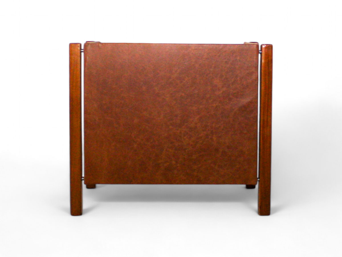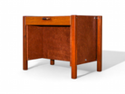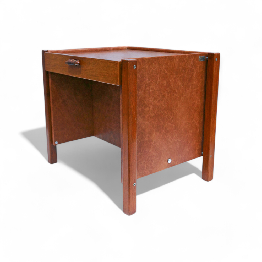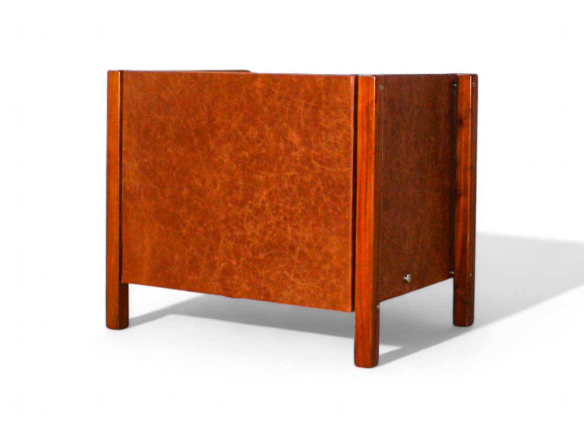 This unique cabinet is crafted from hardwood and features a single drawer for storage. Both the outer and inner surfaces are covered in leather, adding a touch of sophistication. An intriguing aspect of this piece is its provenance; it belonged to the Central Bank of Brazil and includes a patrimony plaque, highlighting its historical significance.