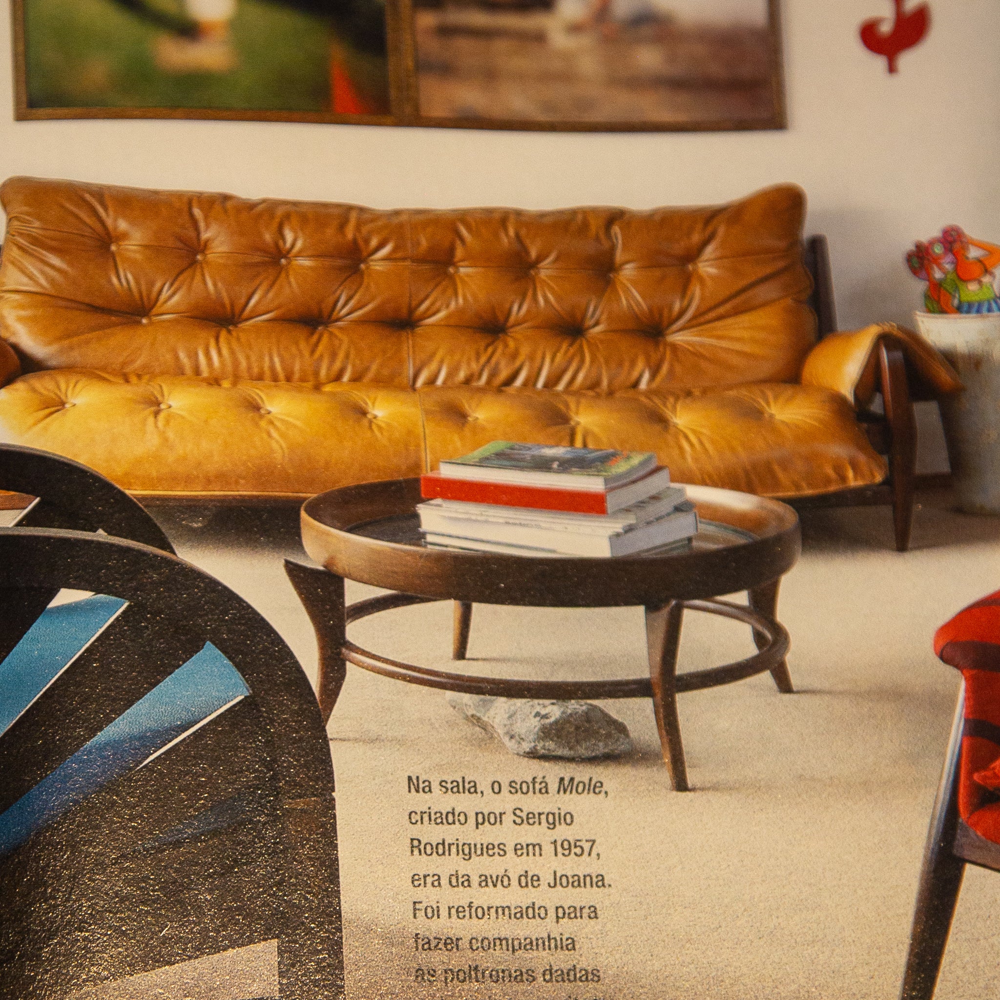 Giuseppe Scapinelli's iconic "Maracanã" coffee table draws its name from the famous soccer stadium in Rio de Janeiro constructed in 1950. Crafted from Brazilian rosewood, also known as jacaranda, the table features a travertine top. The circular wood base supports the travertine, creating a futuristic appearance when viewed from above. Four curved legs interconnect through a wood joint, ensuring sturdy construction. The wood of this piece has been meticulously refinished, resulting in excellent condition, ready to enhance any space with its timeless design.