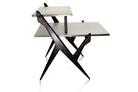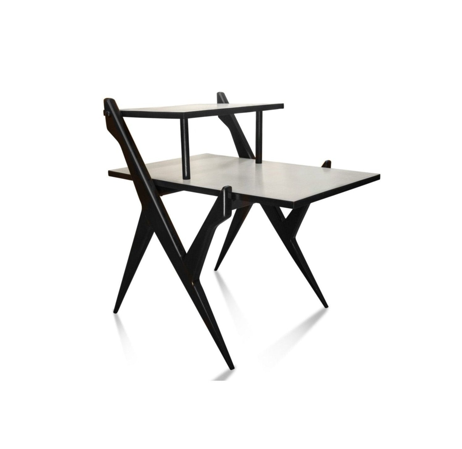 This Brazilian modern coffee table from the 1950s is crafted from pau marfim hardwood and features a gray formica tabletop. It boasts two tabletops supported by four toothpick legs. The wood has been expertly refinished, ensuring it is in excellent condition. The slim legs and unique design lend the table a sleek aesthetic, making it a versatile addition to any home decor.