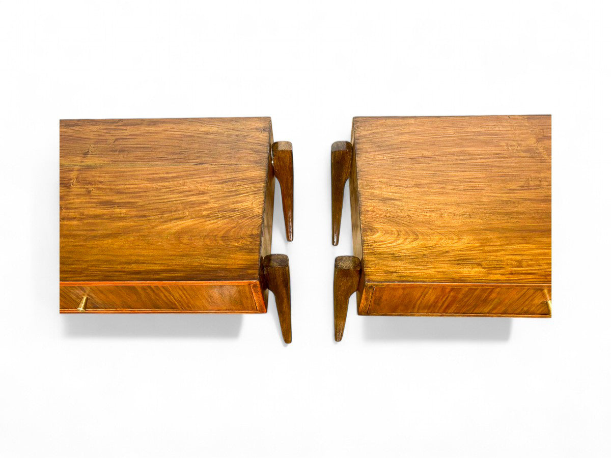 This awesome pair of nightstands, made in Brazil during the 1950s by an unknown designer, is crafted from Caviuna wood and features a single drawer with a brass knob. Each nightstand is supported by four elegantly sculpted legs. The refinished wood showcases beautiful, colorful veining, adding a touch of natural artistry to these timeless pieces.