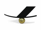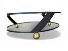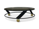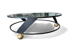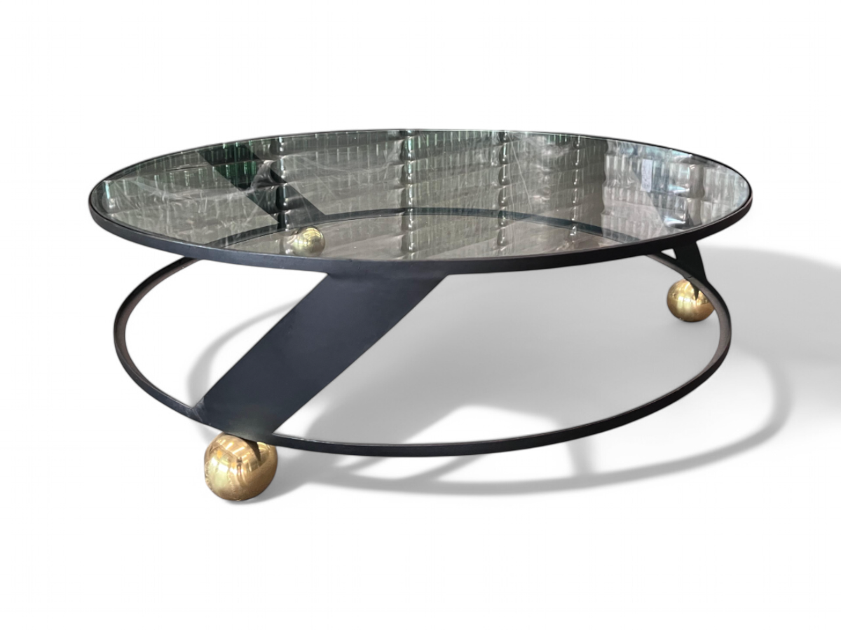This round coffee table is crafted from plated and painted metal with a new glass top. It features two levels: the upper level supporting the glass and a lower level that mirrors the circular shape. Connecting both levels are diagonal metal slabs, creating a sense of levity despite the table's size.