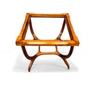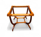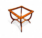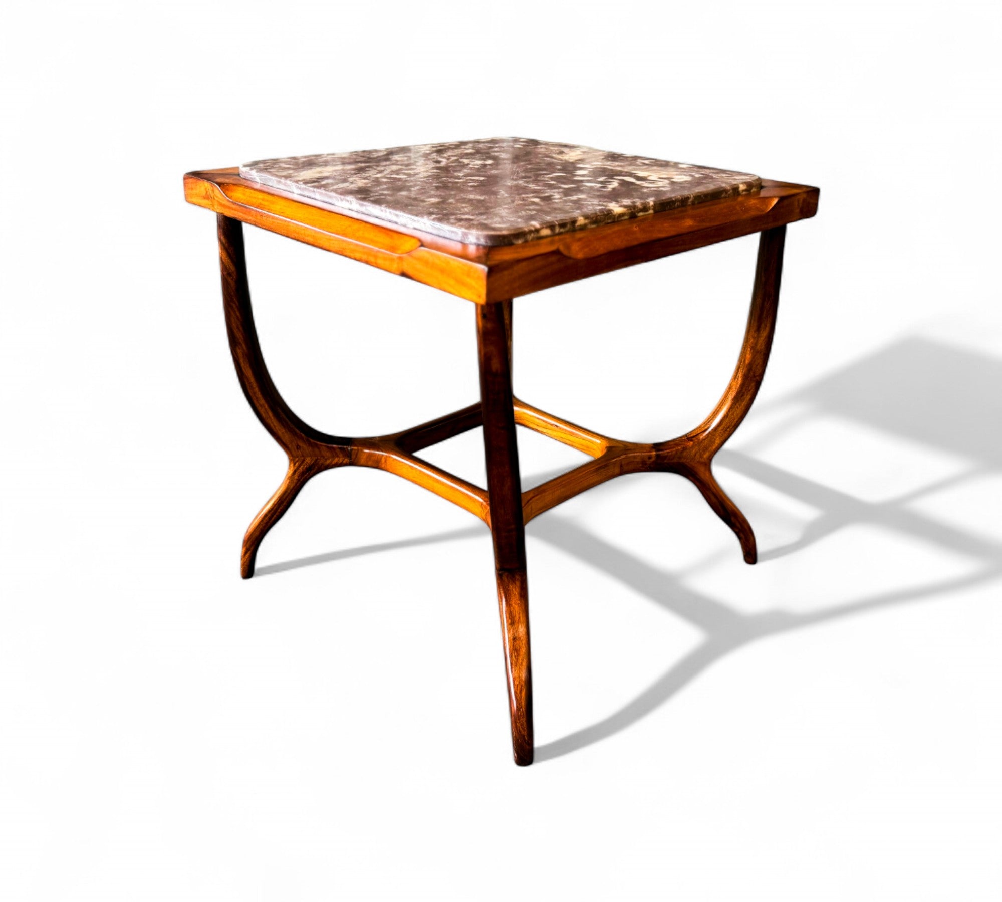 This sculptural mid-century side table showcases the elegance and craftsmanship of Brazilian design, featuring a solid Caviúna wood base paired with a striking purple marble top. The fluid, curved legs and central stretcher create a graceful, organic silhouette that highlights the natural beauty of the hardwood’s rich grain.