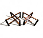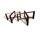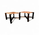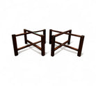 This elegant pair of side tables, crafted in Brazil in the 1960s, features a rosewood base with an X shape and four sturdy legs. The tops are adorned with stunning pink granite, which remains in excellent condition. The refinished wood highlights vibrant veining, bringing a natural artistic element to these classic pieces.