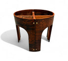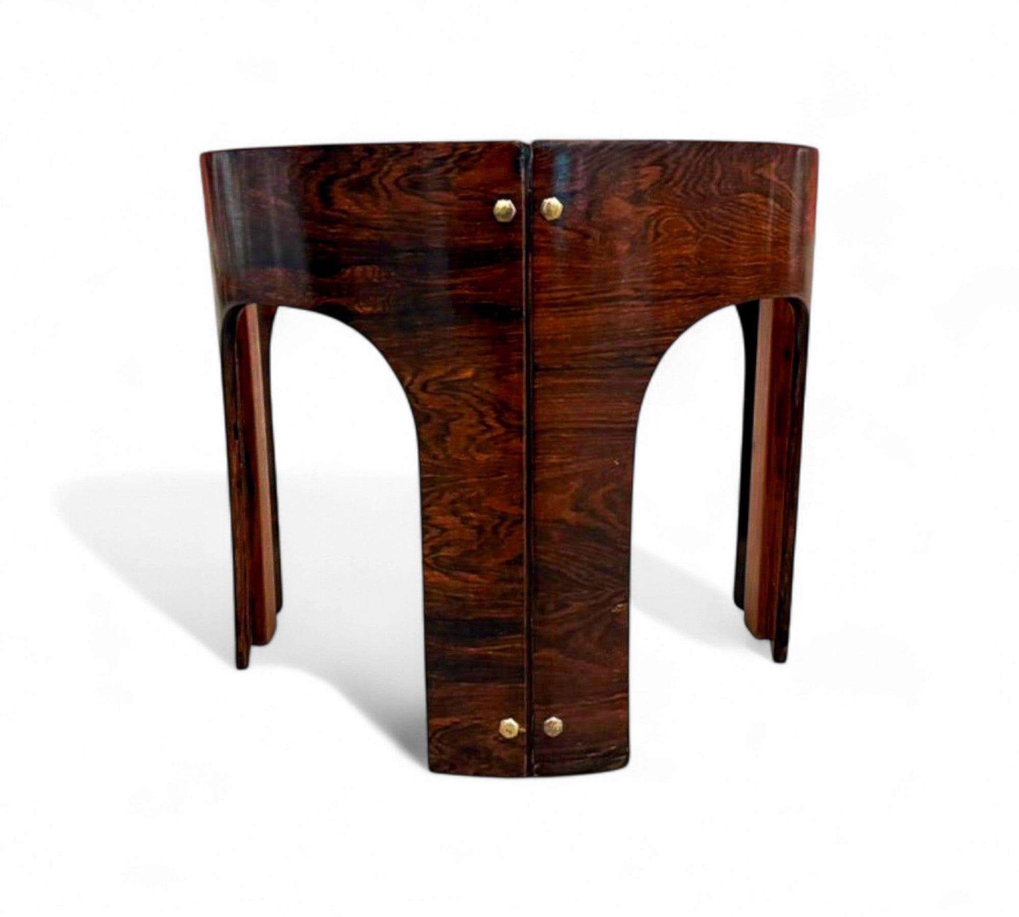 This sculptural 1960s side table by Bertomeu showcases the rich elegance of Brazilian rosewood, highlighted by its dramatic grain and warm tonal variation. The table’s distinctive arched legs and seamless curved form create a refined, architectural silhouette, accented by subtle brass details that enhance its mid-century character.
