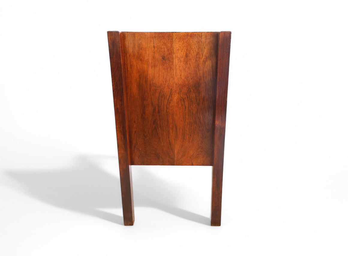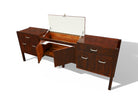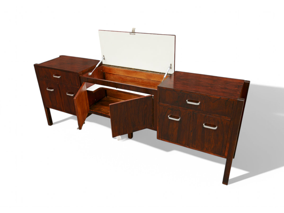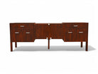 This credenza is crafted from Brazilian rosewood, also known as jacaranda, featuring seven drawers with metal handles. The design includes three pull-out drawers on both the right and left sides, with a lift-up chest-like drawer in the center. The drawers are particularly tall and deep drawers making it very convenient for storage.