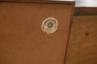 The wood has been expertly refinished and is in excellent condition, showcasing its natural beauty. The manufacturing label is visible on the back of the piece, confirming its authenticity.