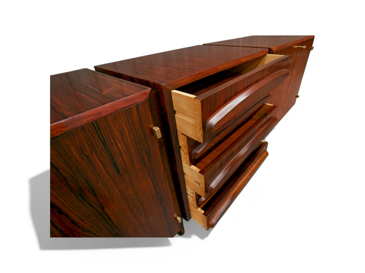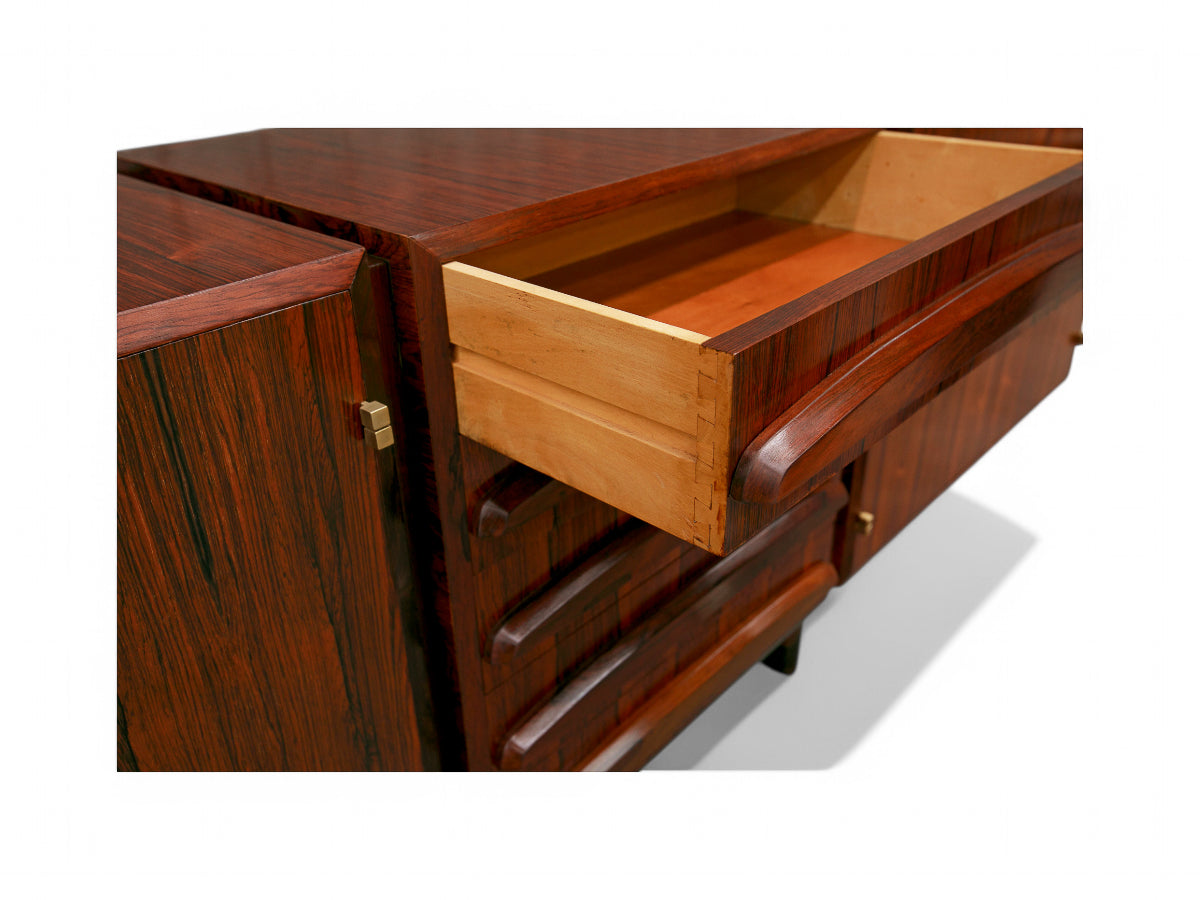 What sets this credenza apart is its exceptional craftsmanship tailored for a prestigious private residence in São Paulo. The impeccable joints, intricate wood carving, and gracefully smooth curves found in the drawers, along with the discreet toothpick support legs, attest to its superior finishing.The Jacaranda wood used in this piece is of the highest quality, characterized by its exquisite wood veins, rich grain, and overall seamless finish. This premium material showcases the credenza's elegance and durability.