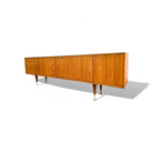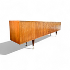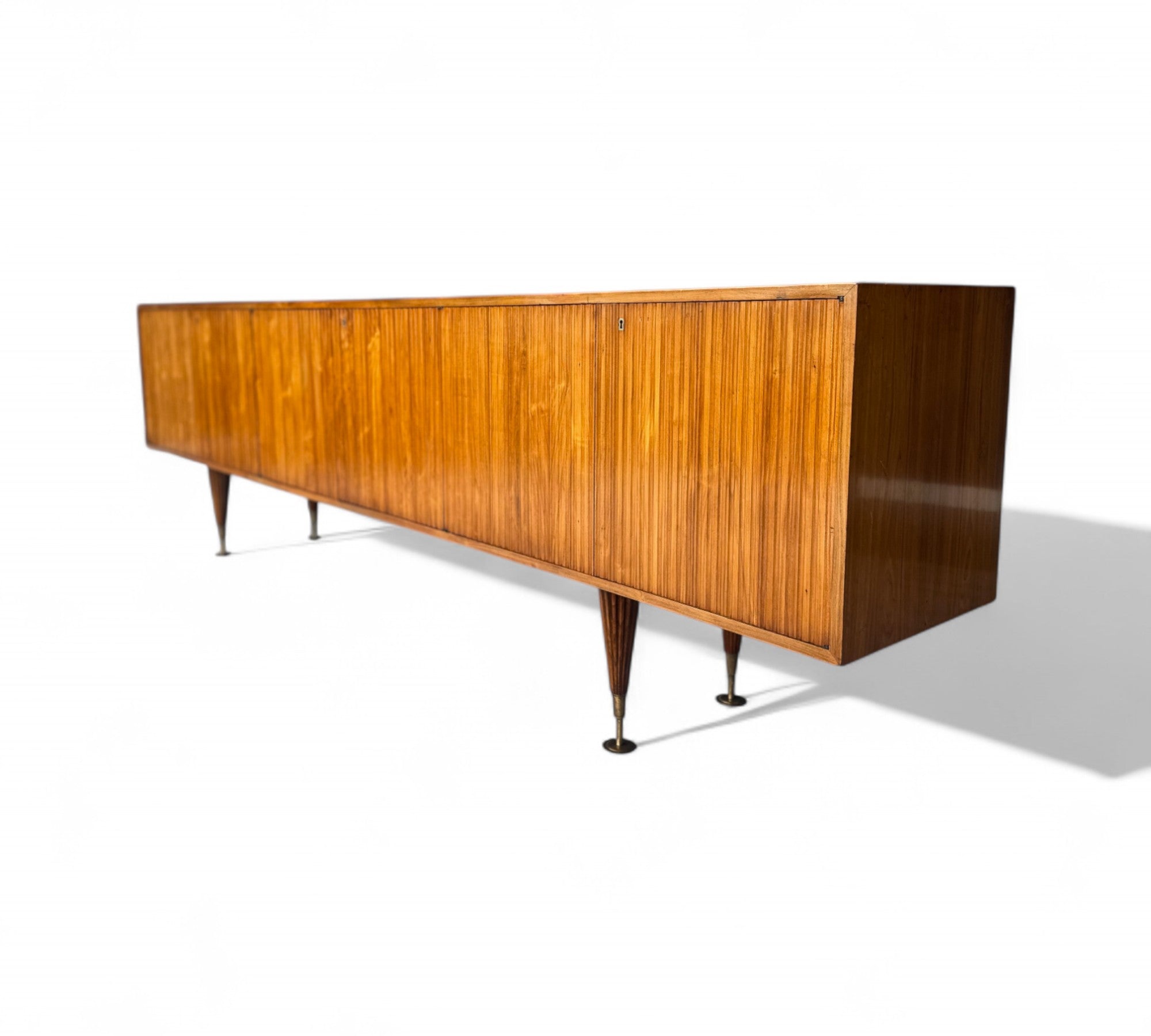 This one of a kind reeded credenza was designed by Giuseppe Scapinelli in the 1950s. It is made with Caviuna wood and features four tapered legs, six doors, and eight shelves. The wood has a beautiful and rich tone with stunning natural wood grain. In addition, the wood has been refinished and is in excellent condition. The credenza has a clean and sleek design to it and can be styled into any type of home. If you are looking for a Brazilian modern and shop stopper addition to your home, this is a great option.